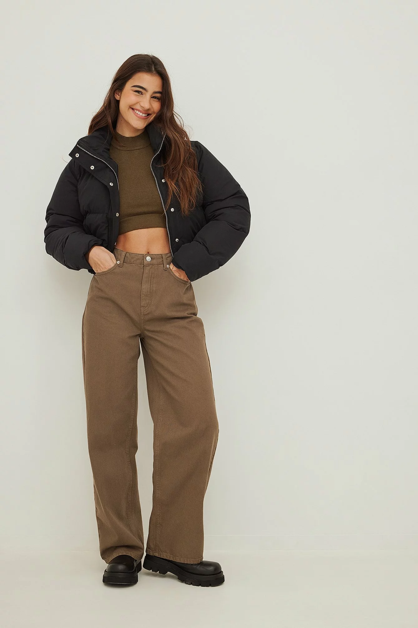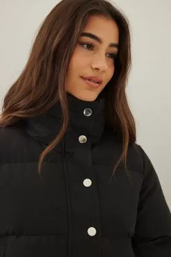 This jacket features a high neck, a zipper closure down the front with buttons, side pockets, cropped length and a warm, padded material.
