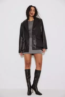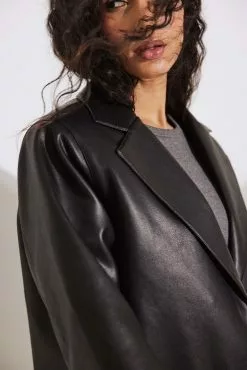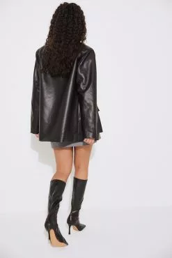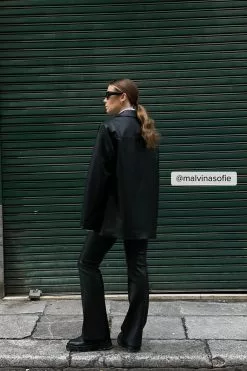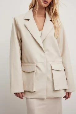 This jacket is oversized and features a material in PU and a classic collar. It has slightly padded shoulders, a snap button closure and a flap pocket with a snap button.