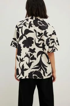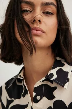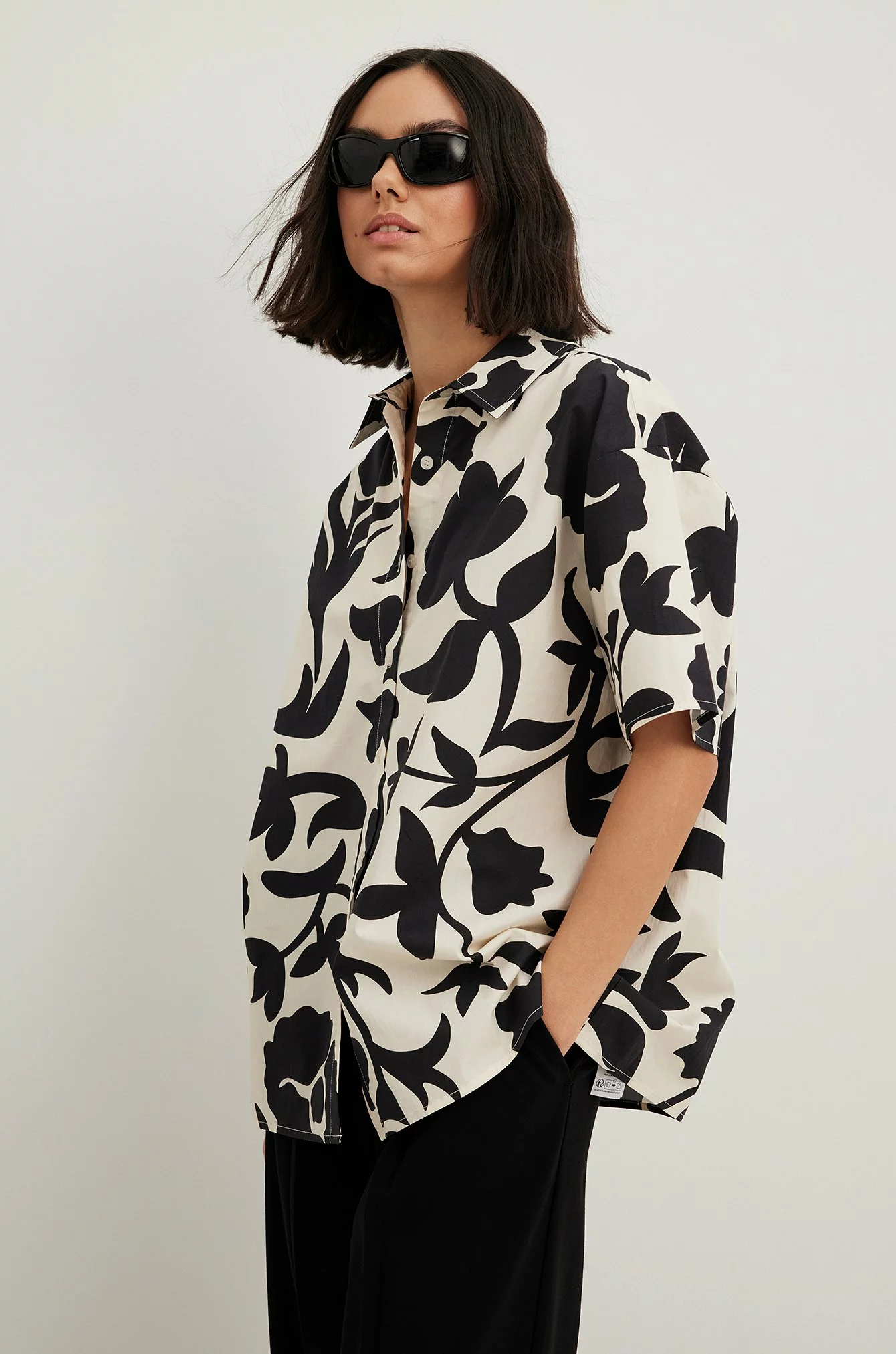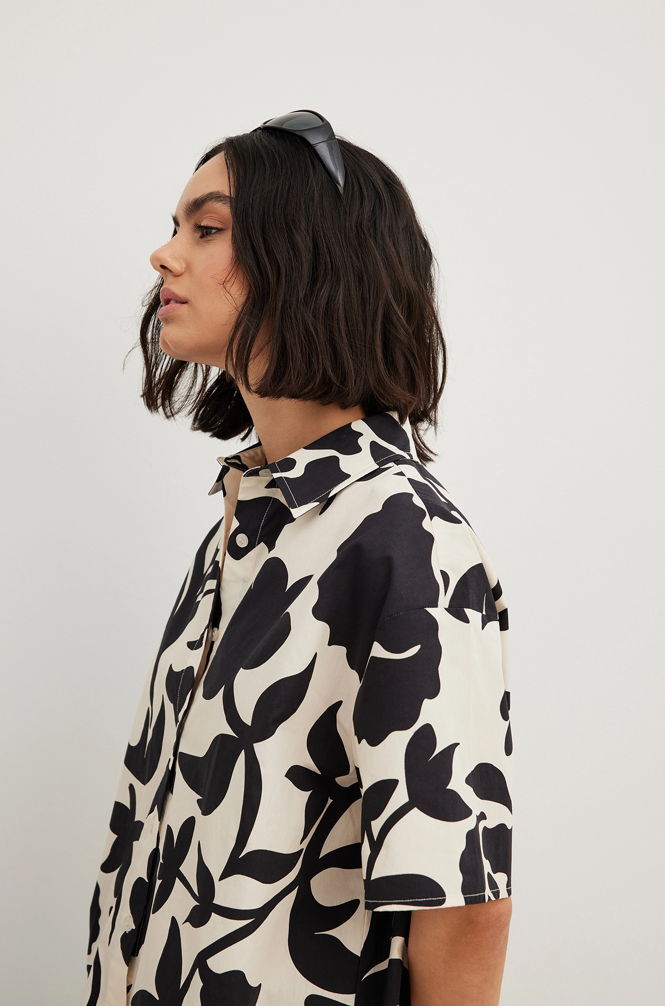 This shirt is structured and features an oversized fit. It has a classic collar and short sleeves. This shirt features a button closure down the front.