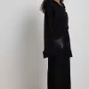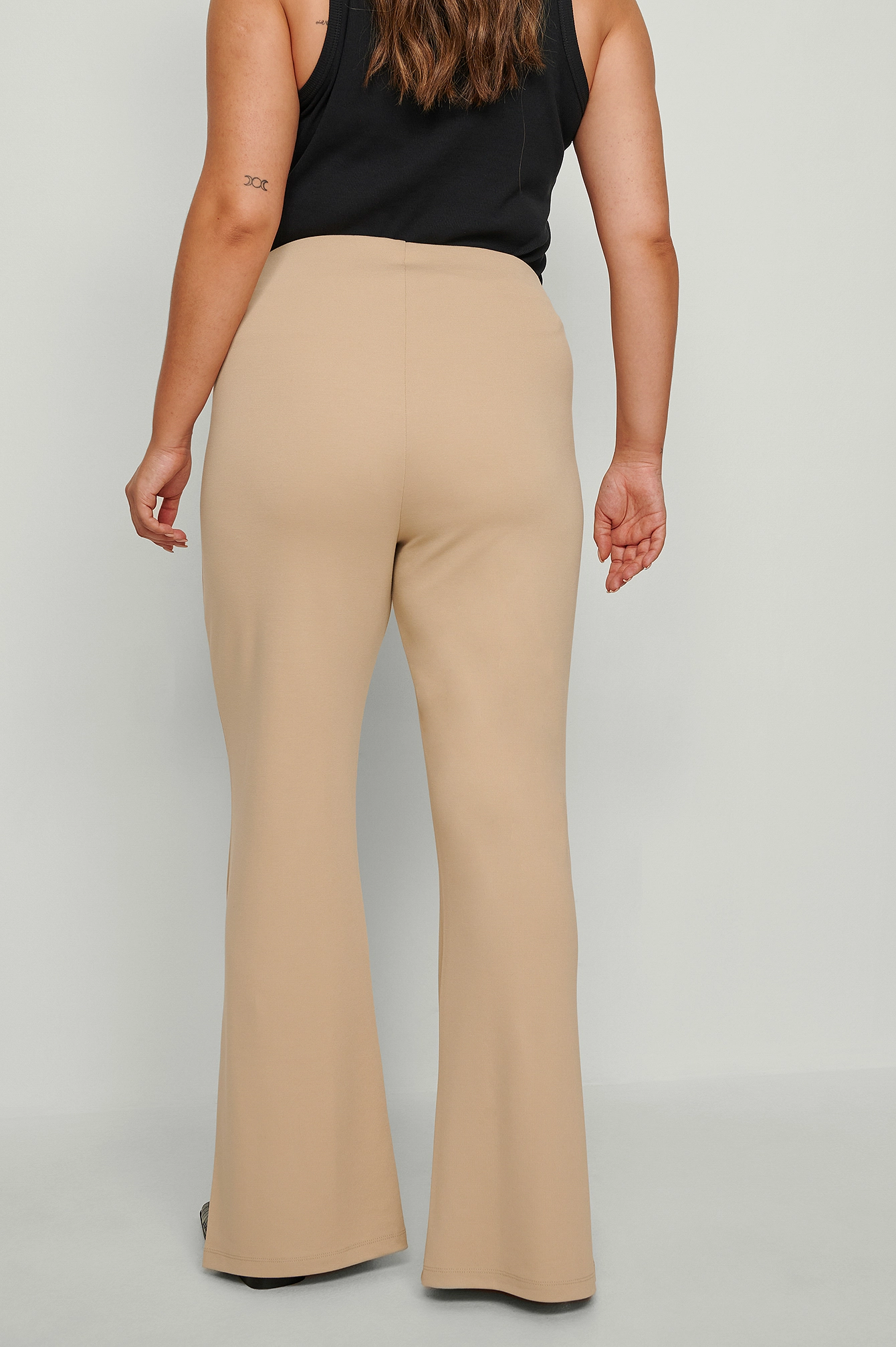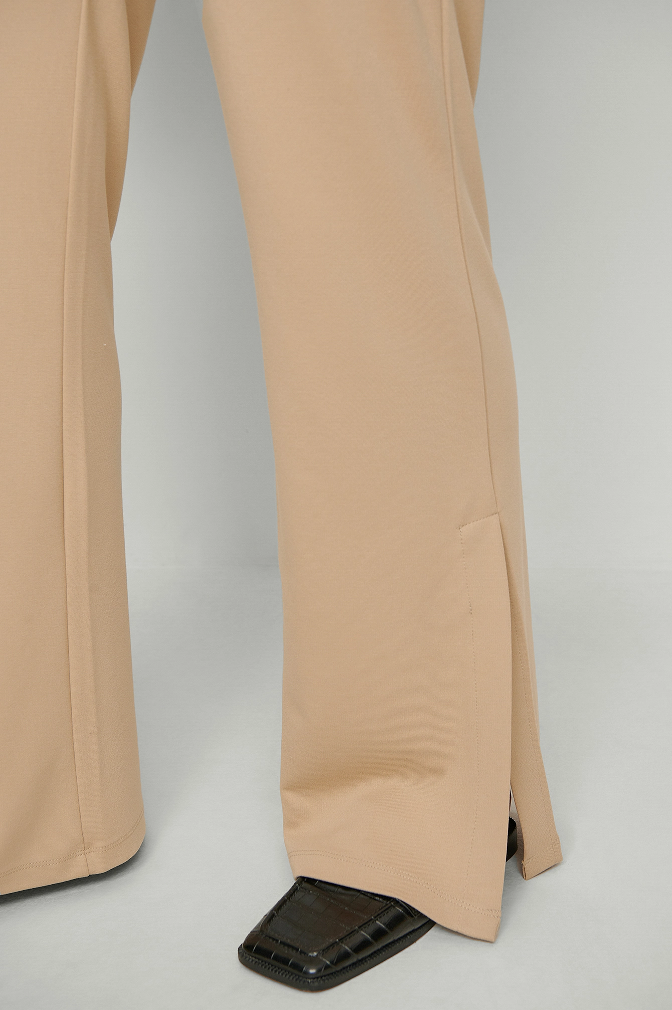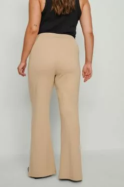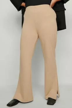 These wide leg trousers feature an elasticized waistband. They have an ankle slit.