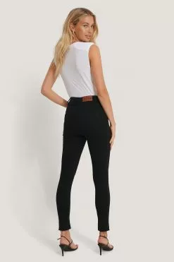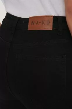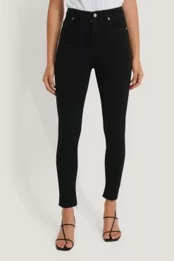 The Skinny High Waist Open Hem Jeans by NA-KD features slim and stretchy fit, a high waist, a five-pocket design, raw hems, and a zipper and button closure.