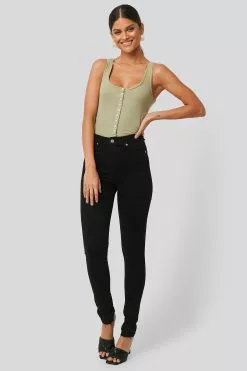 These jeans are skinny and feature a high waist, a zip and button closure, belt loops, five pockets, a brand logo at the back and raw hems.