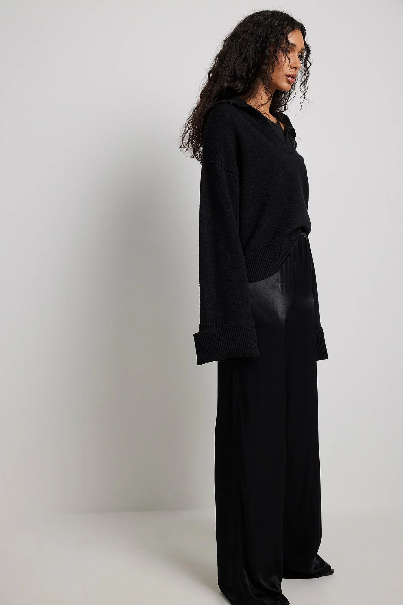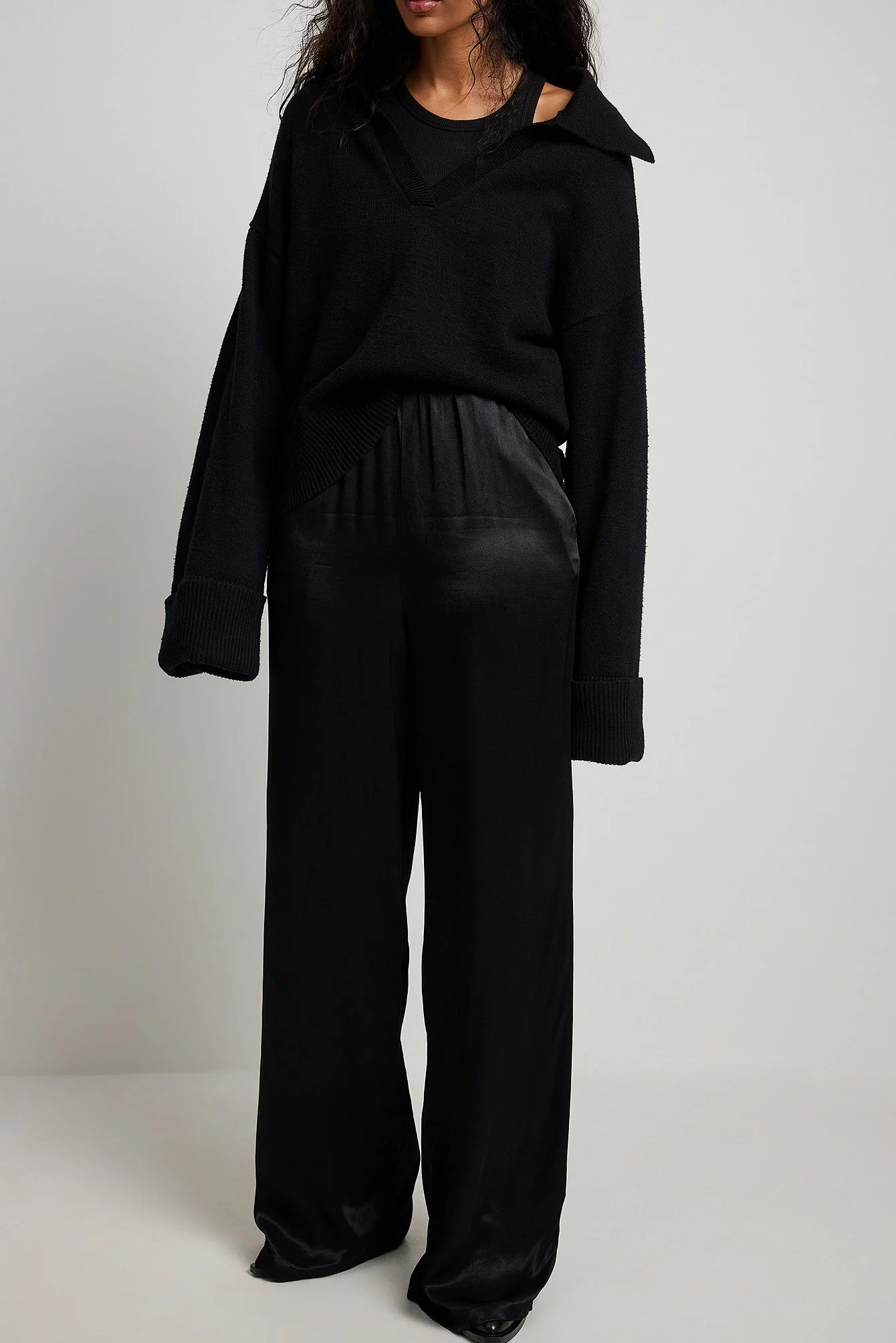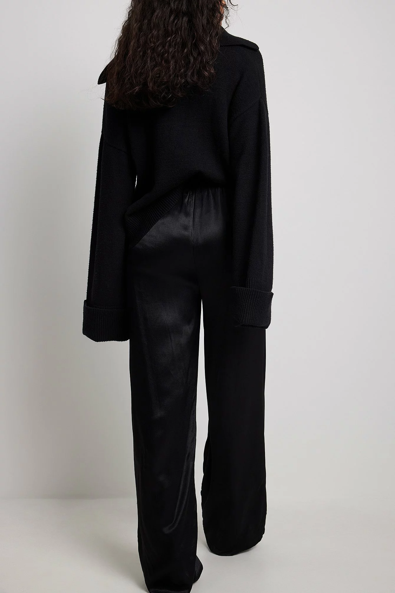 These pants are made of satin and feature a slim elasticized waistband. They have side pockets.