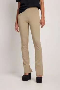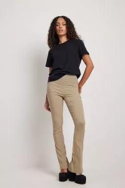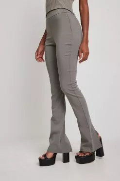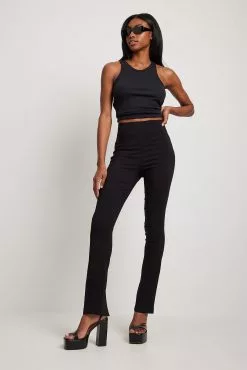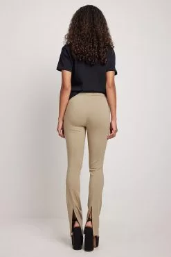 These pants feature a high waist with a zipper on the side, a slim leg with ankle slits on the back and a stretchy material.