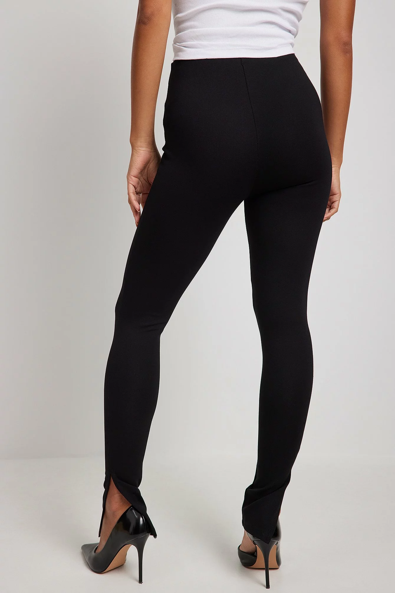 These leggings feature a high waist. They have a slit detail.