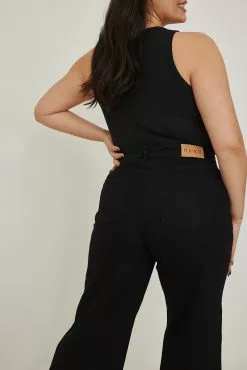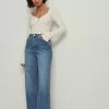 These 5-pocket jeans feature a high waist. They have a zip and button closure and a wide leg.