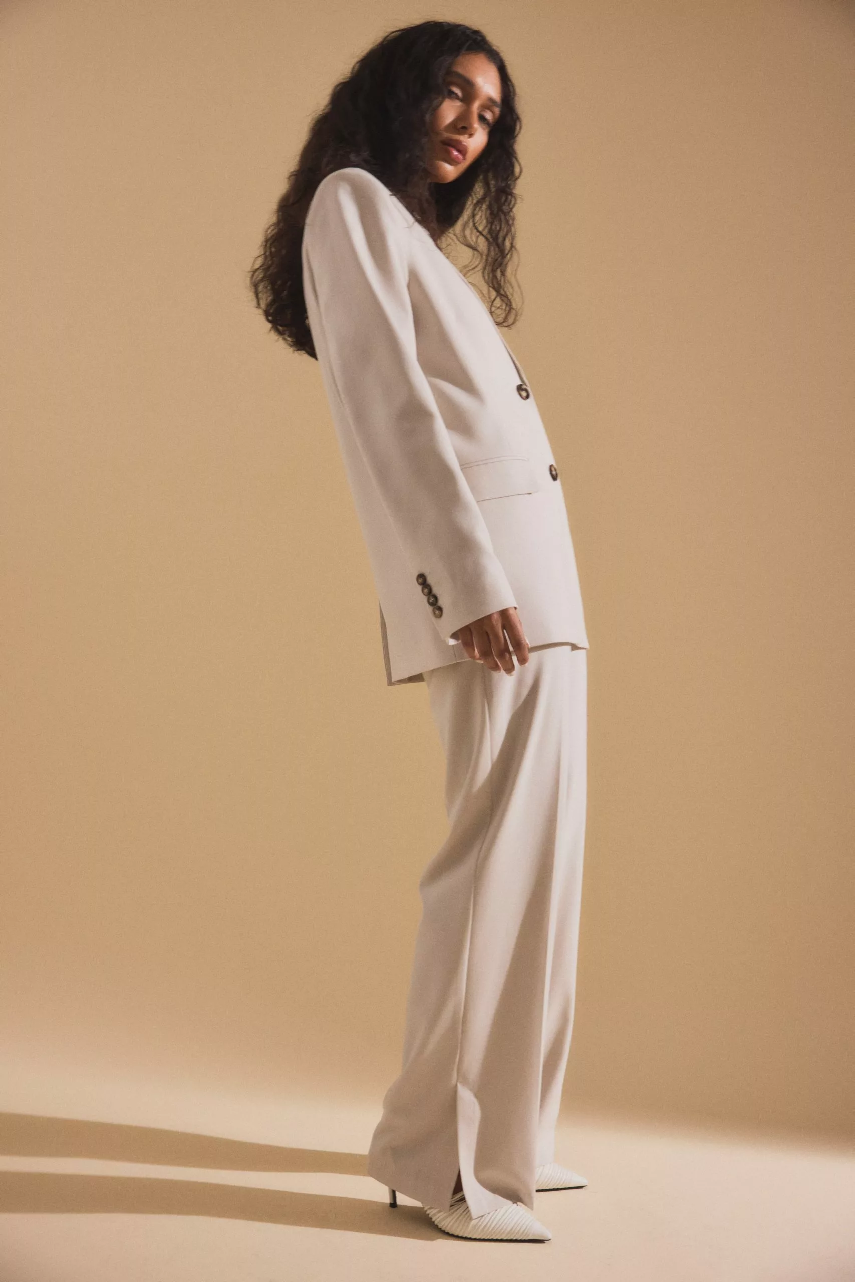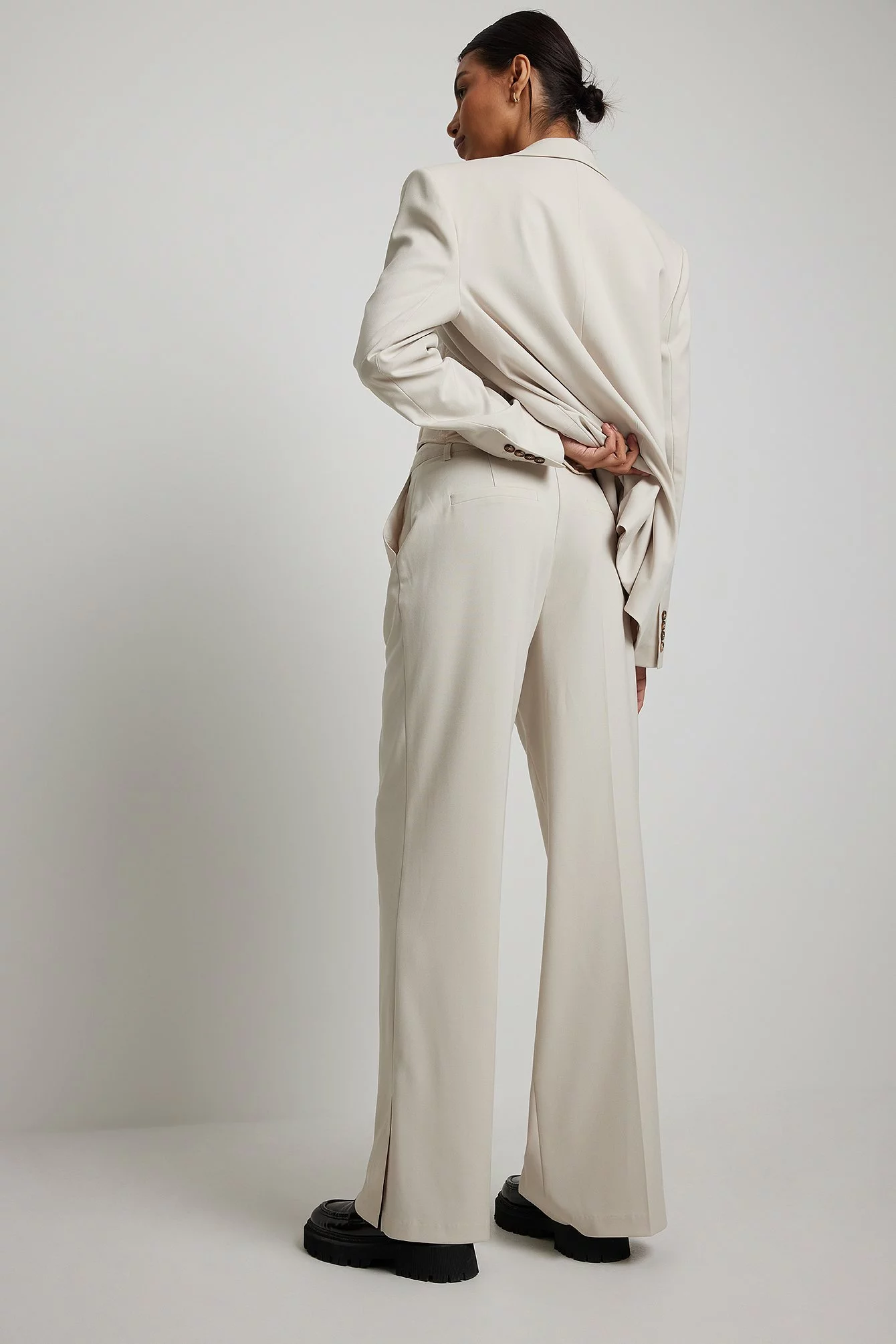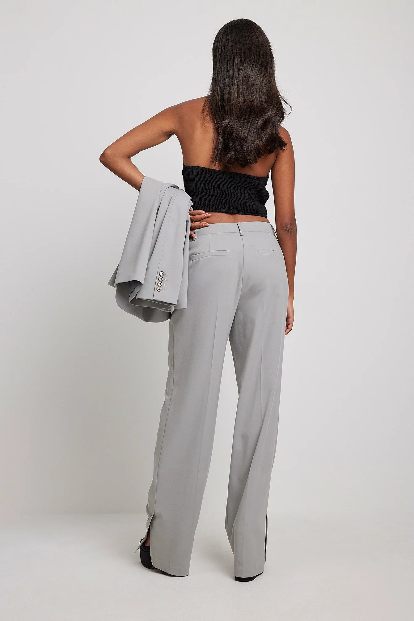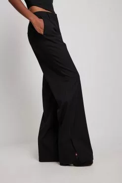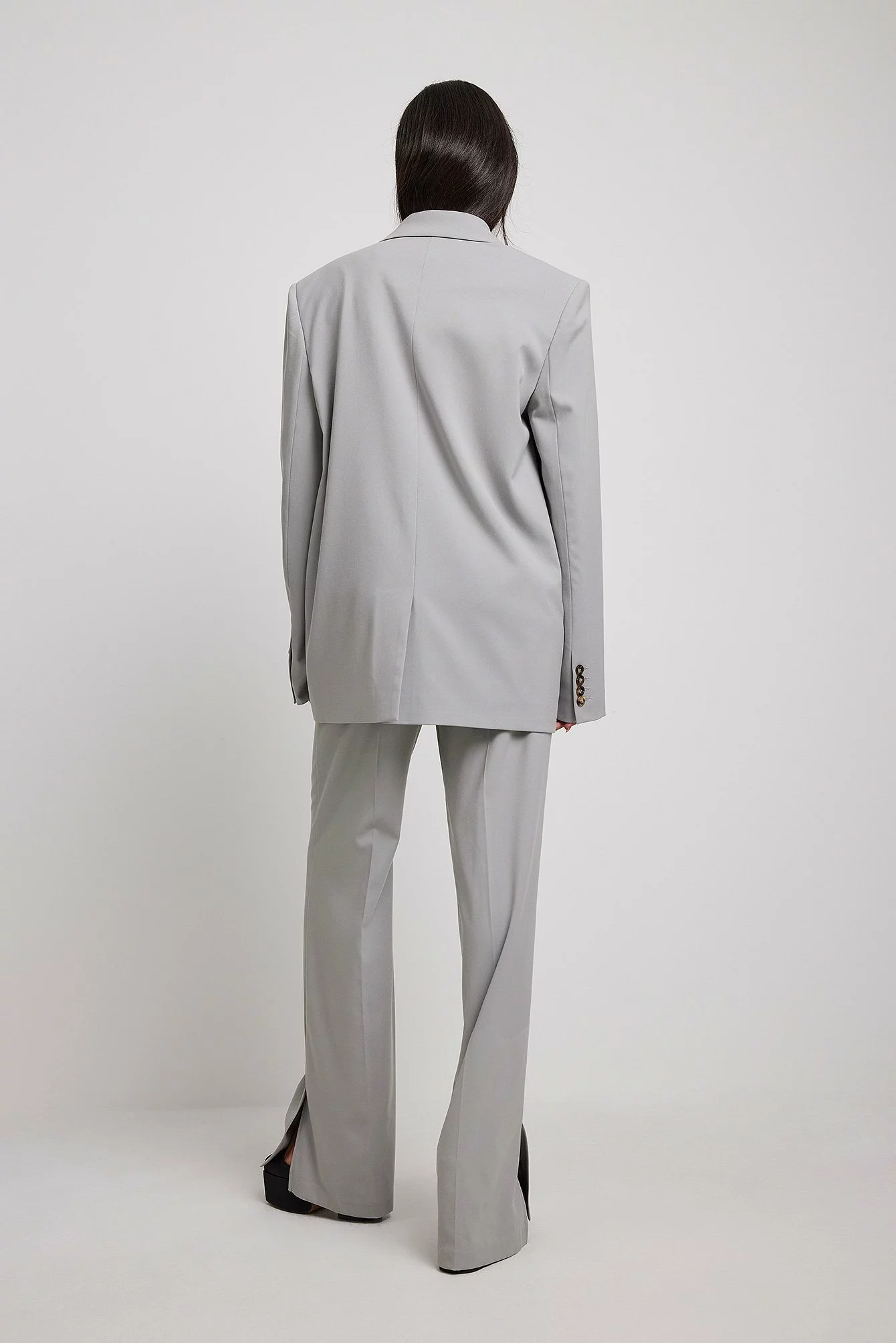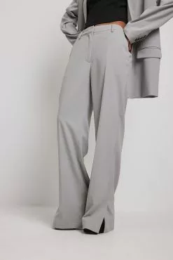 These suit pants feature a zipper, hook and button closure, front pockets, back mock pockets, straight legs with slit details at the end and a soft, unlined fabric.