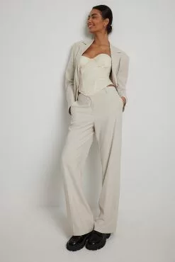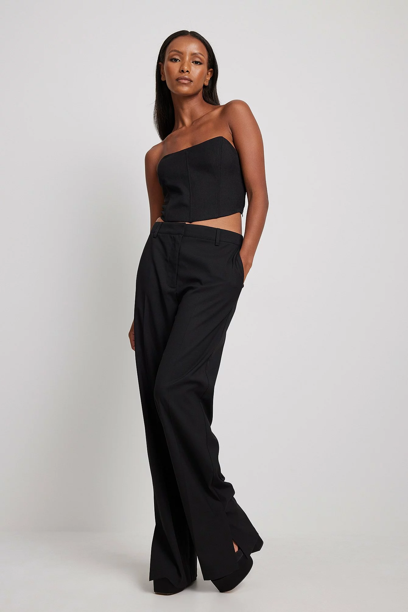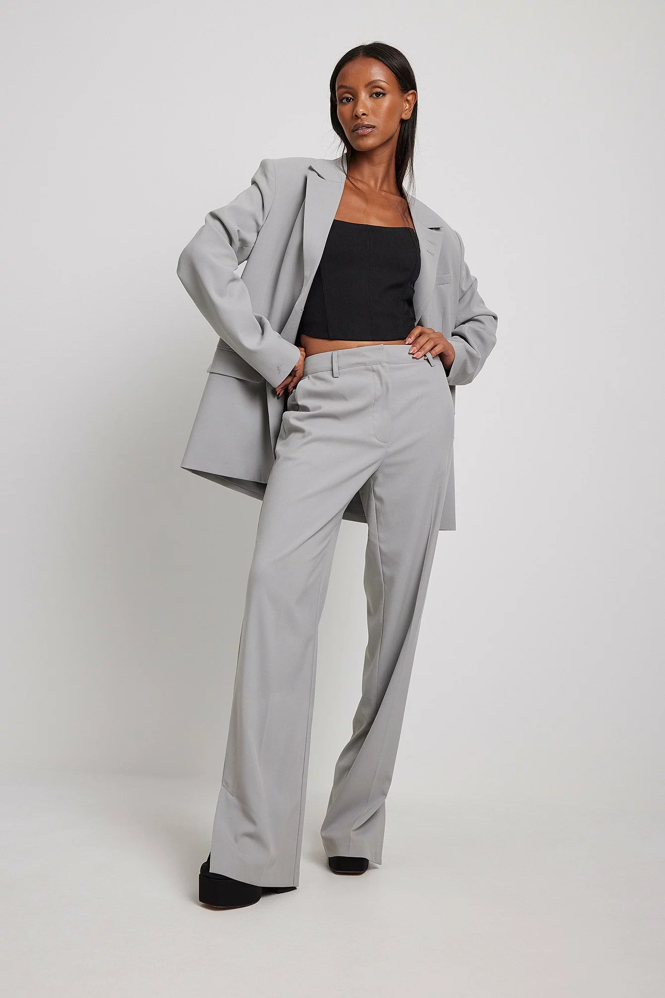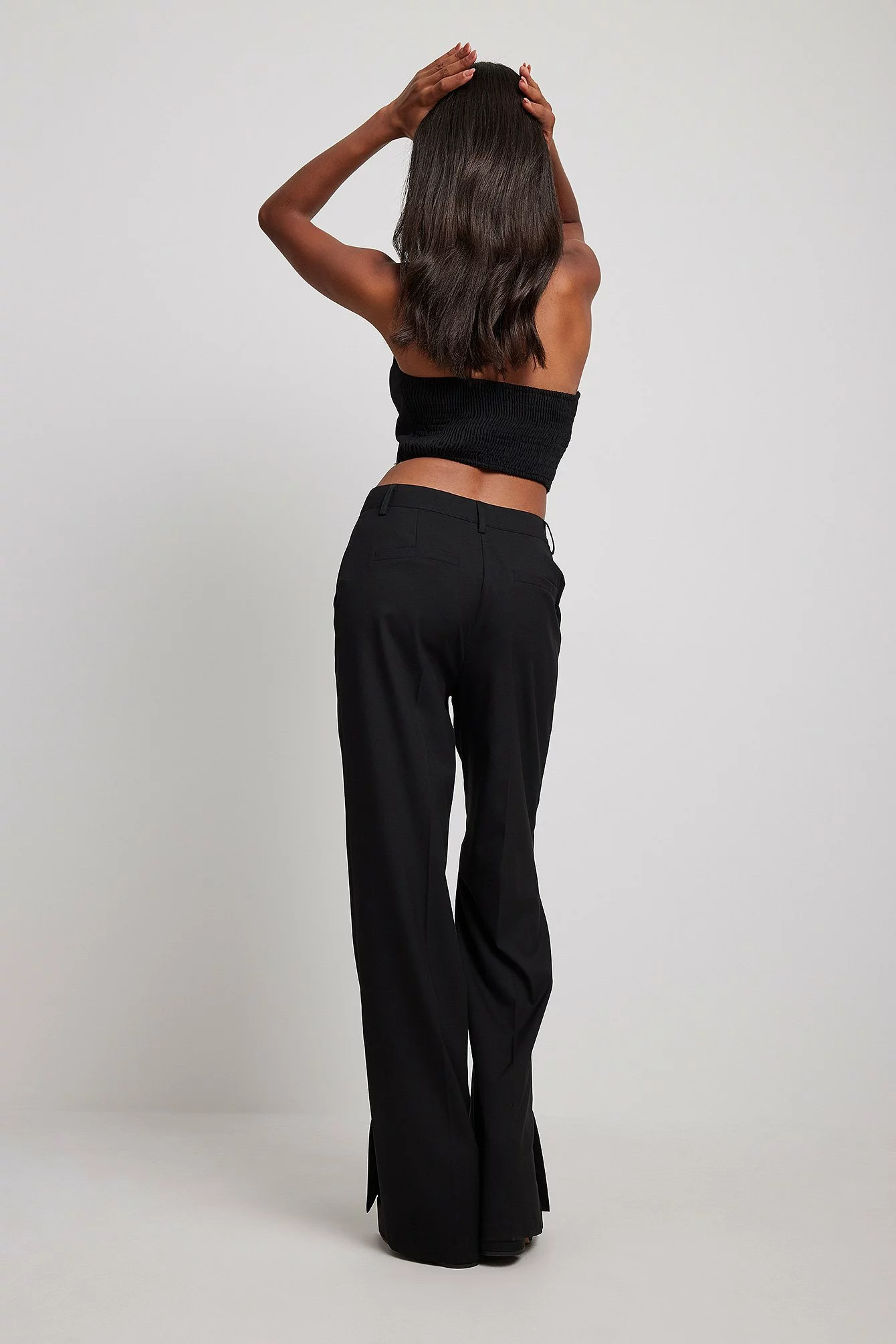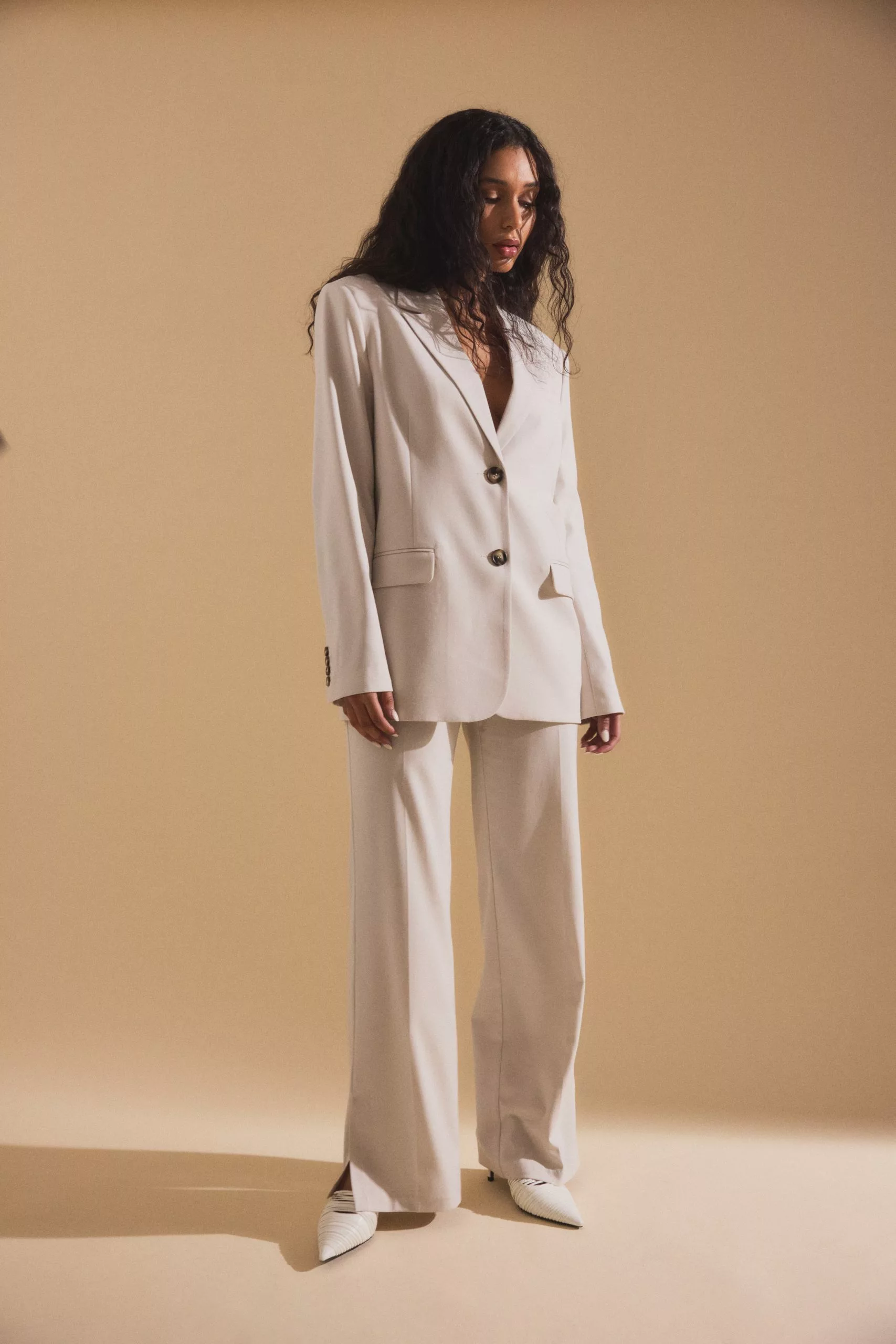 These suit pants feature a zipper, hook and button closure, front pockets, back mock pockets, straight legs with slit details at the end and a soft, unlined fabric.