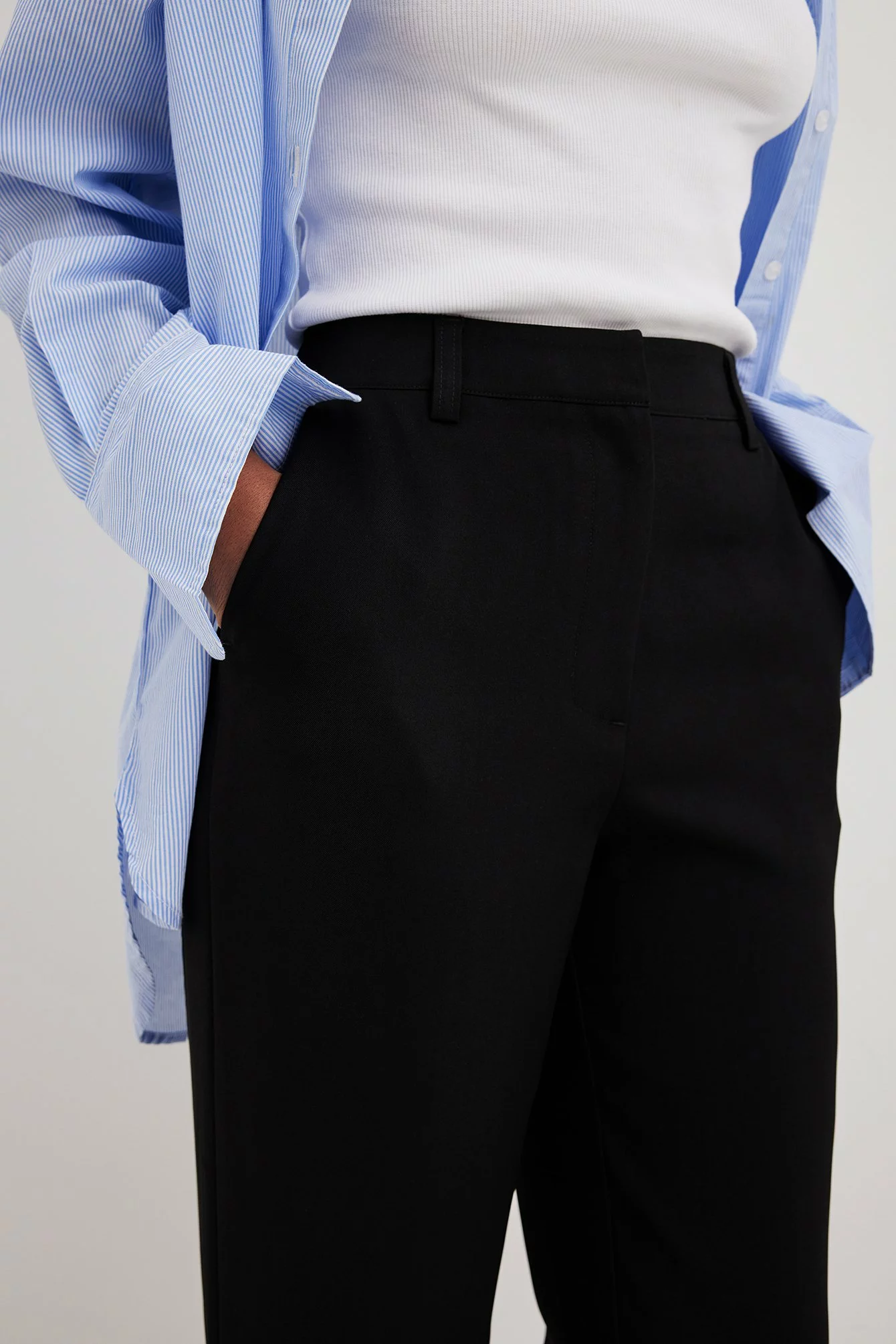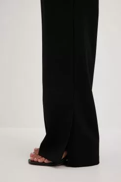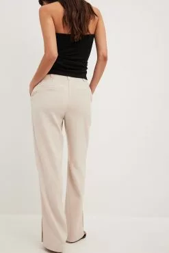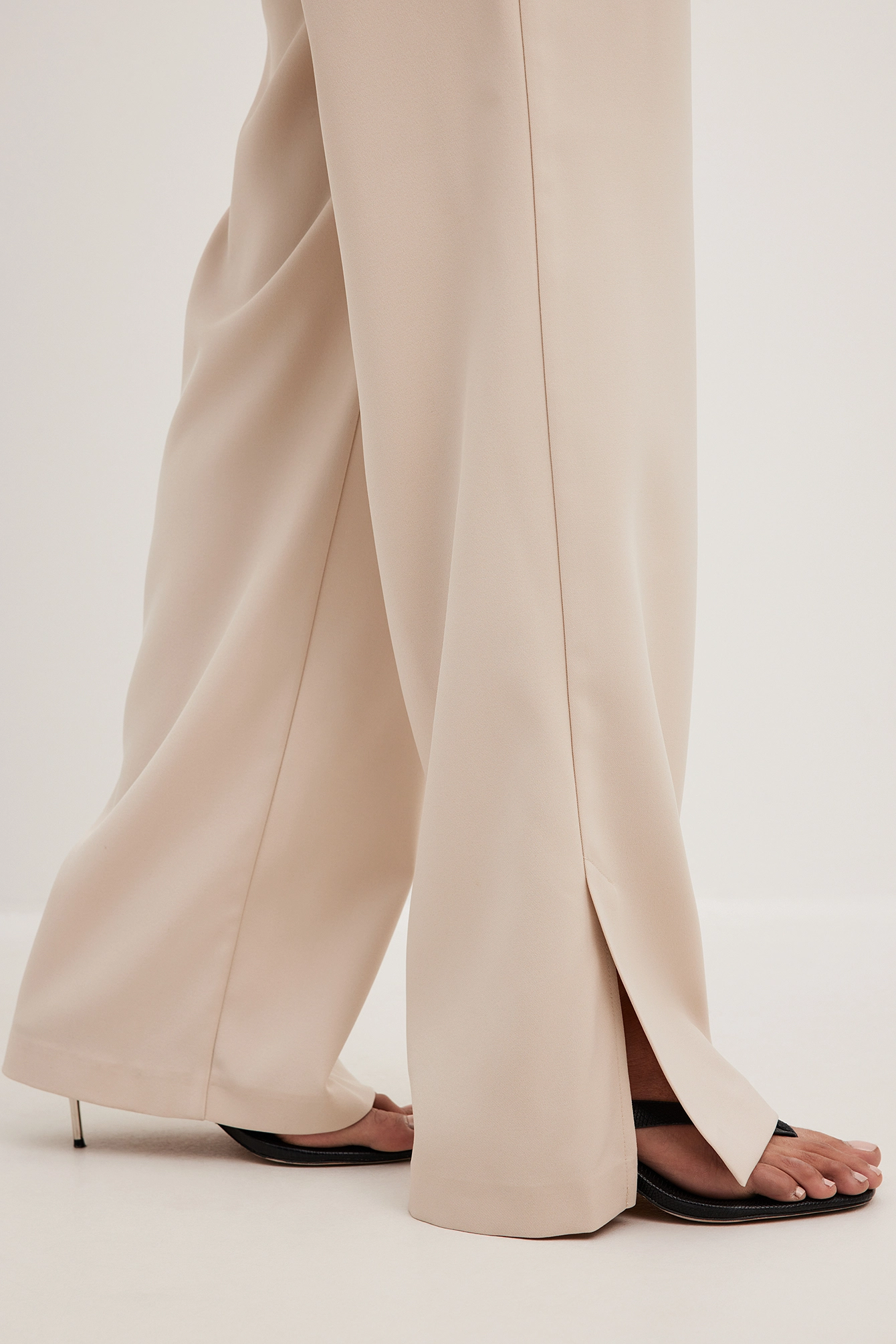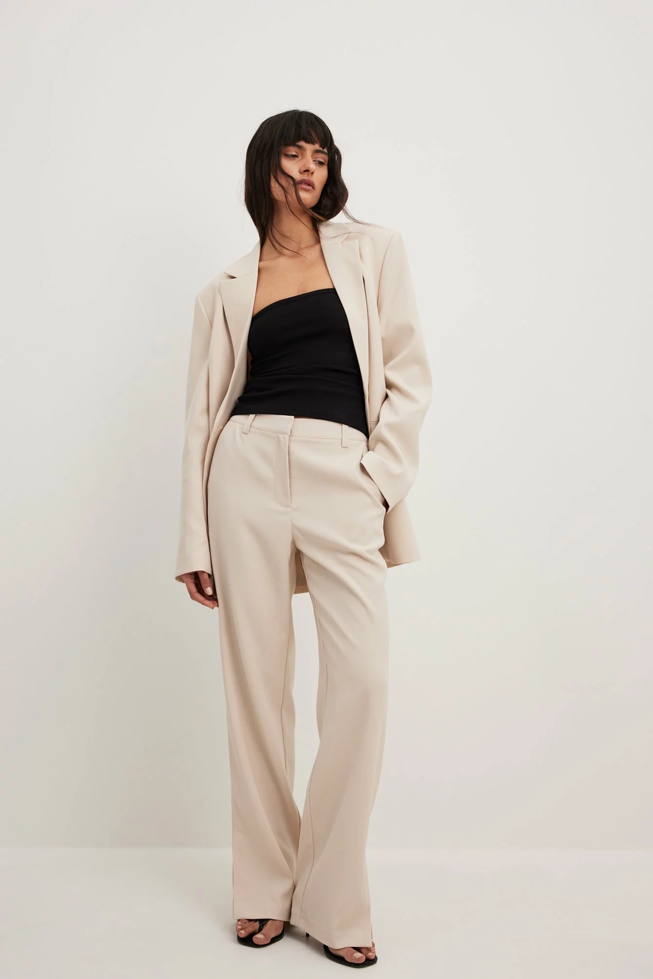 These suit pants are tailored and feature a high waist fit. They have a straight leg and side slant pockets. These suit pants feature side slits and back mock pockets.