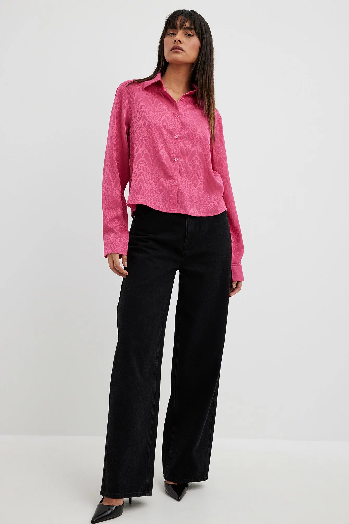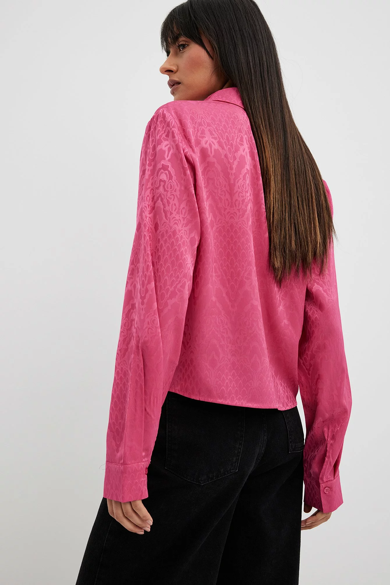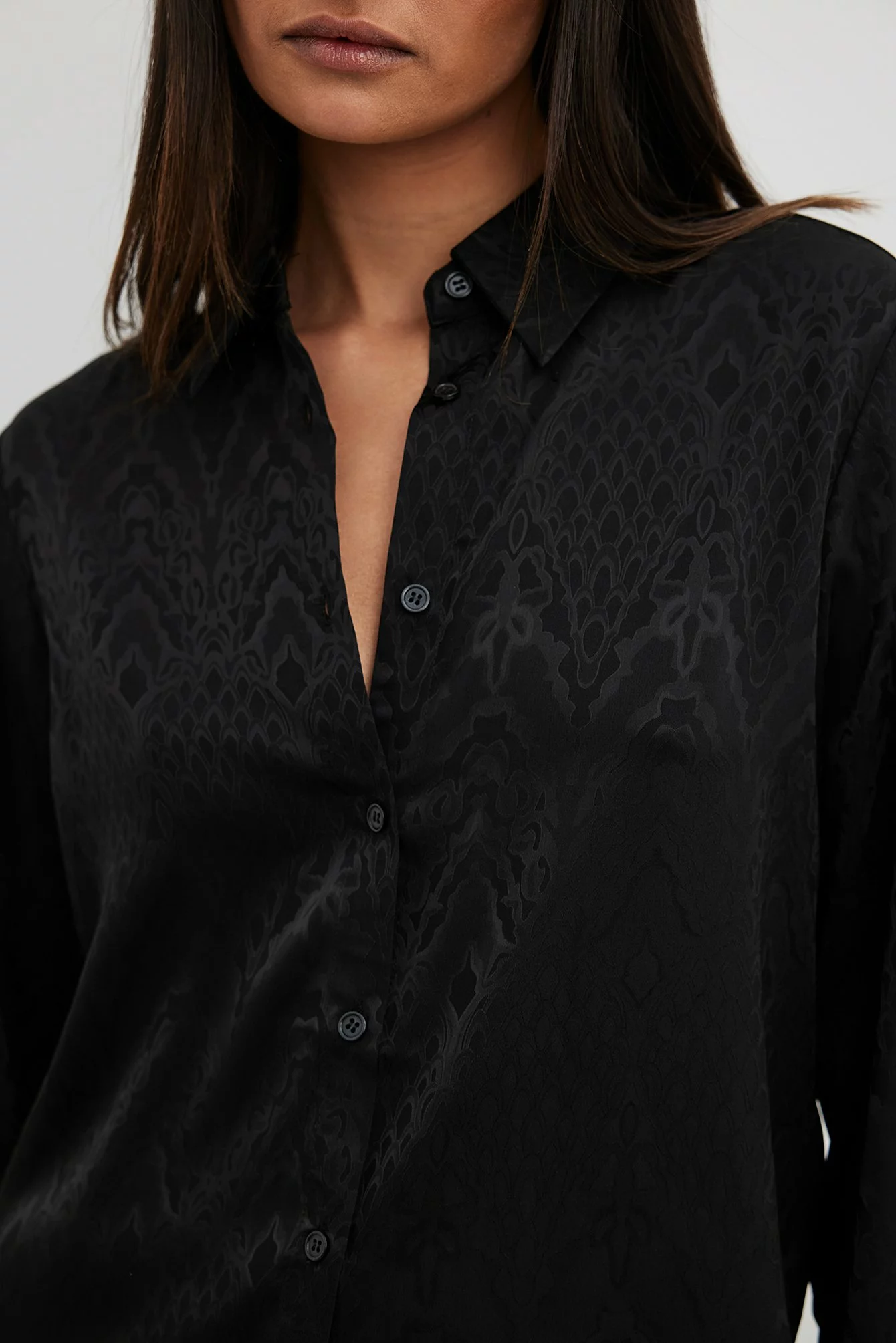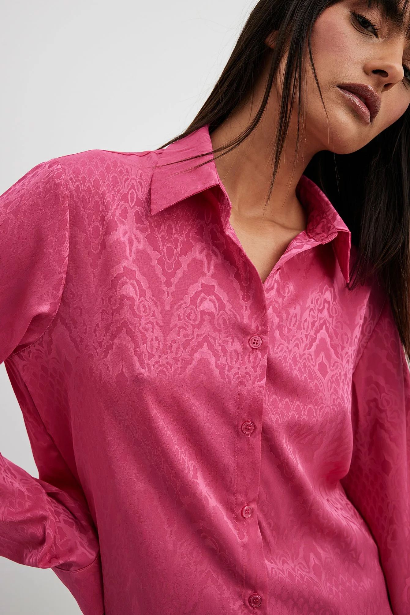 This shirt is slightly sheer and structured and features a satin touch. It has a classic collar and button closure. This shirt features long sleeves with button closure on the cuffs.