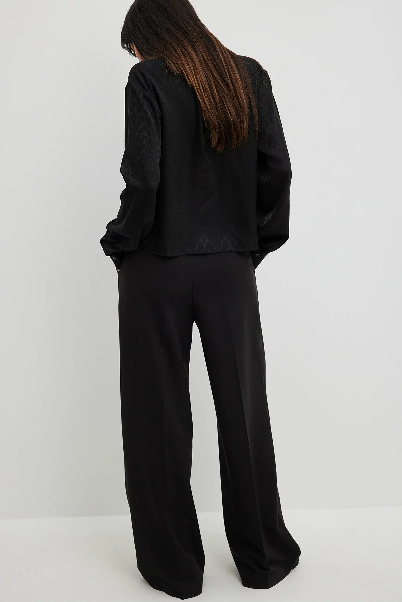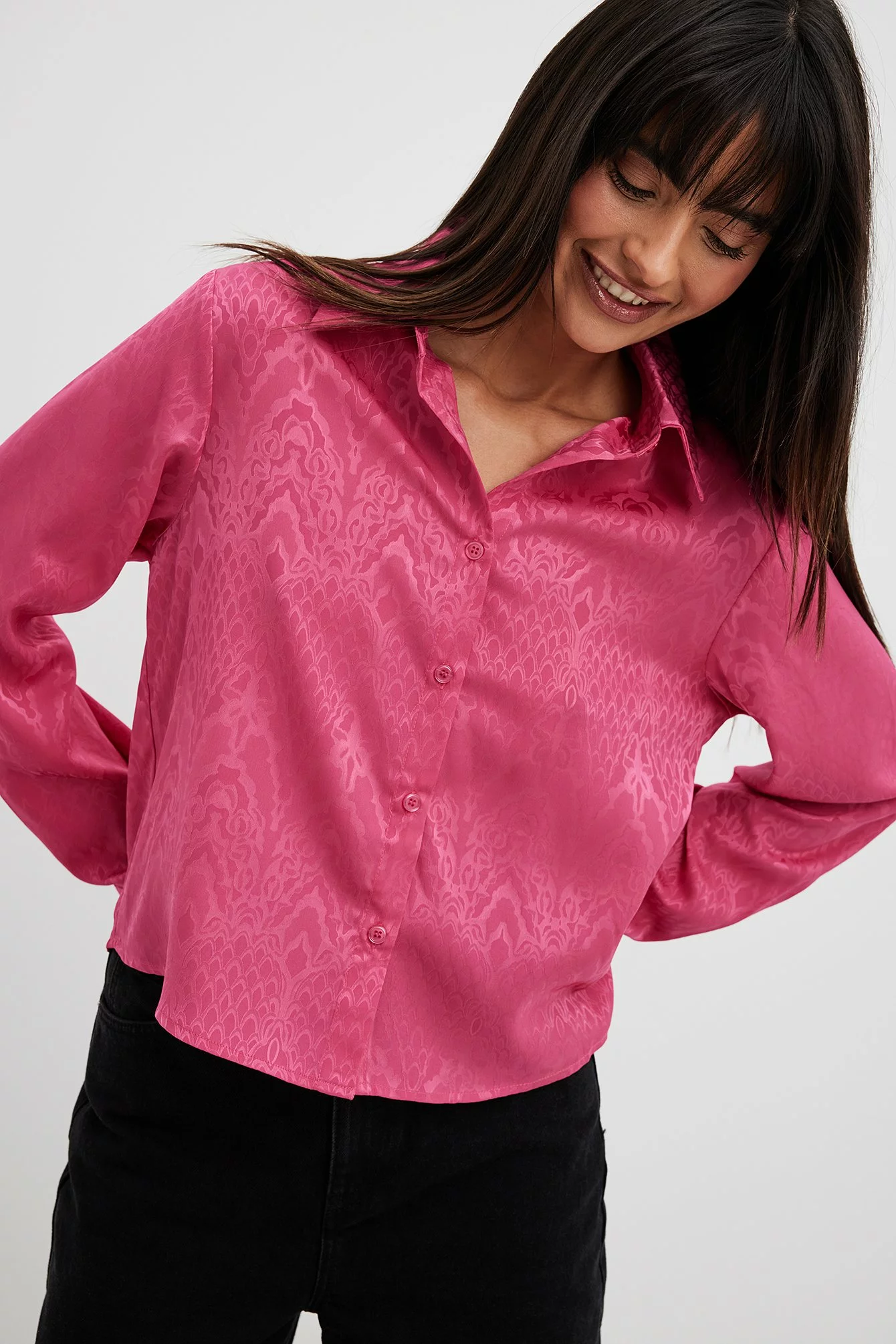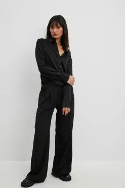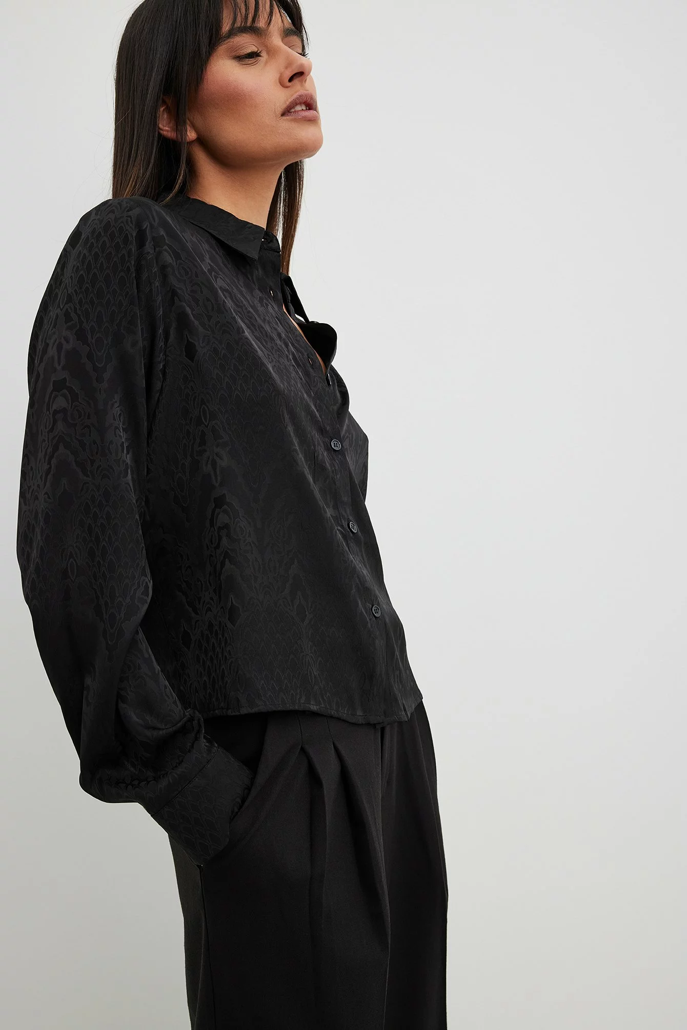 This shirt is slightly sheer and structured and features a satin touch. It has a classic collar and button closure. This shirt features long sleeves with button closure on the cuffs.
