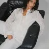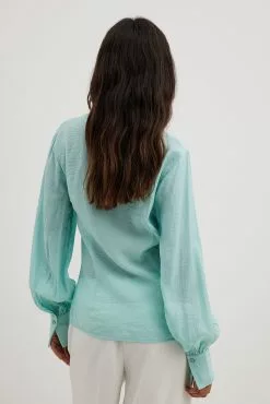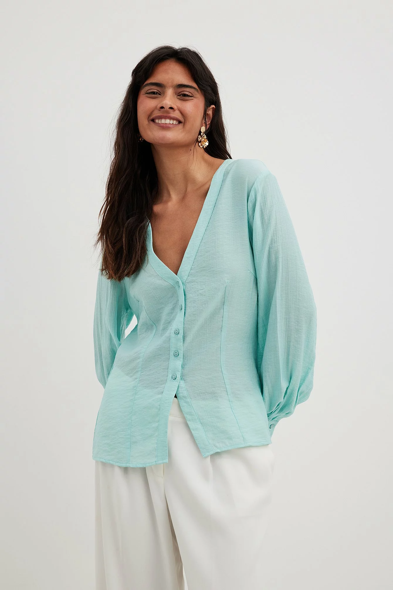 This blouse features a v neckline. It has long sleeves and single button cuffs. This blouse features a button closure down the front and a fitted bodice.