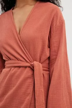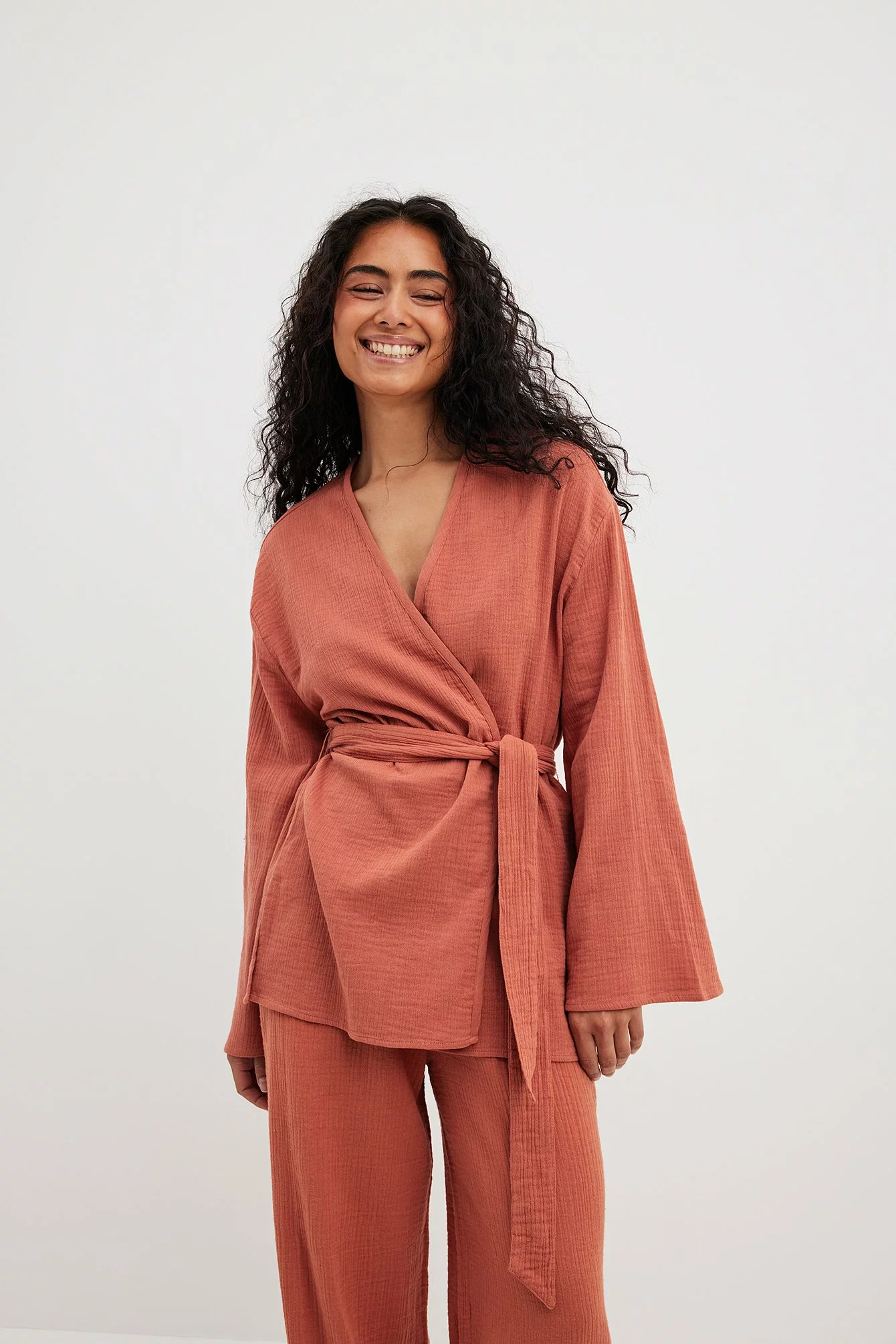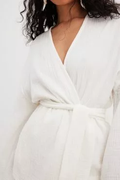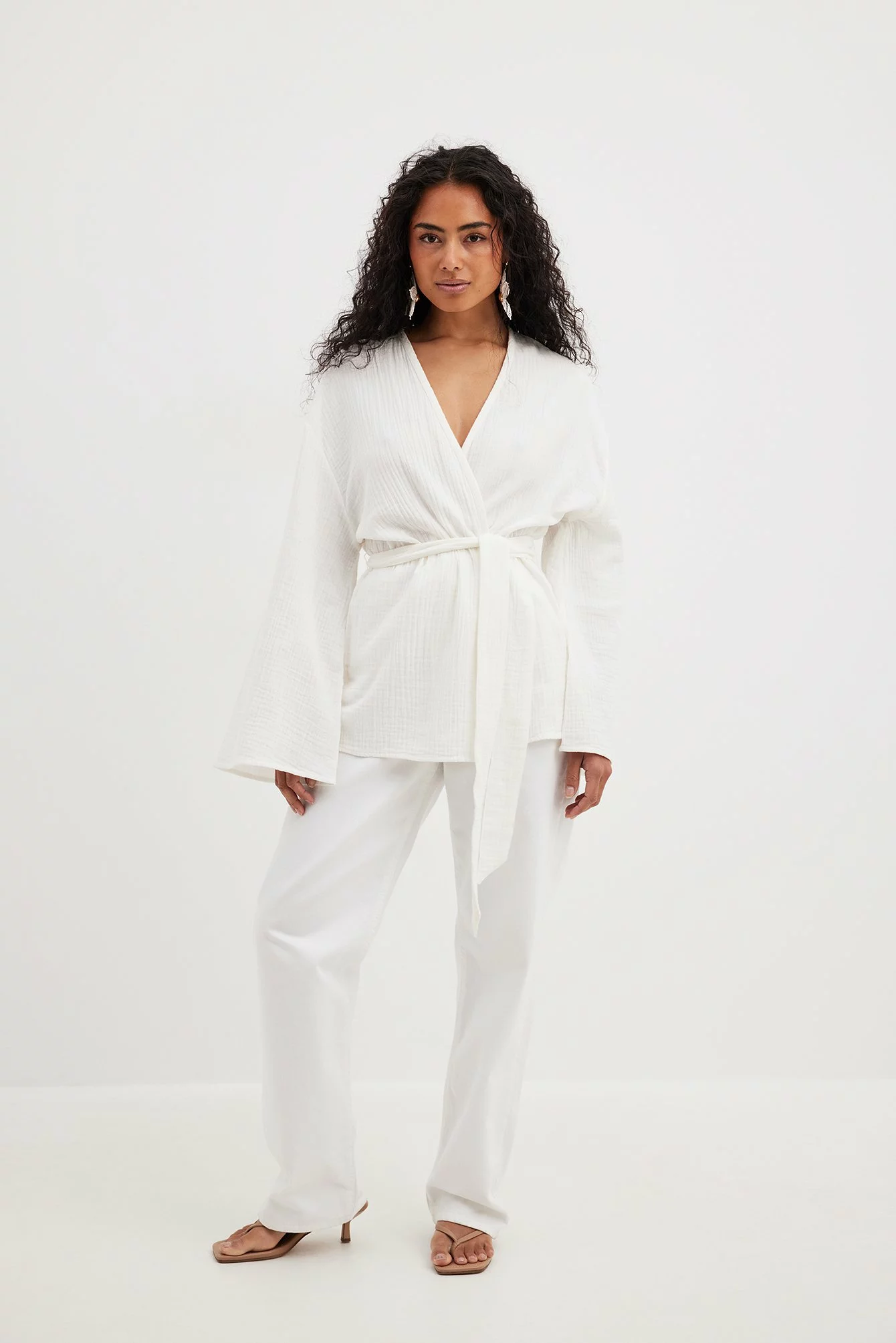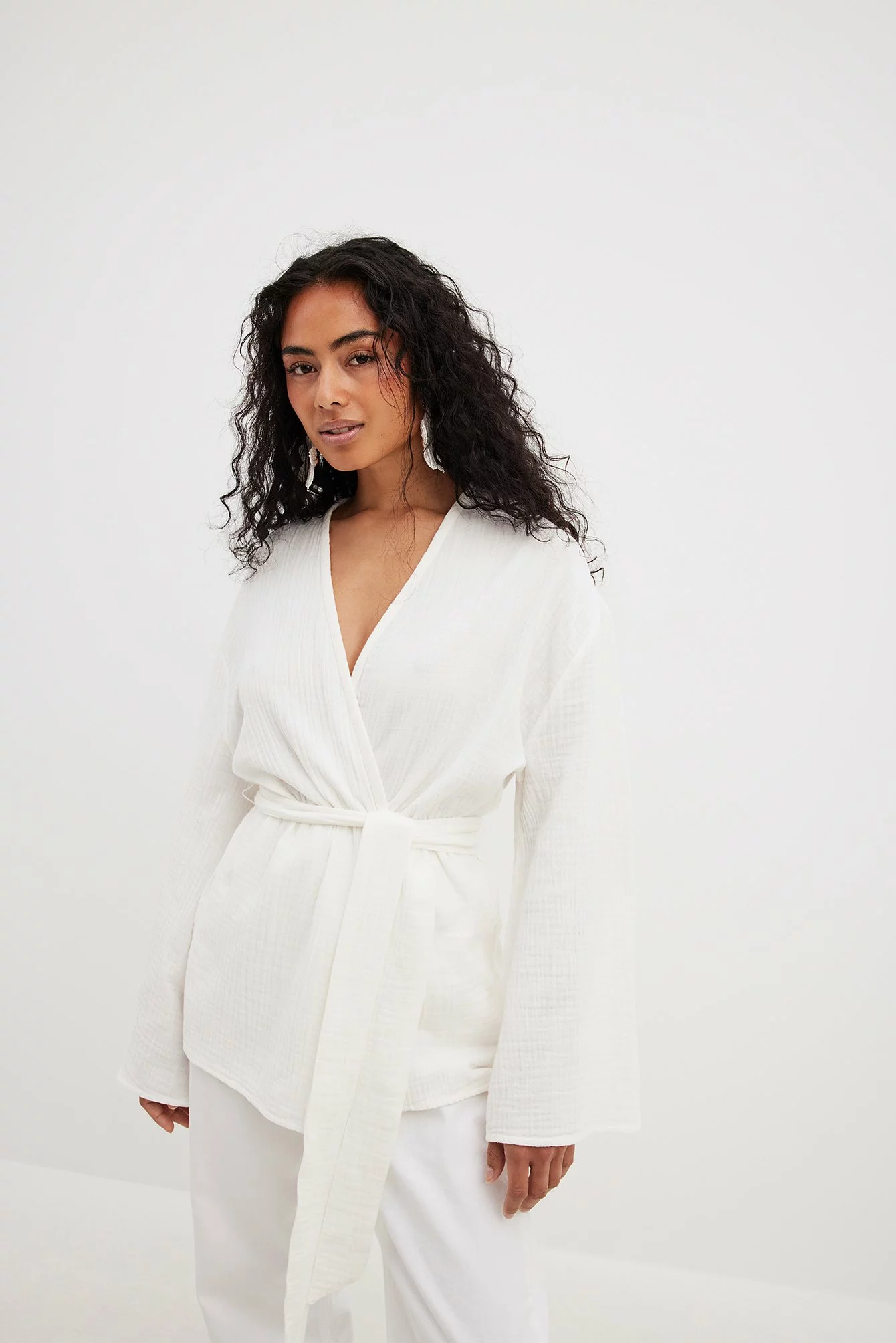 This blouse features a wrap blouse. It has a loose fit and a knot waist. This blouse features a v neckline and wide long sleeves.