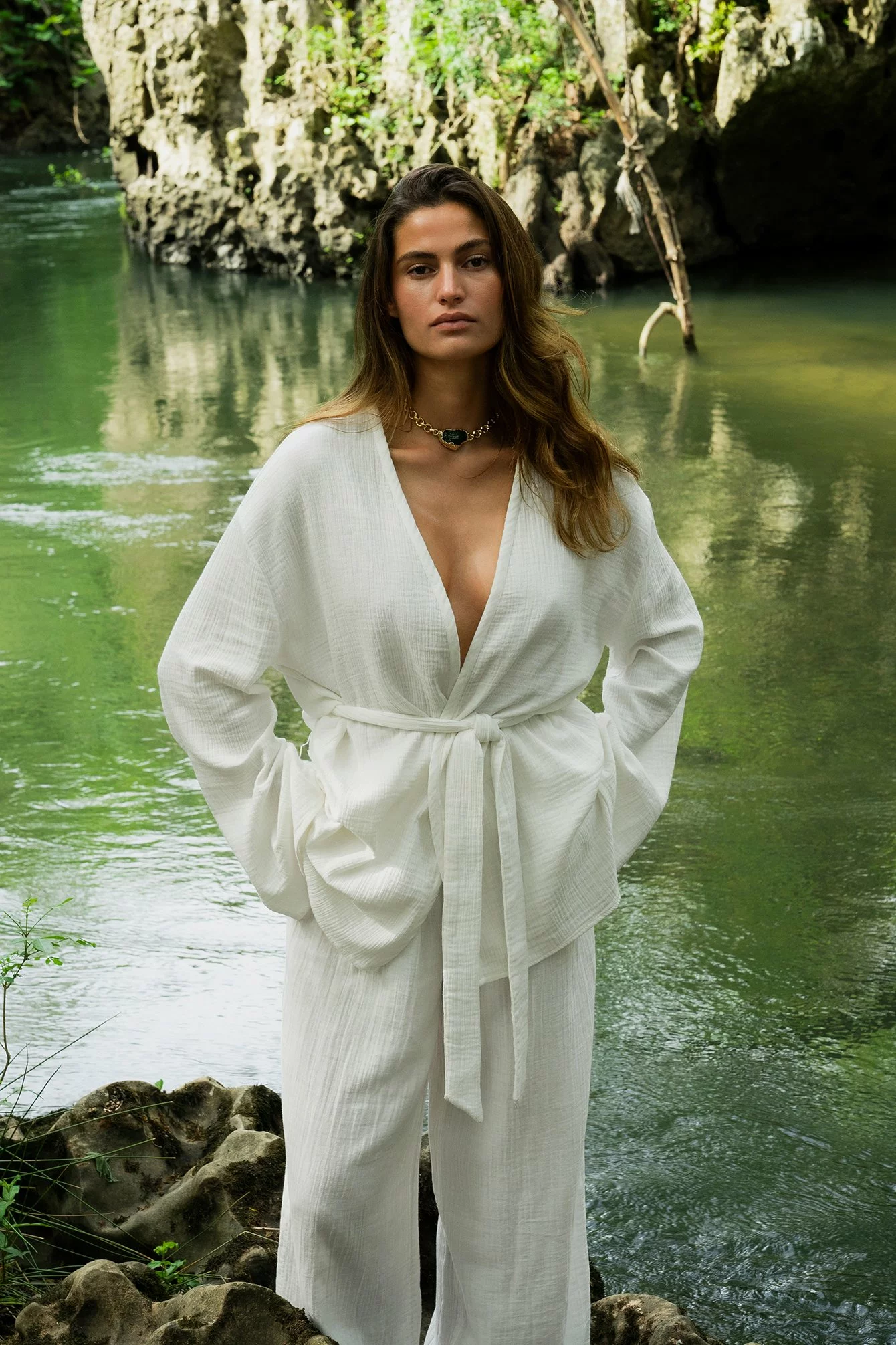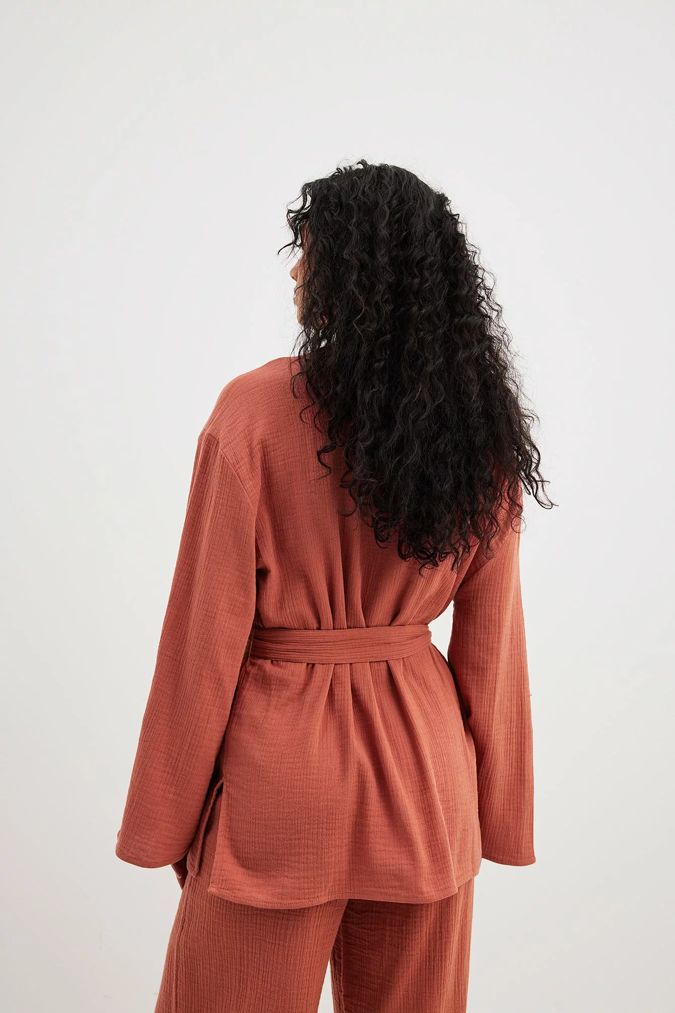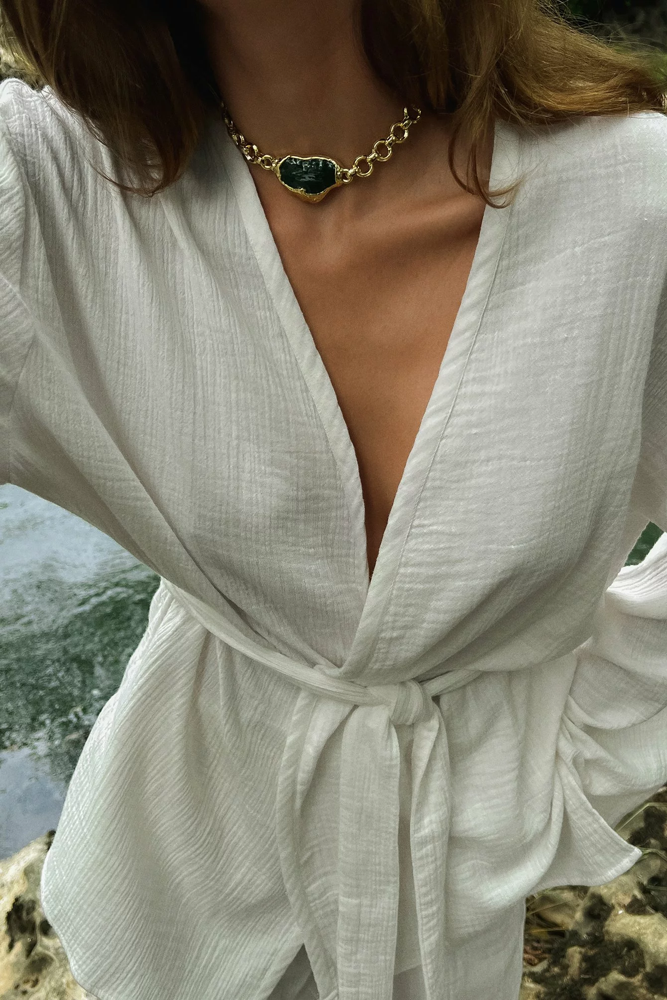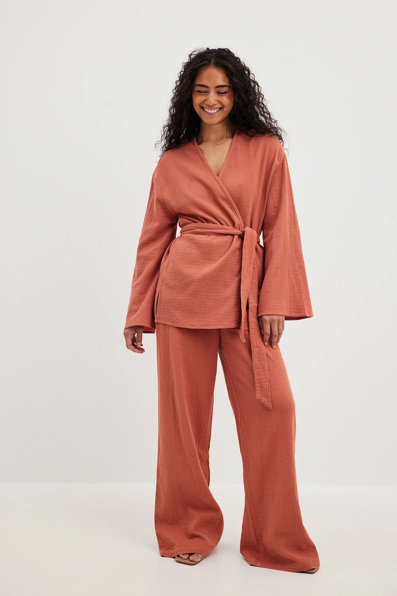This blouse features a wrap blouse. It has a loose fit and a knot waist. This blouse features a v neckline and wide long sleeves.