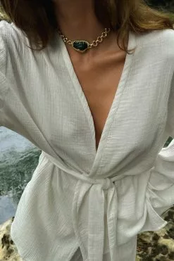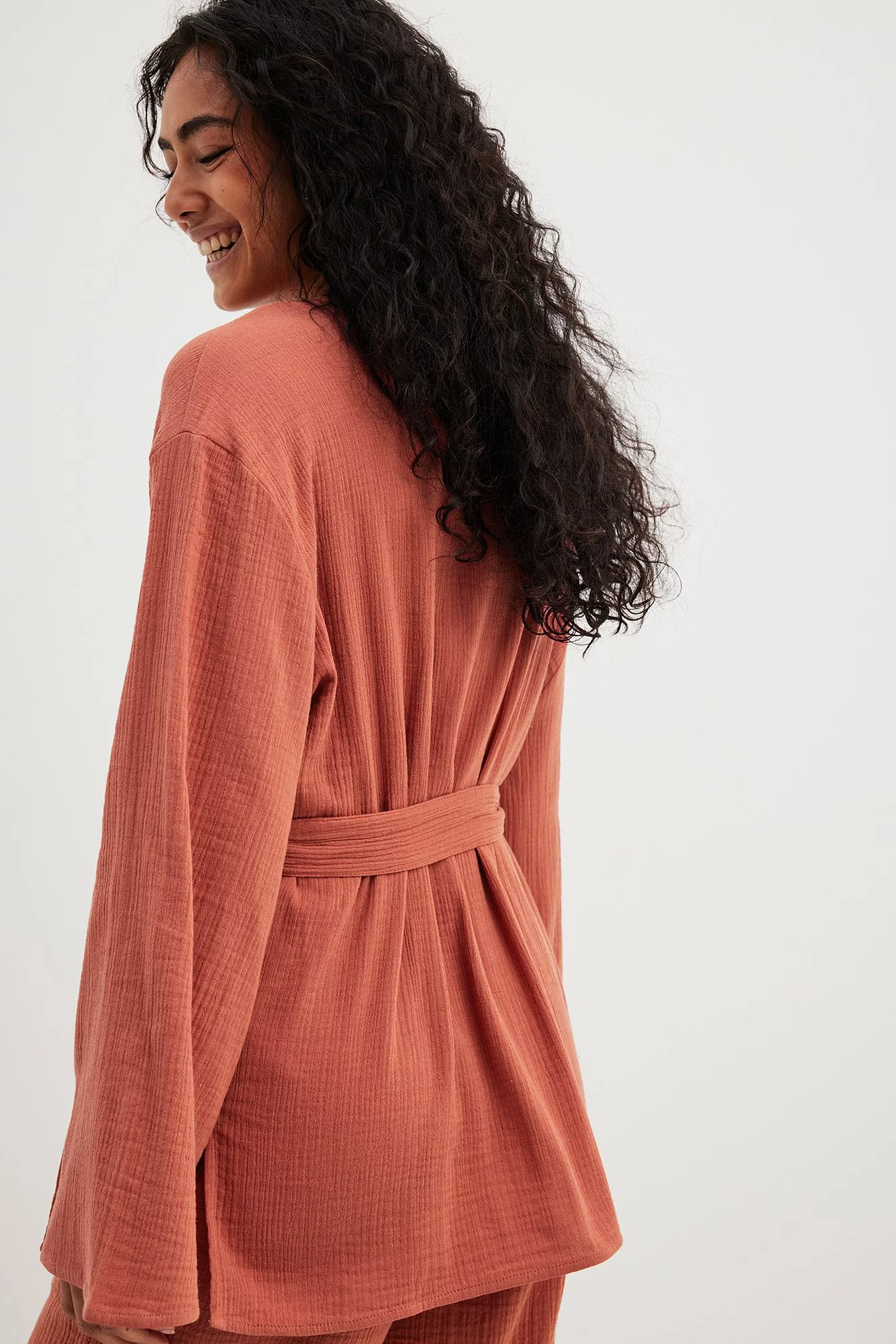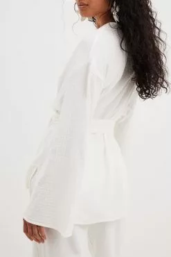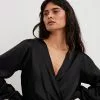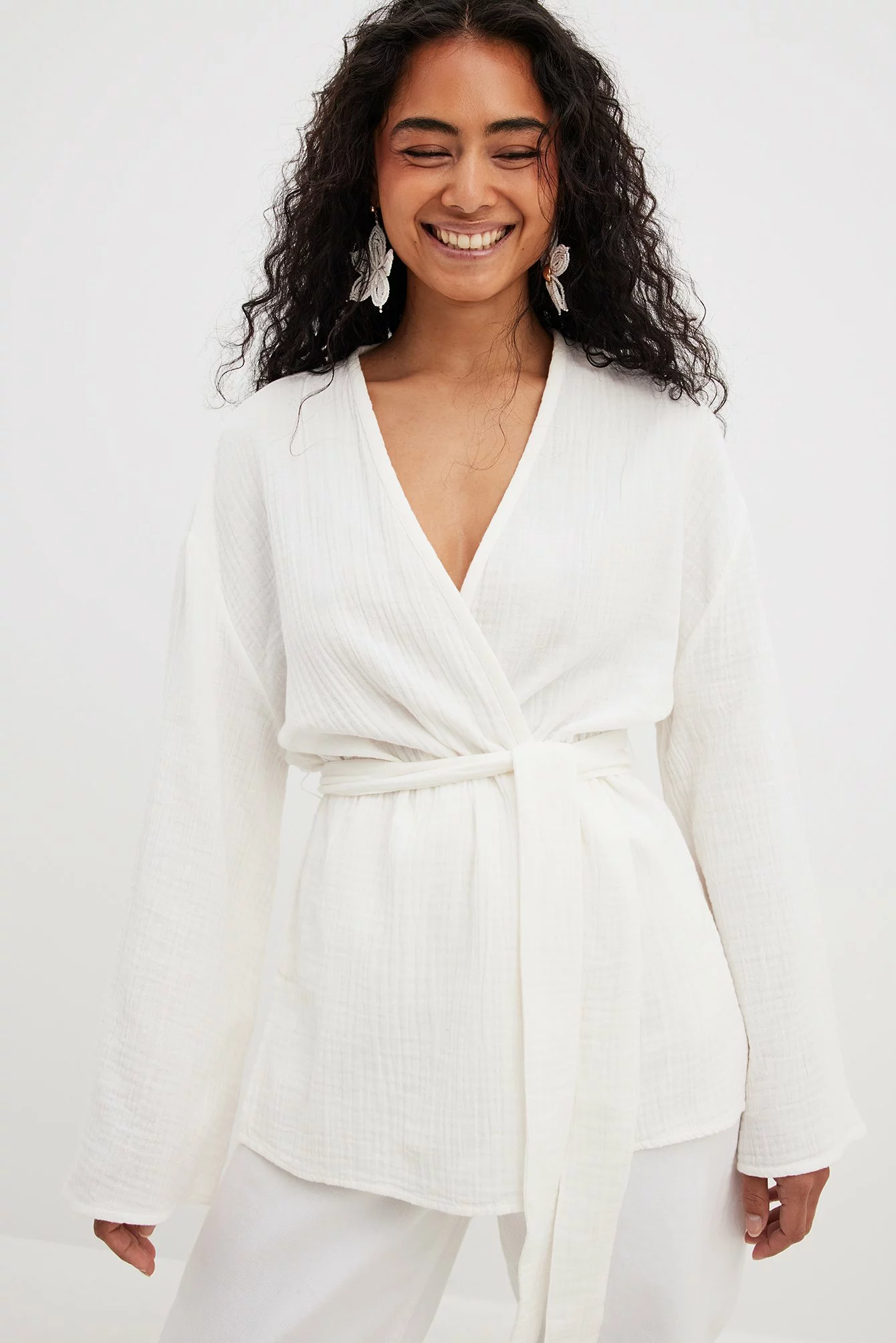 This blouse features a wrap blouse. It has a loose fit and a knot waist. This blouse features a v neckline and wide long sleeves.