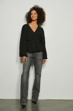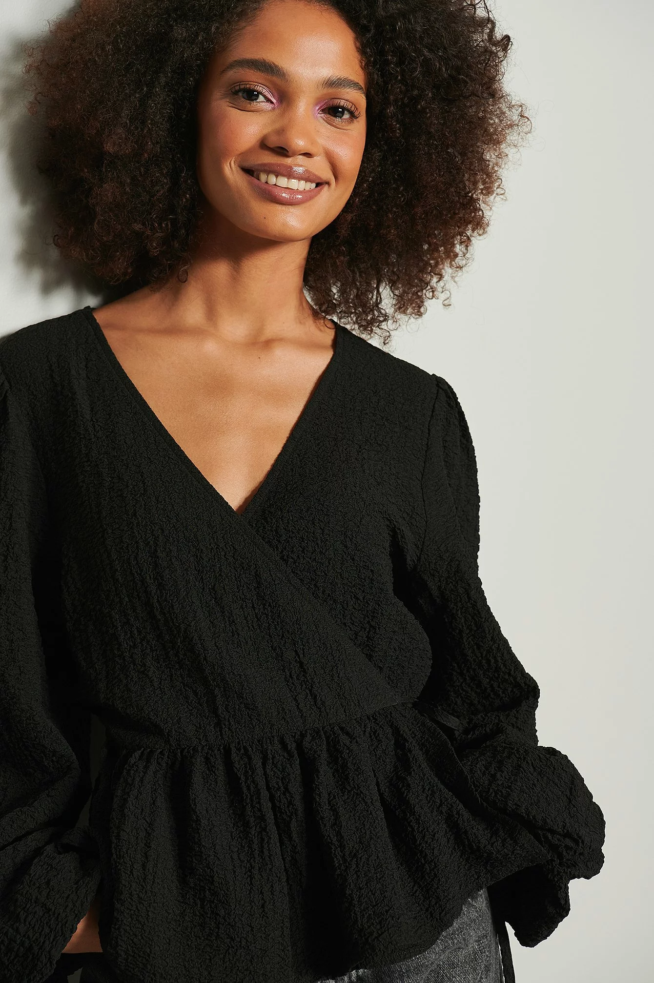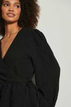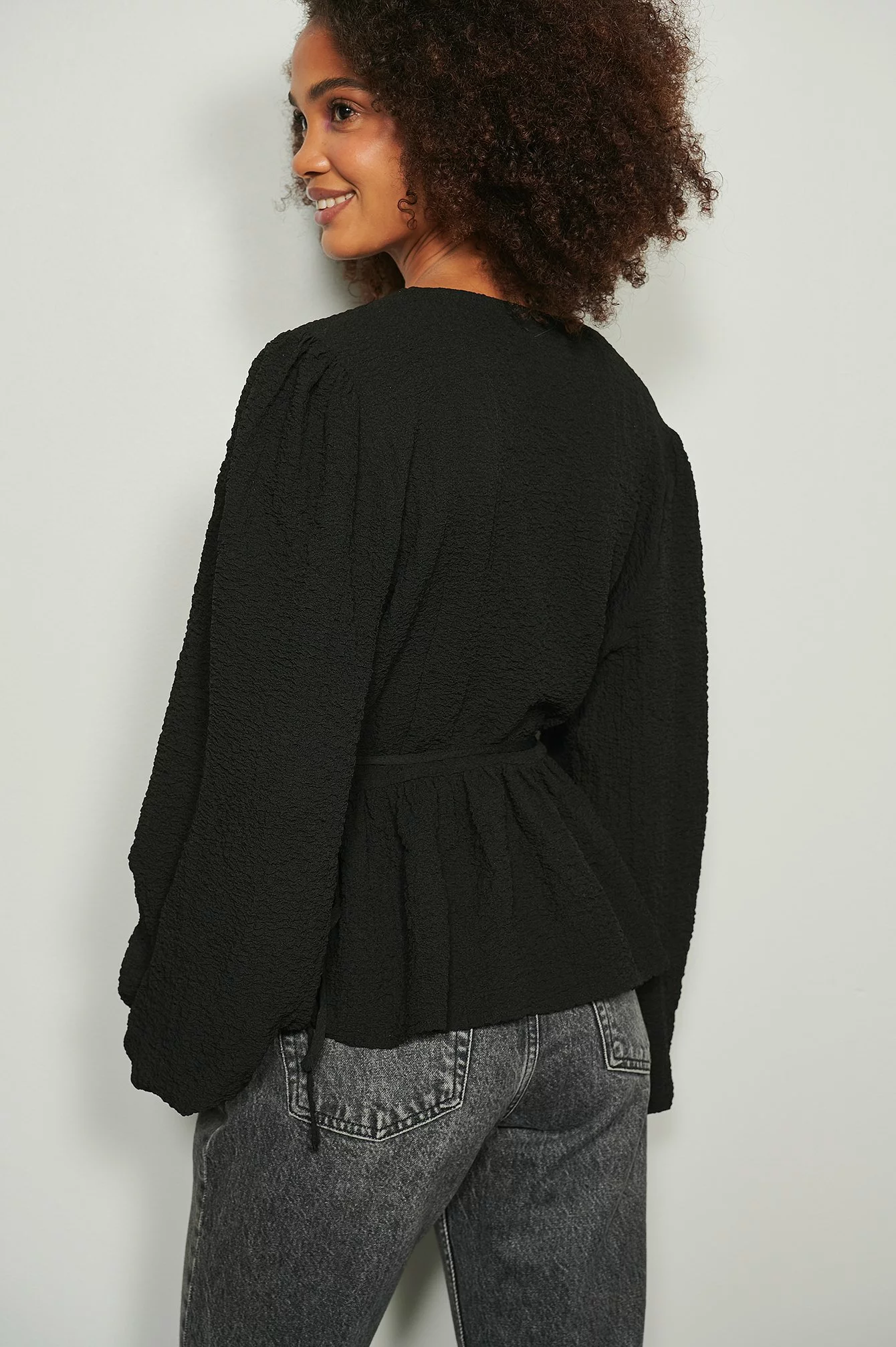 These balloon sleeves are long and feature a balloon sleeve, a structured material, a tie detail at the waist and a ruffle detail at hem.