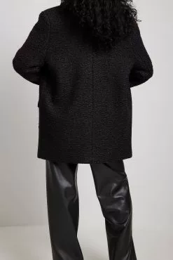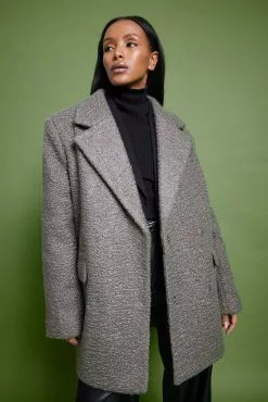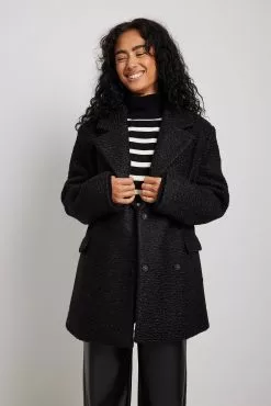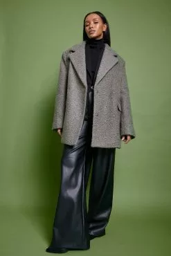 This coat is short and features a textured material. It has a lapel design and an overlap style with a snap button closure. This coat features front flap pockets.