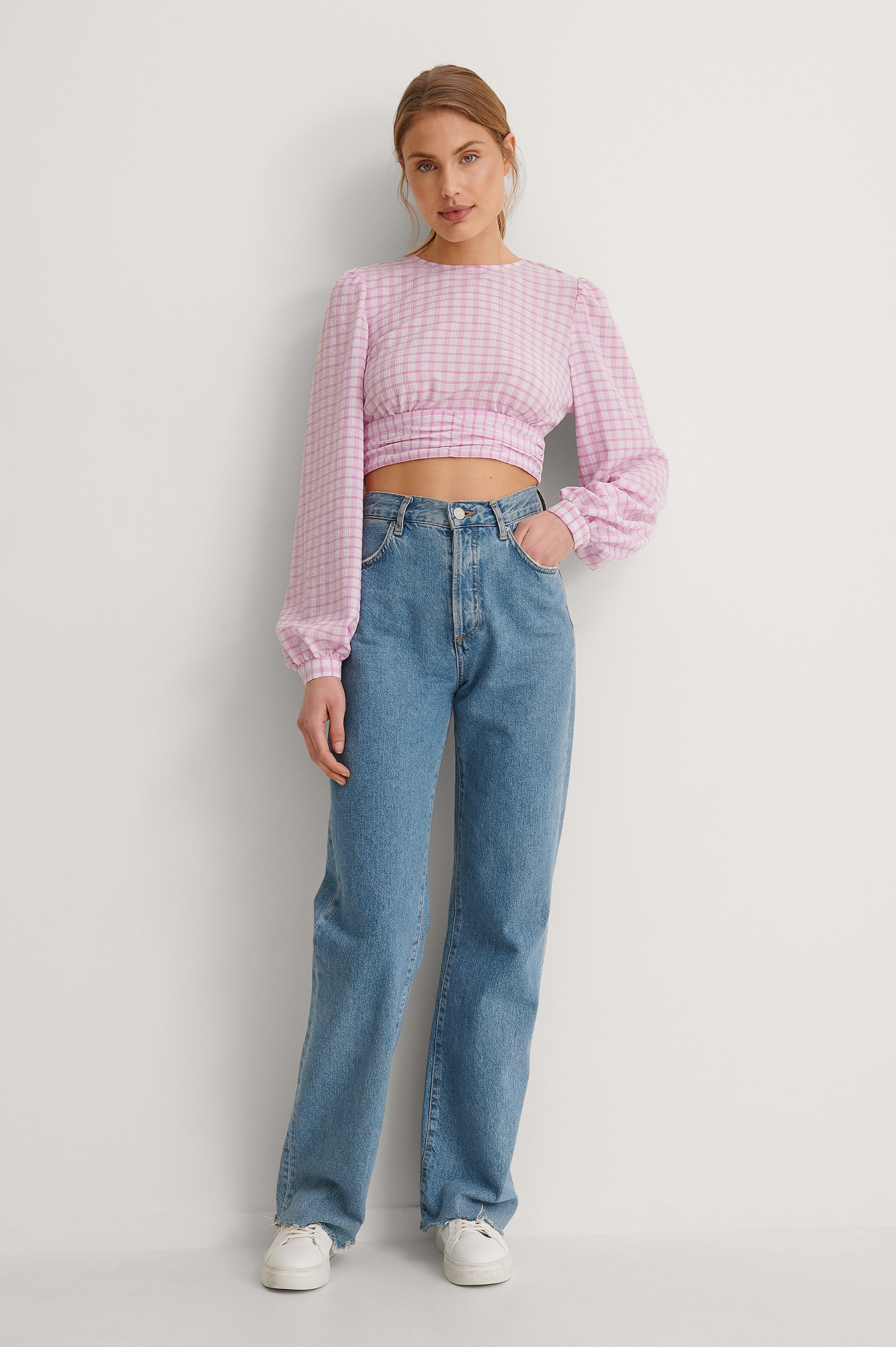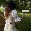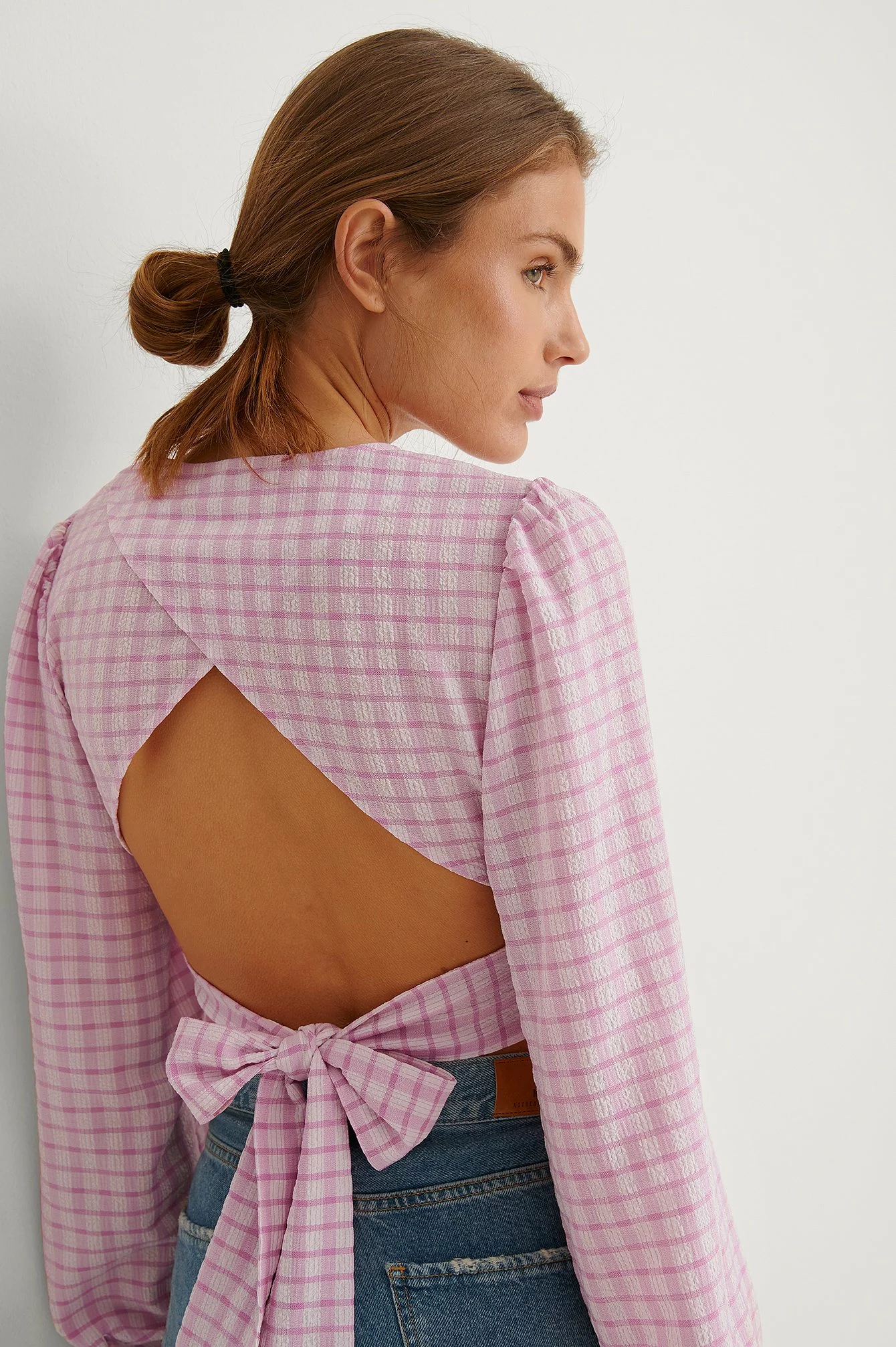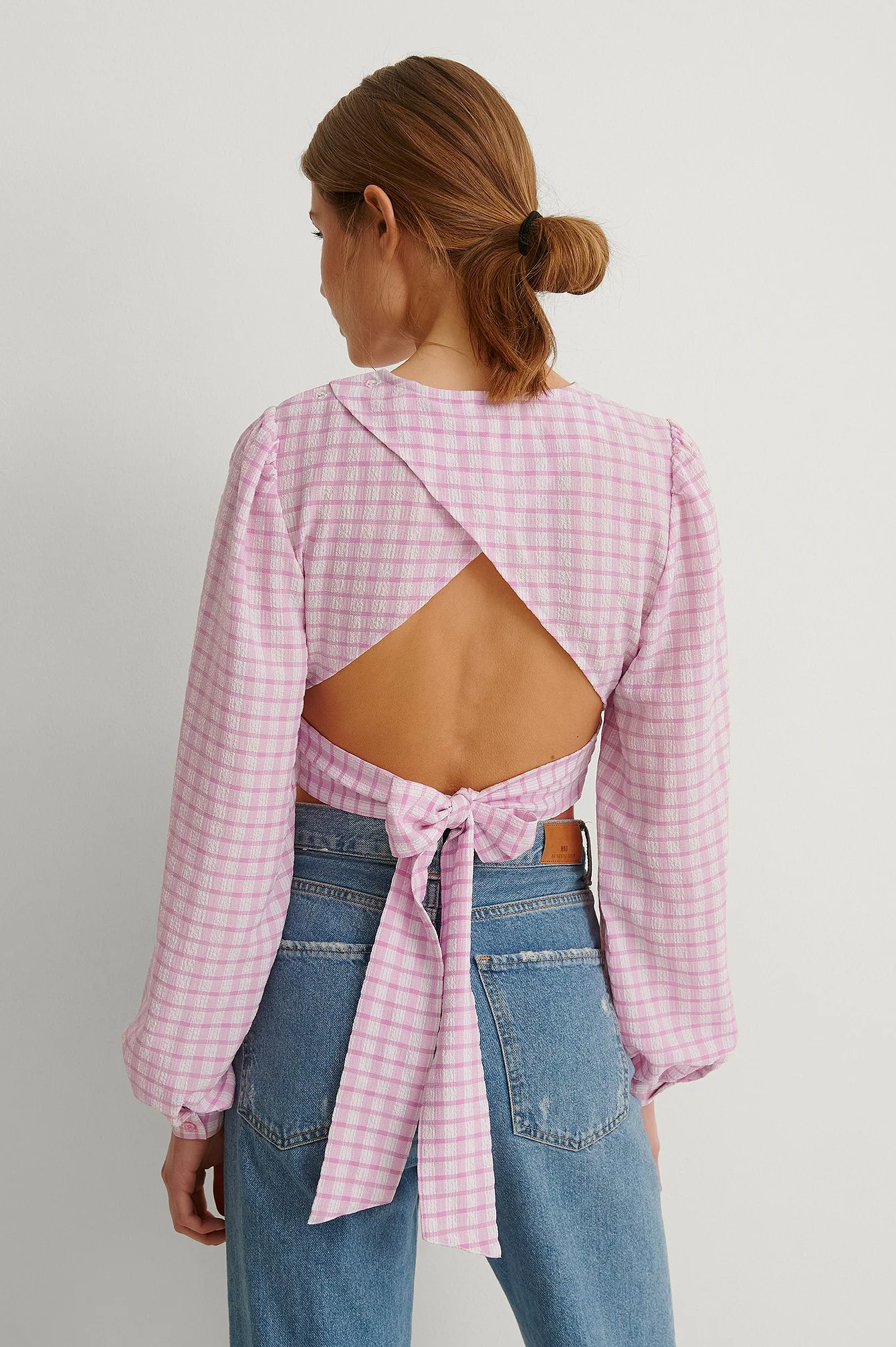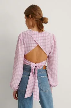 This blouse features long sleeves, a rounded neckline and an open back with a bow detail.