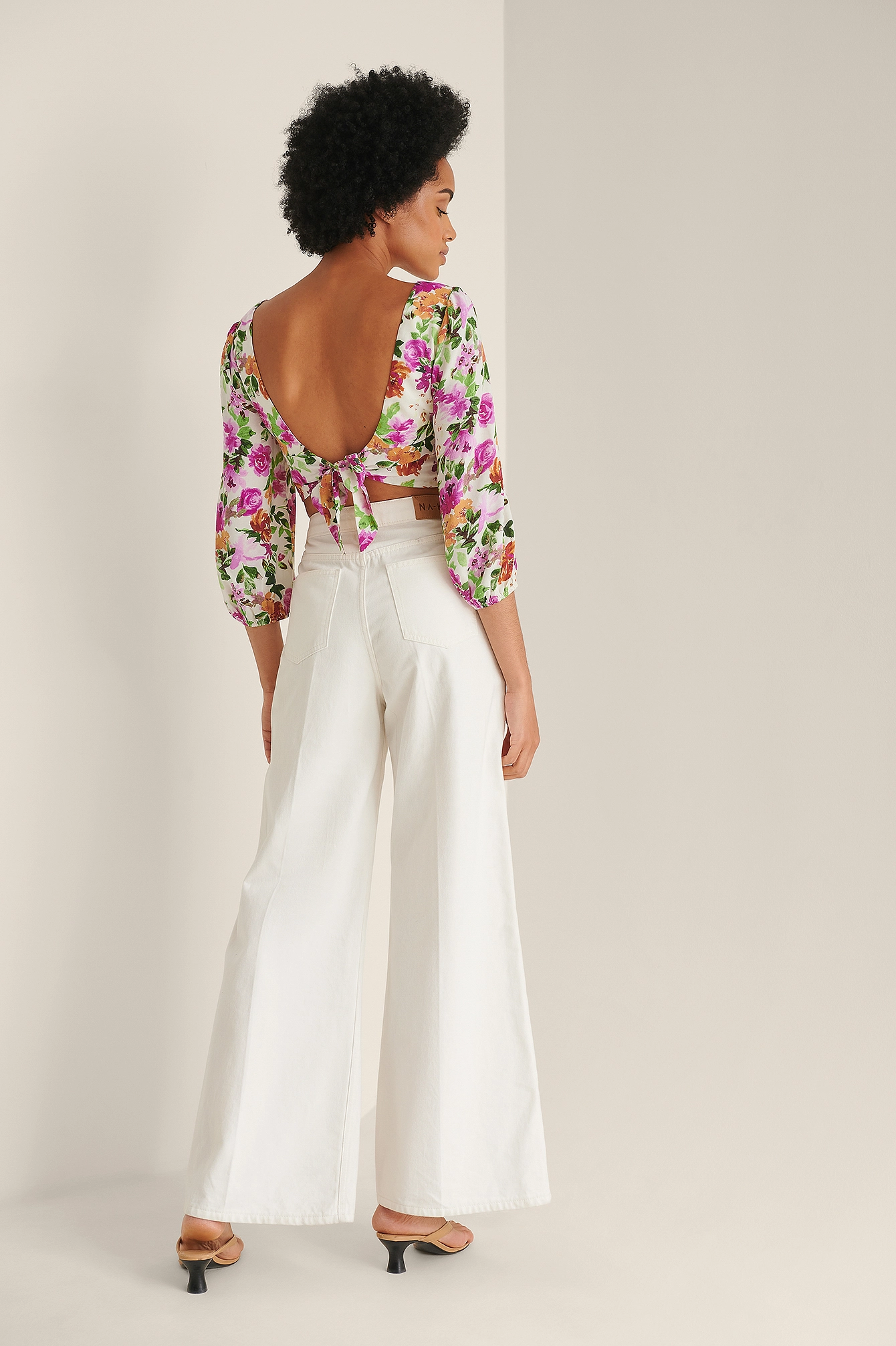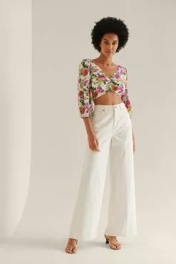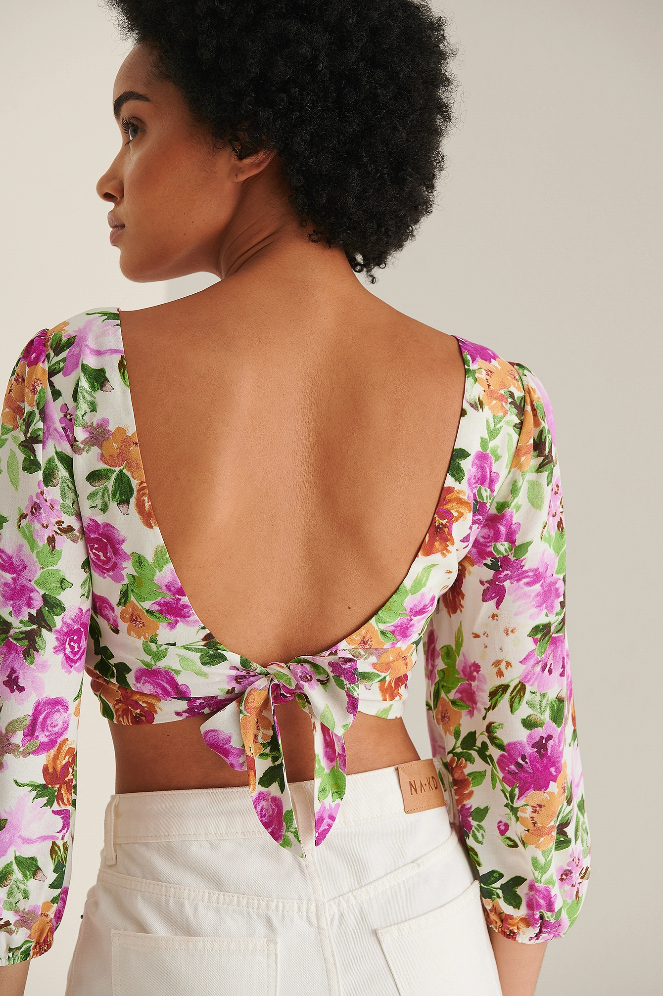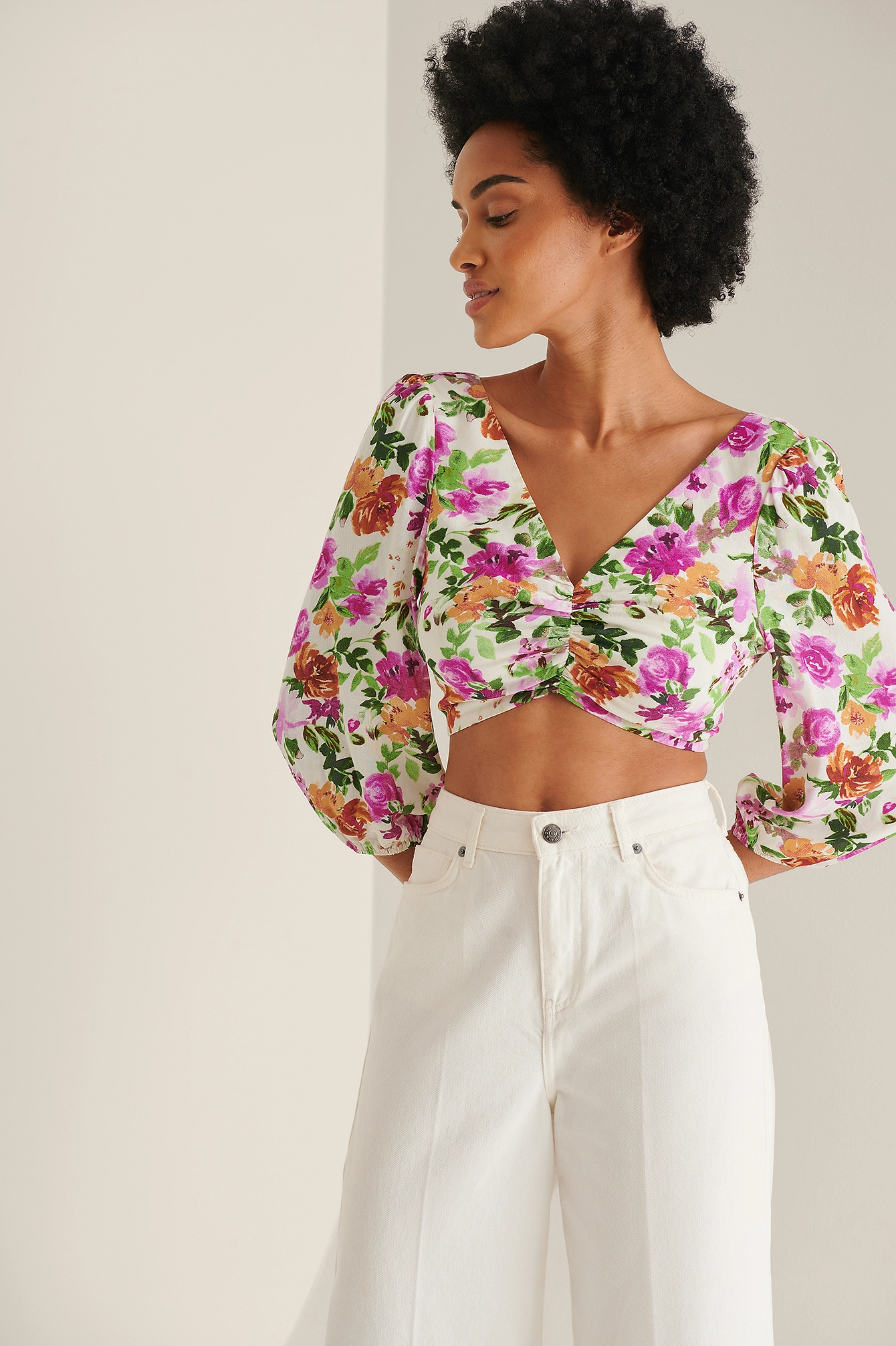 This blouse features a v neckline, long balloon sleeves with elasticized cuffs, a self-tie knot on the back, a ruched detail at the front and cropped length.
