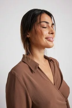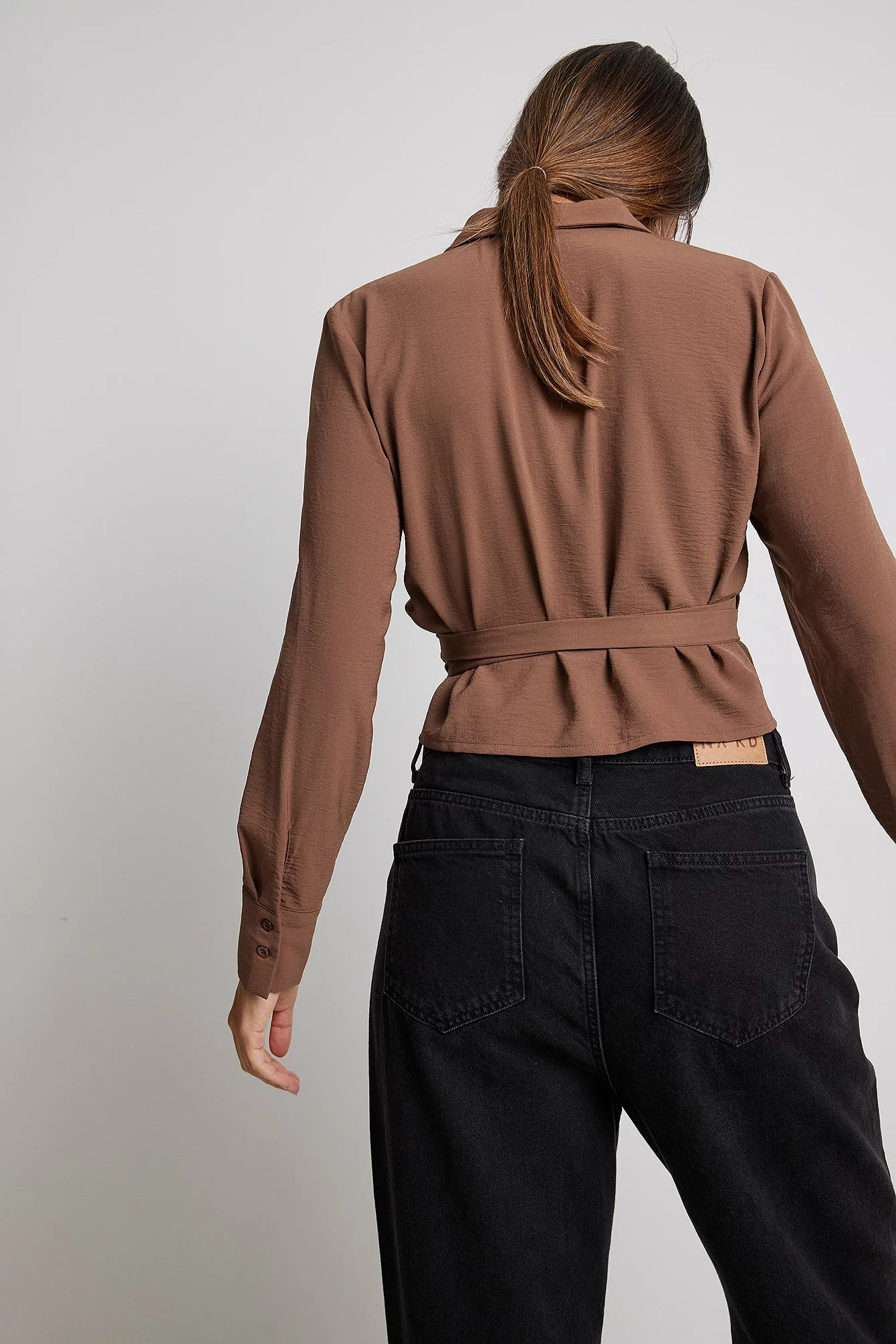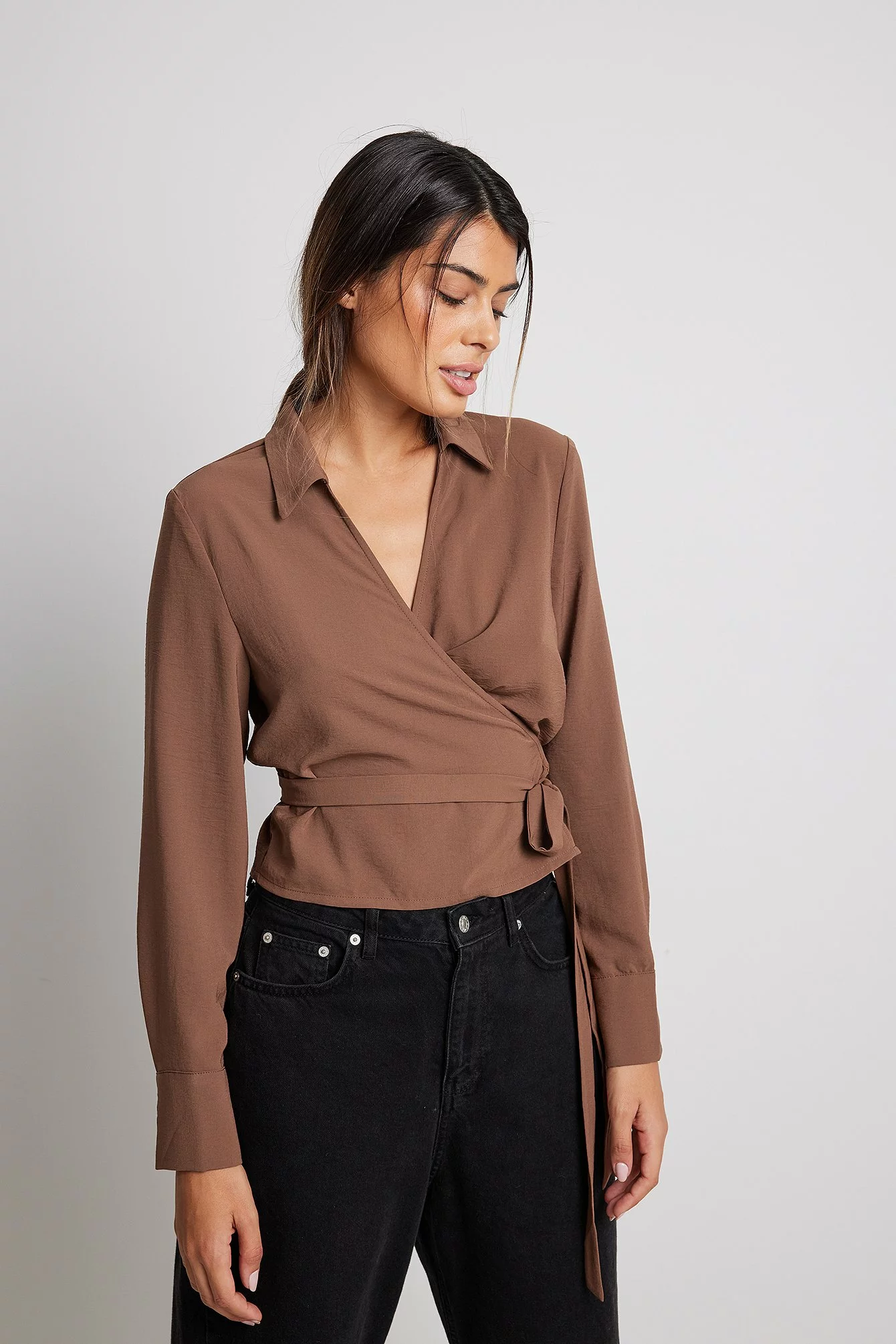This blouse features an open collar, an overlap design with self-tie bands at the bottom and long sleeves with two button cuffs.