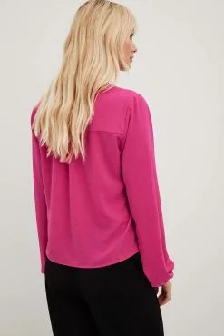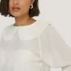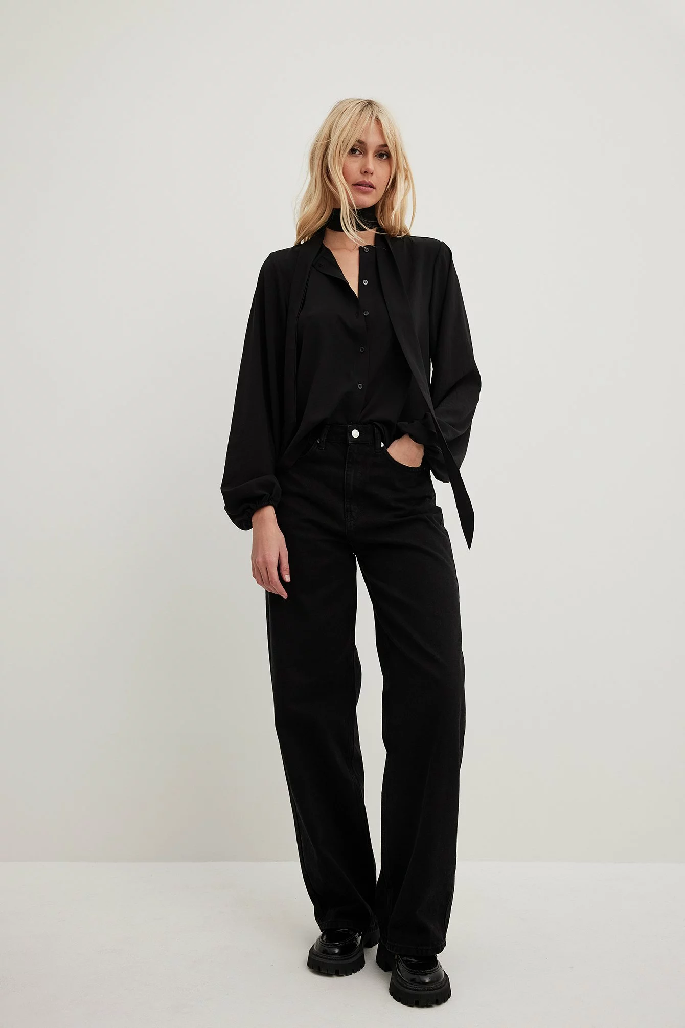 This blouse features a crew neckline. It has a detachable scarf design and puff sleeves. This blouse features button closure and a flowy fit.