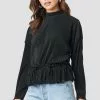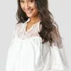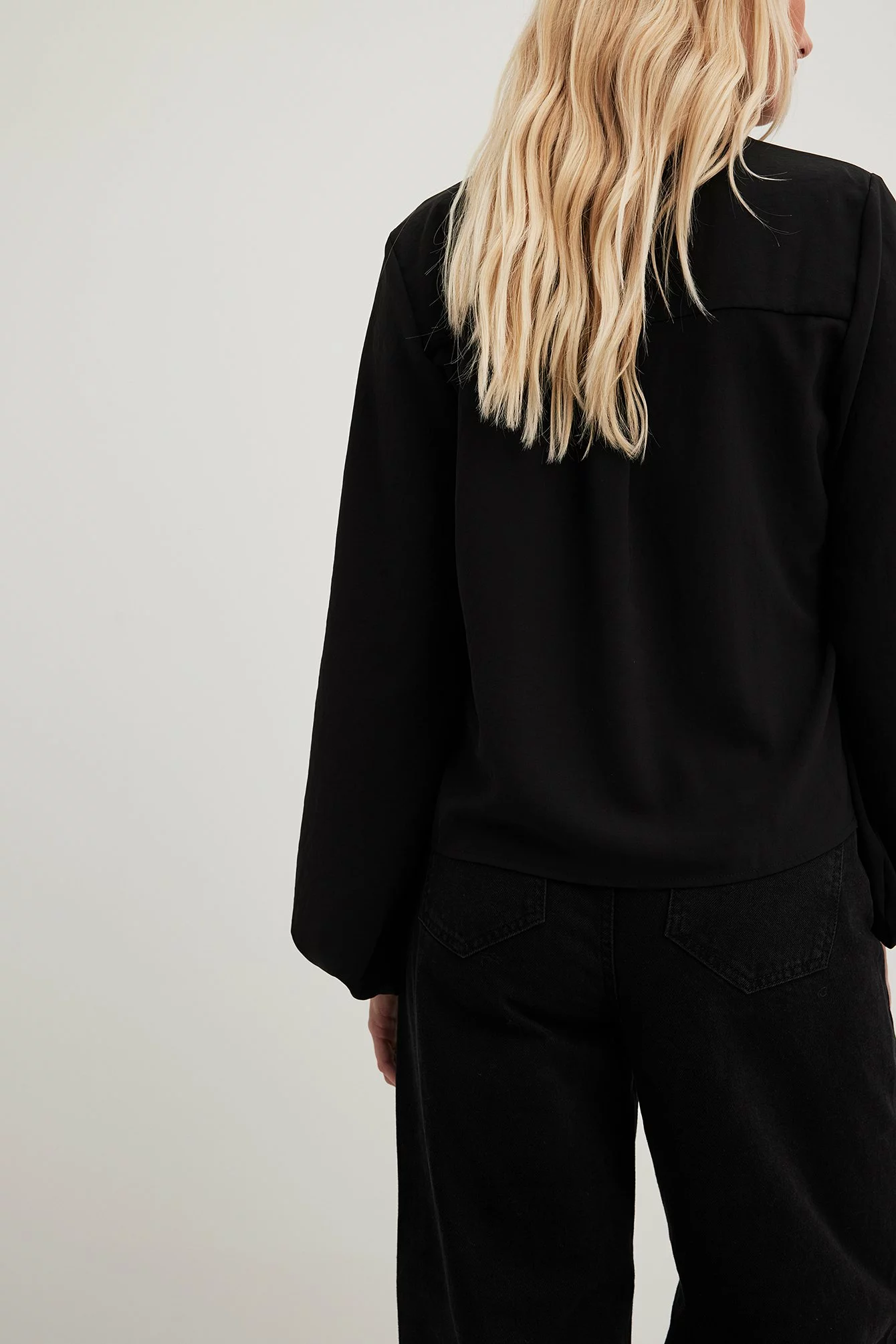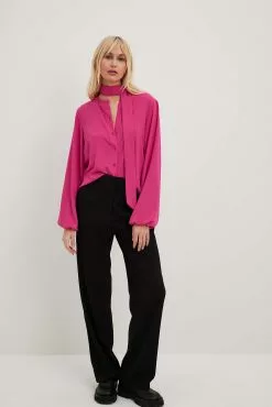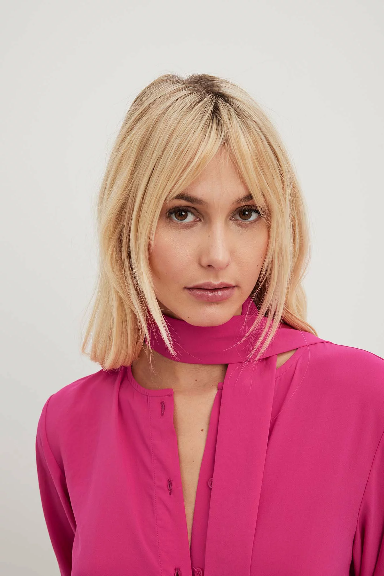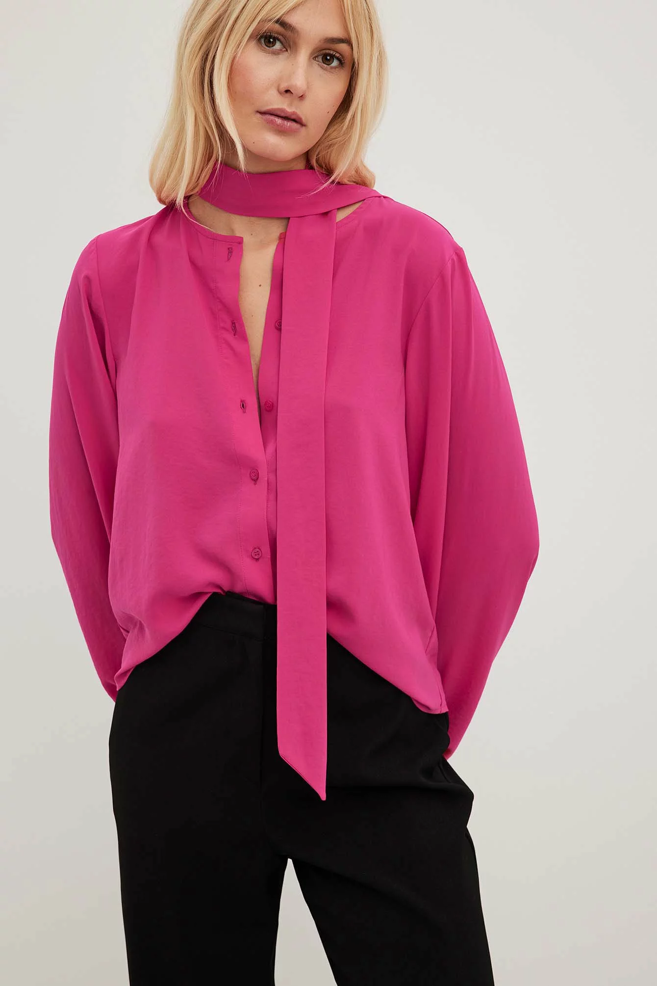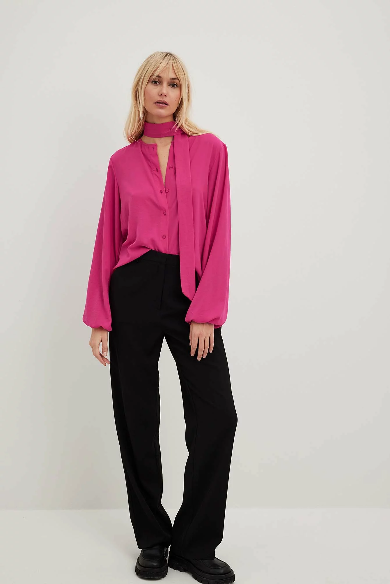 This blouse features a crew neckline. It has a detachable scarf design and puff sleeves. This blouse features button closure and a flowy fit.