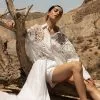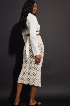 This shirt features a classic collar, a hidden button closure, long sleeves with small slits on the cuffs, a wrapped tie at the waist, cropped length and a light material in cotton.