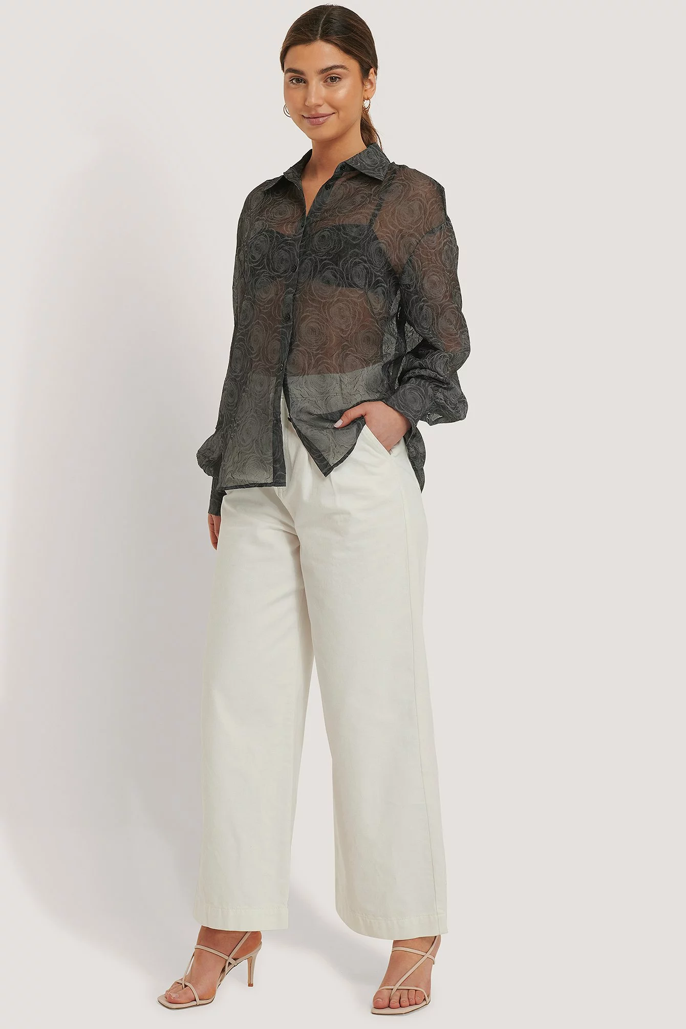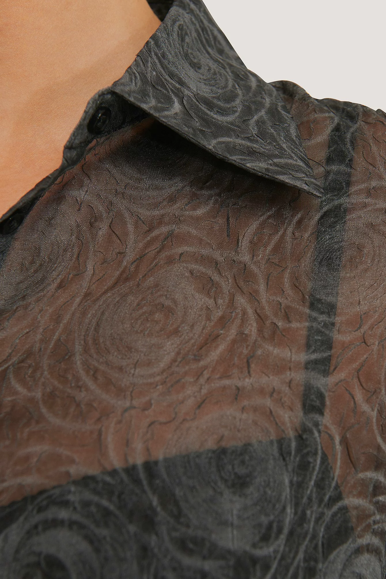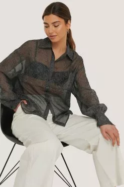 This shirt features a classic collar, long balloon sleeves with one button closure on the cuffs, button closures down the front, thin, discrete rose embroidery, a transparent material and an oversized fit.
