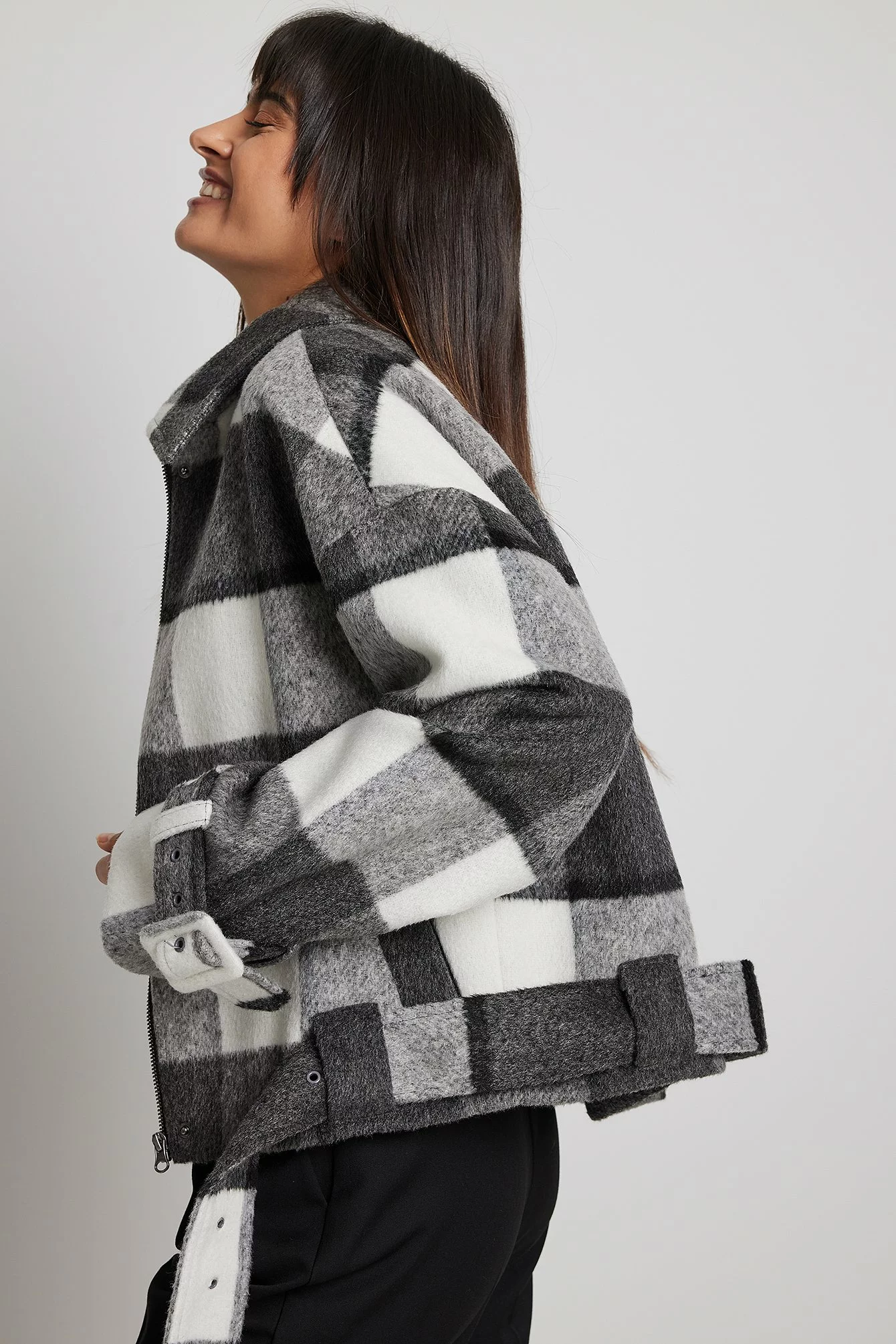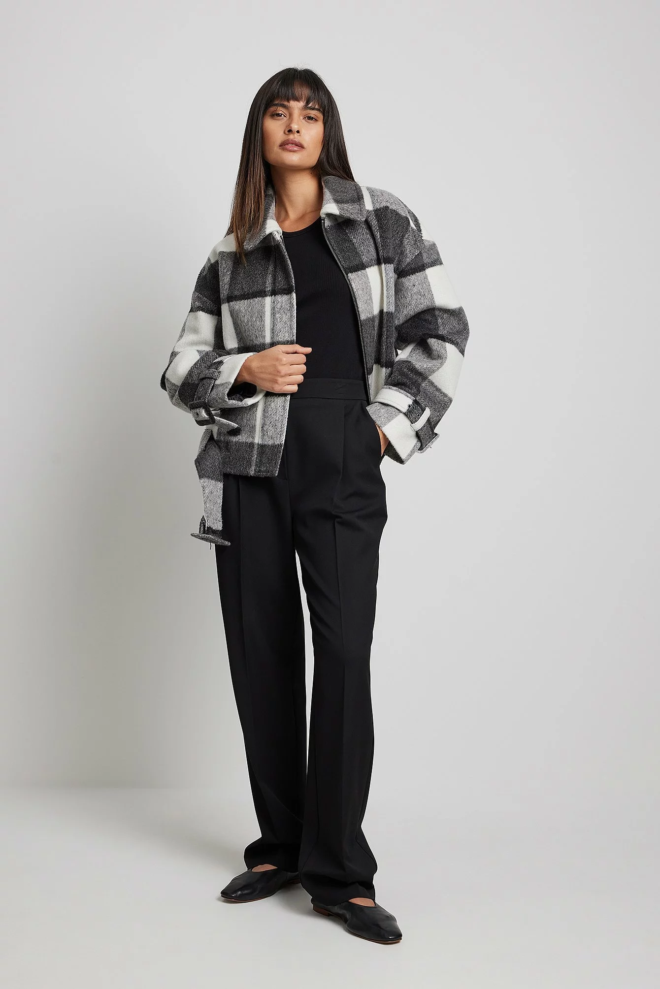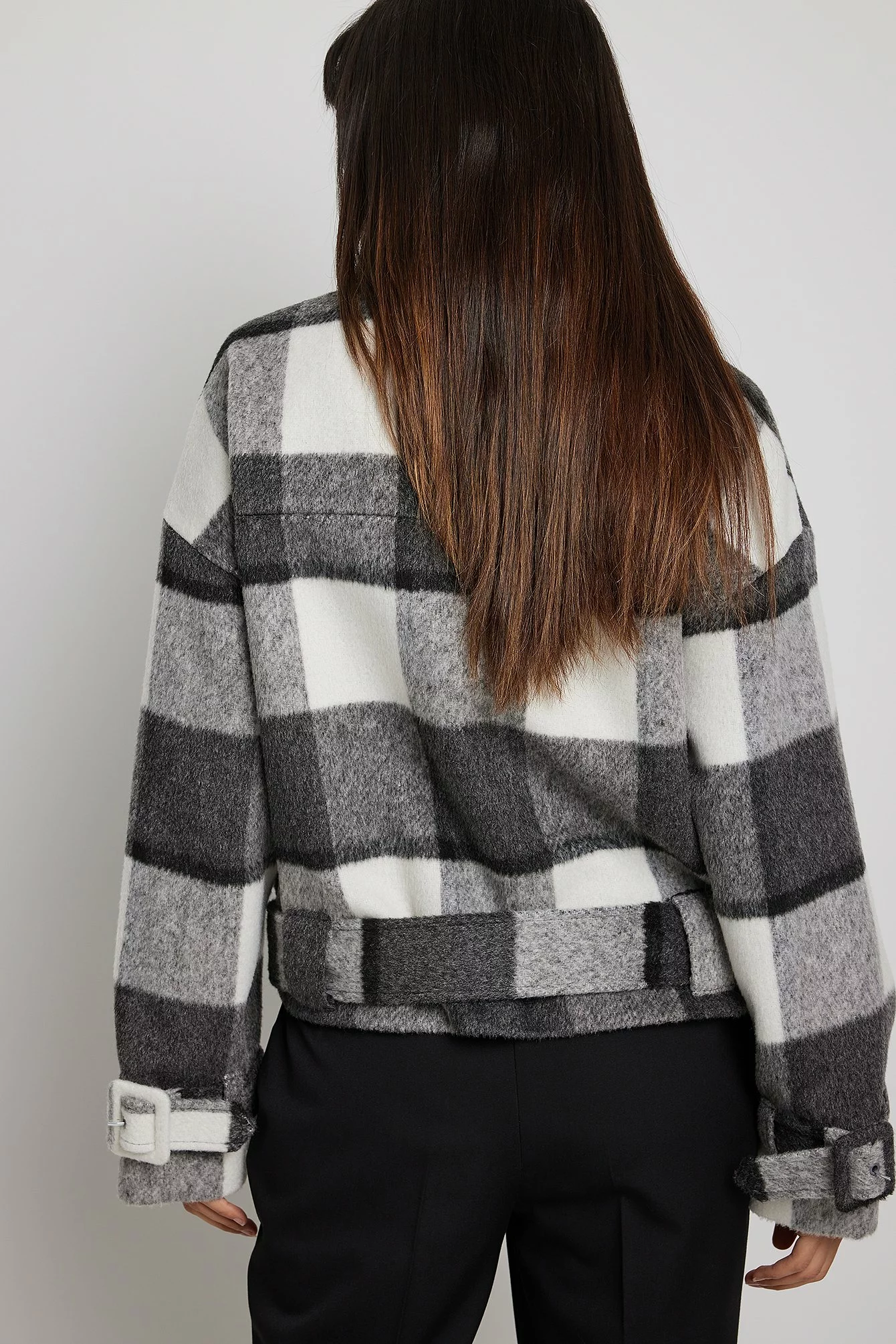 This jacket features a classic collar, a zip closure with a snap button, long sleeves with a belt detail, a belt detail at the bottom and a lining.