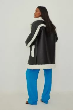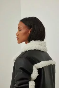 This coat is short and features a lining with a faux fur, a closure with a snap button and front pockets.