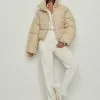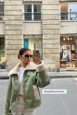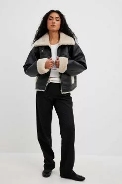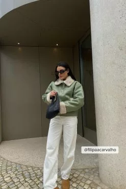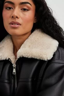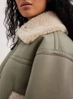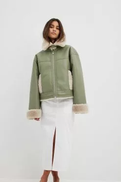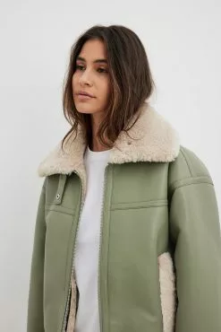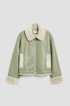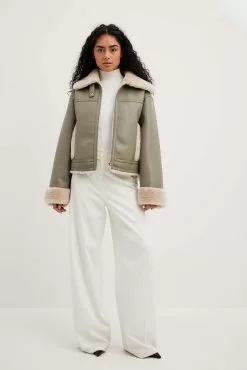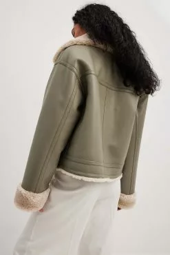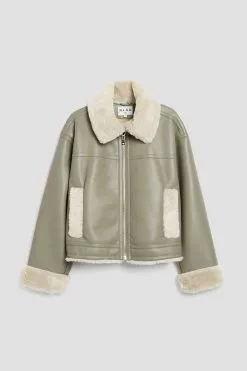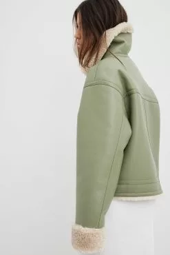 This jacket is bonded and features a teddy look on the inside and on the edges. It has a high neckline with a snap button closure and a zipper closure. This jacket features welt front pockets.