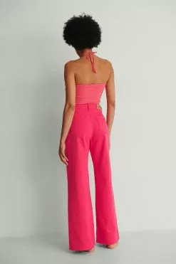 These jeans feature a high waist fit. They have belt loops and a zip and button closure. These jeans feature a five-pocket design, a wide fit with a wide leg and a rigid material.