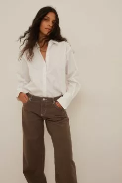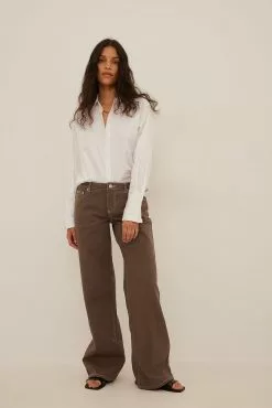 These jeans feature a low waist with a zipper fly and a silver-colored button, 5 pockets, metal, silver-colored details, contrast color seams and long, wide, straight legs.