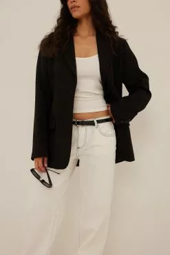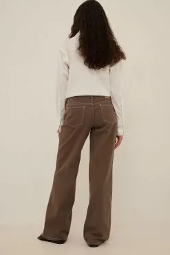 These jeans feature a low waist with a zipper fly and a silver-colored button, 5 pockets, metal, silver-colored details, contrast color seams and long, wide, straight legs.