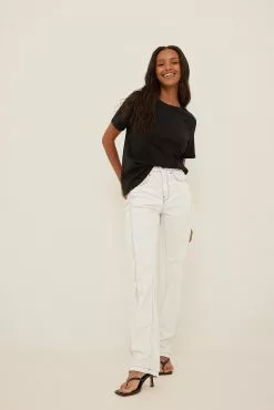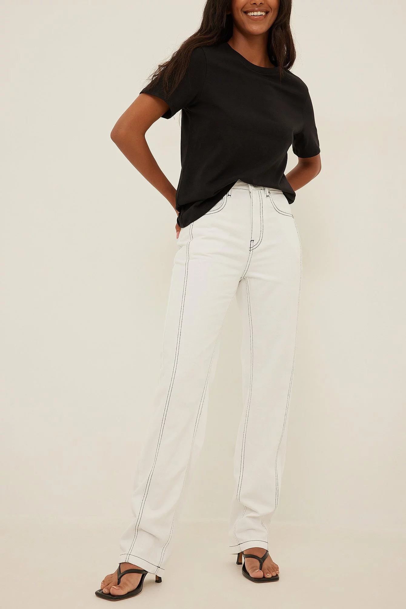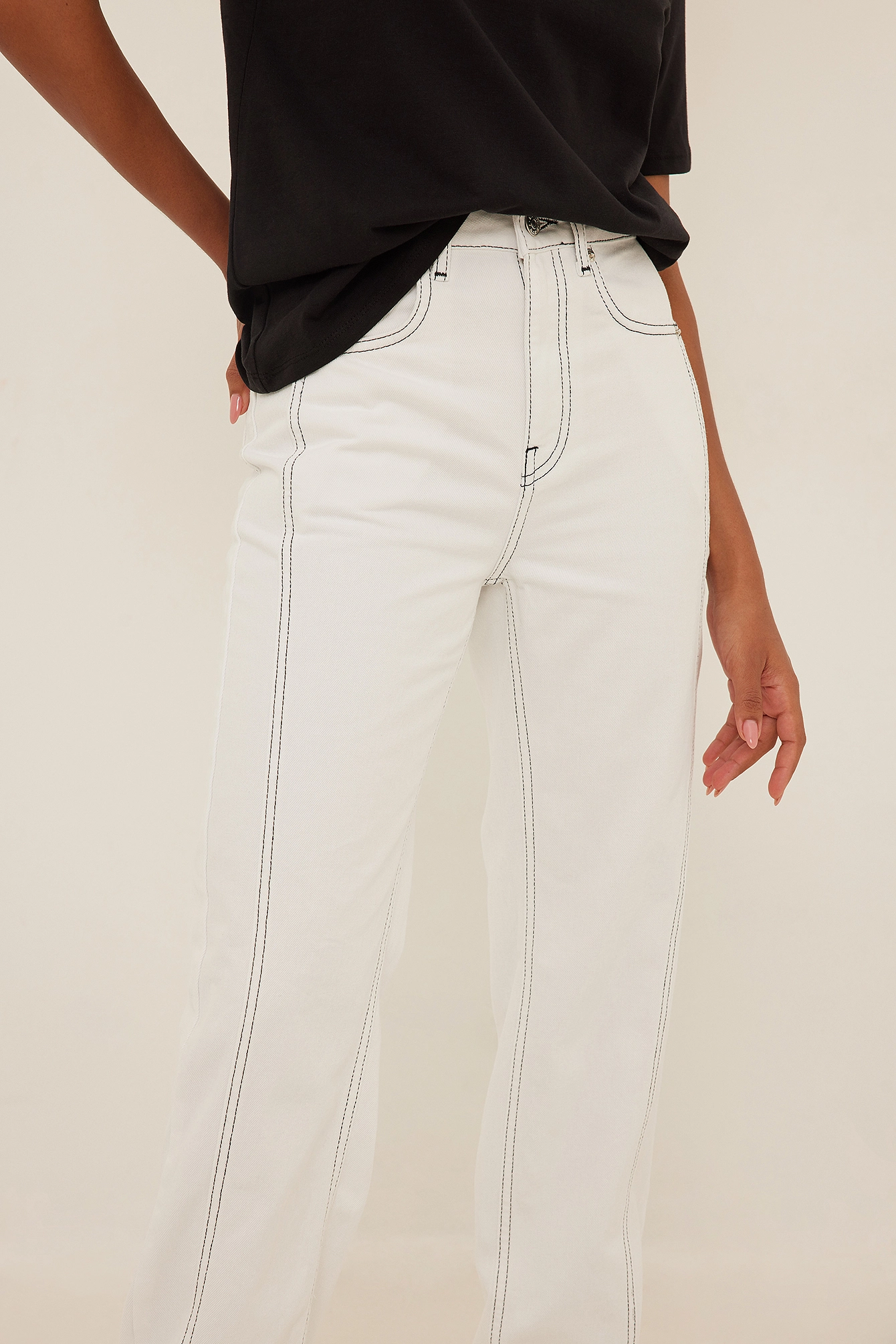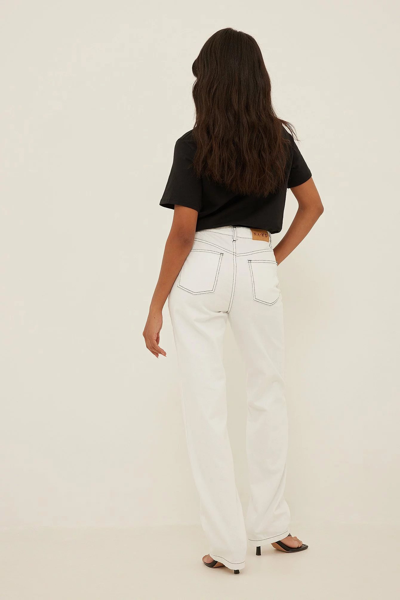 These 5-pocket jeans feature a high waist, a zip and button closure, a straight fit and colored seam details.