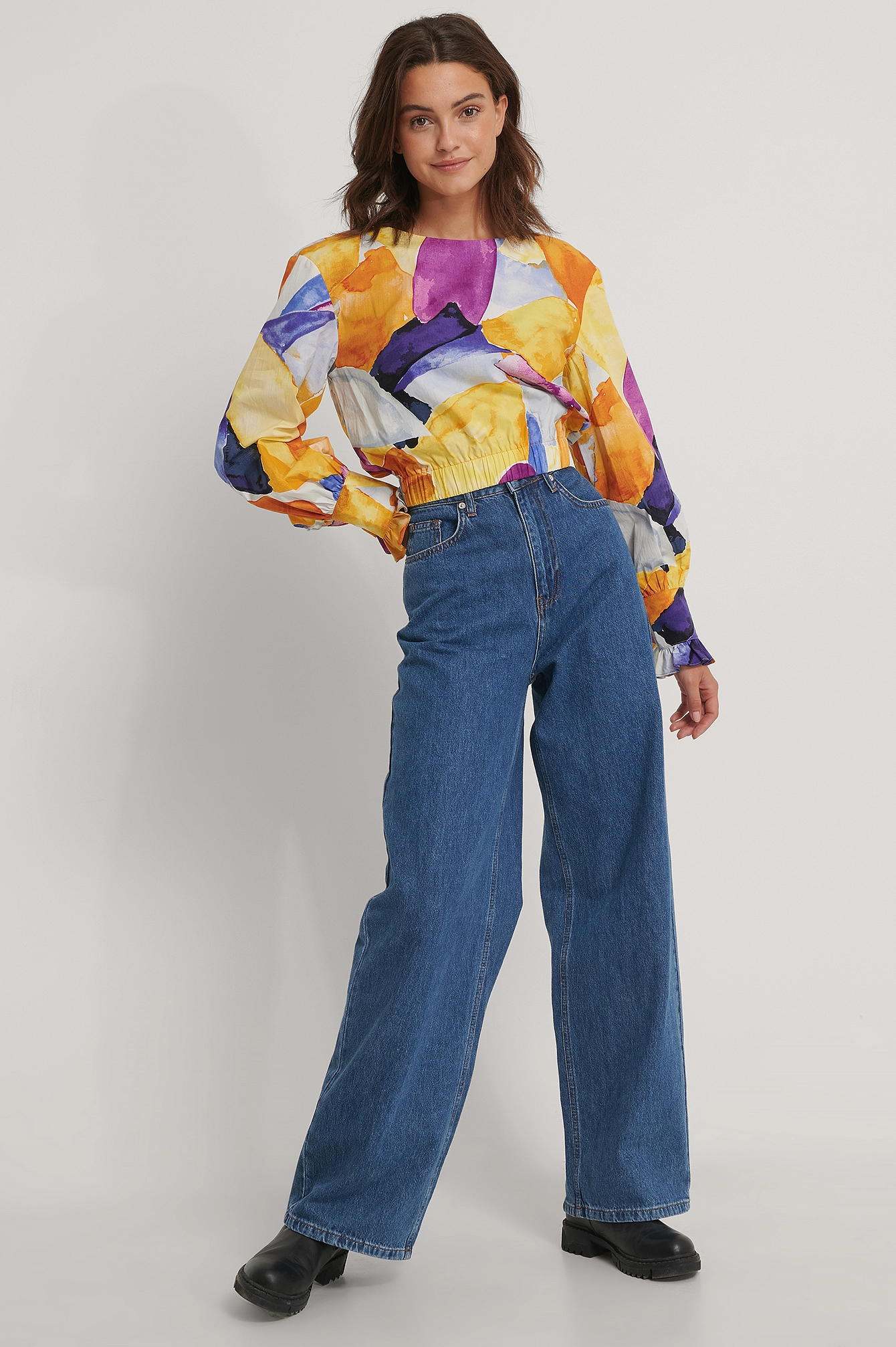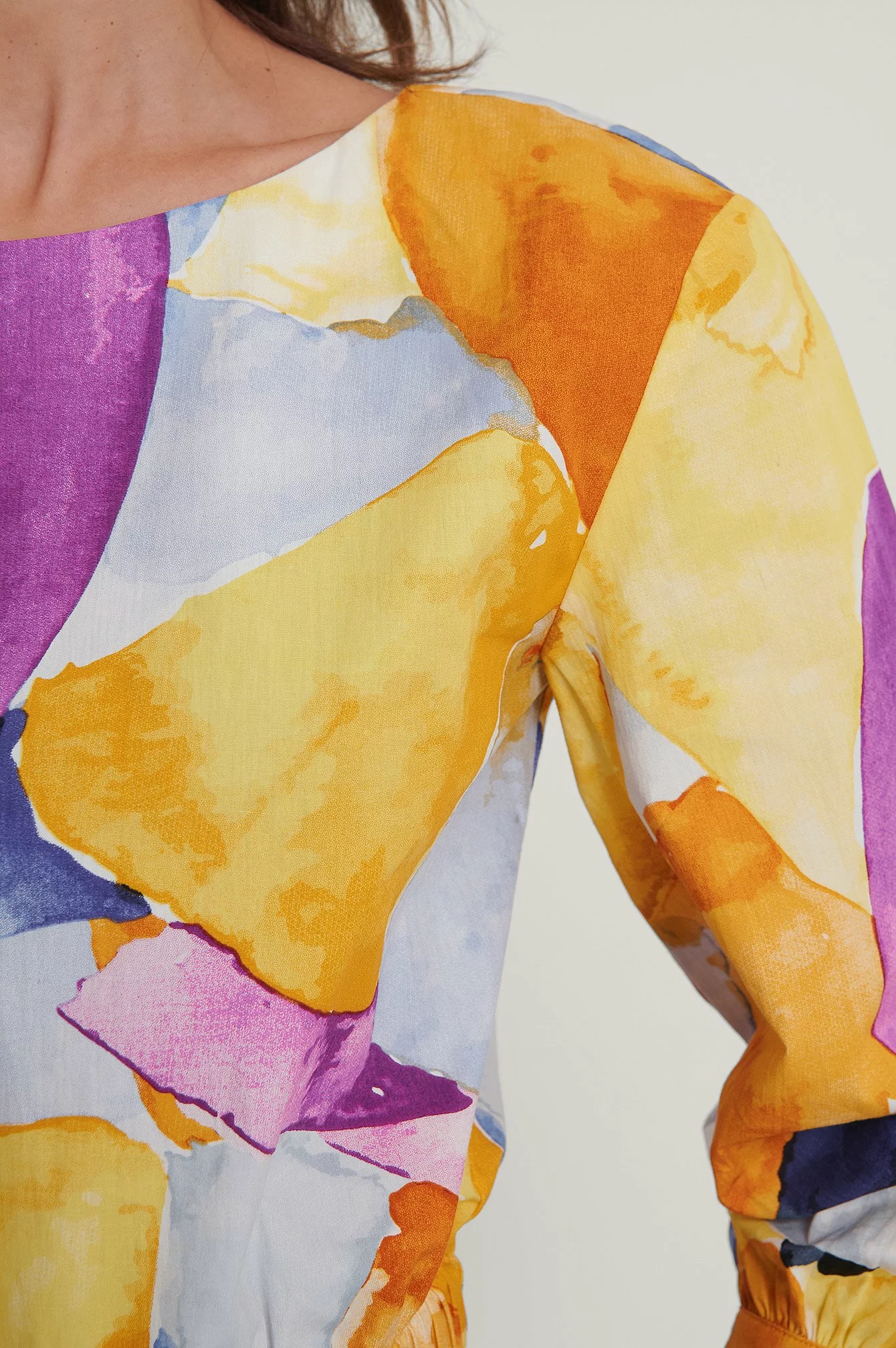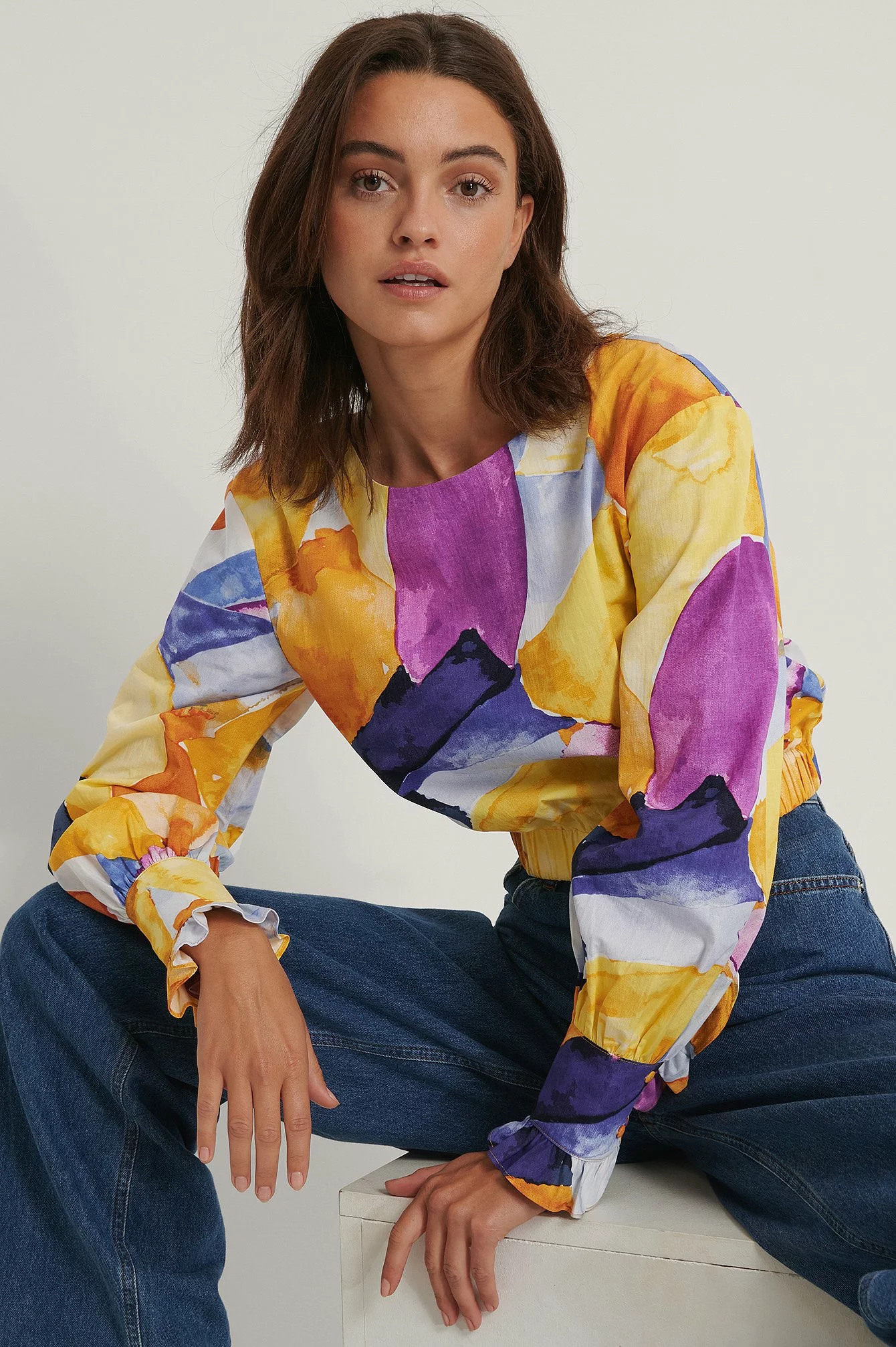 This blouse is detailed and features a cropped design, a wide rounded neckline, puffy long sleeves with double button cuffs, an elasticized waist and gathered seam details.