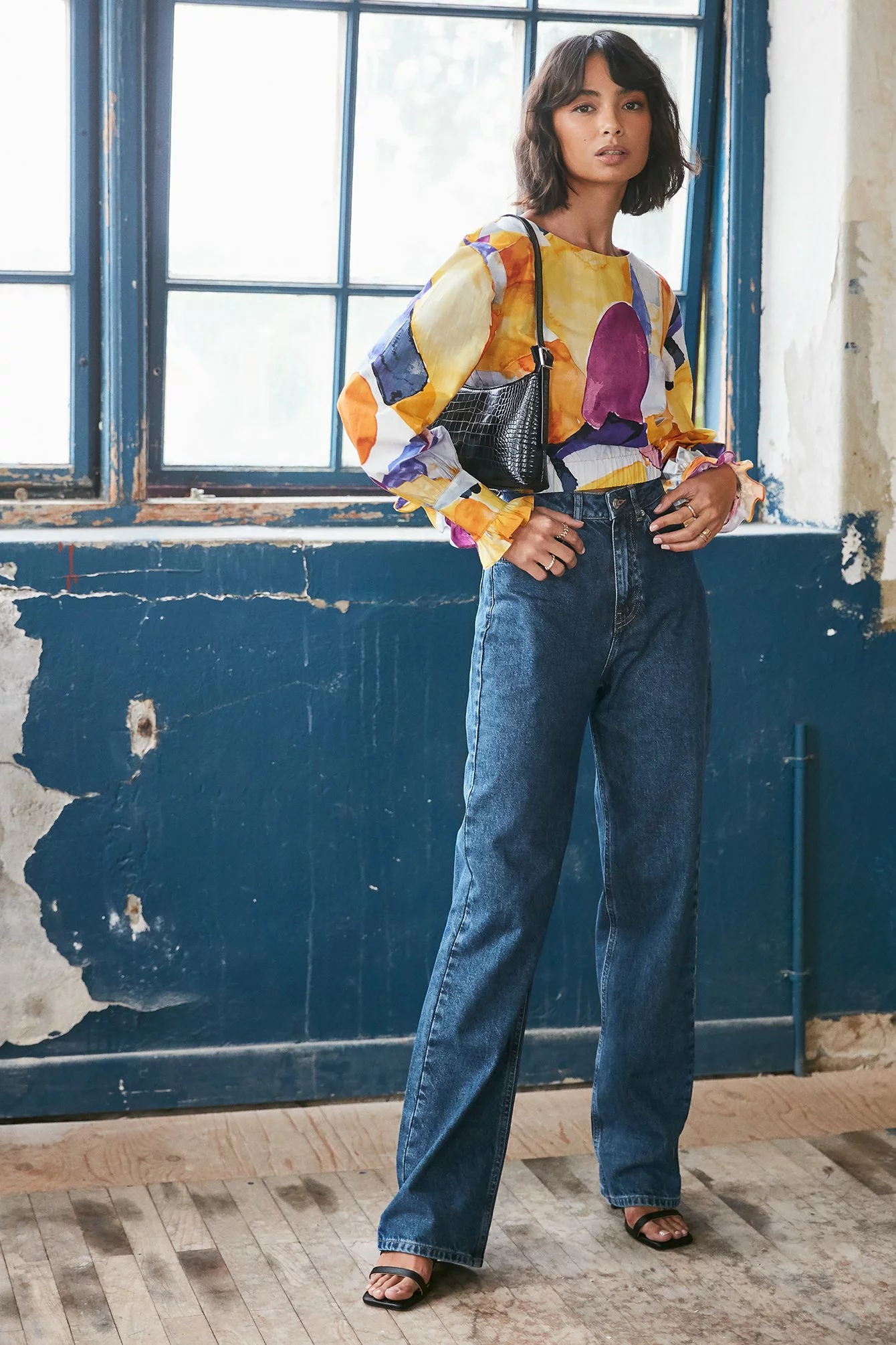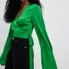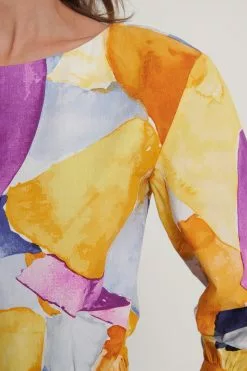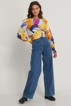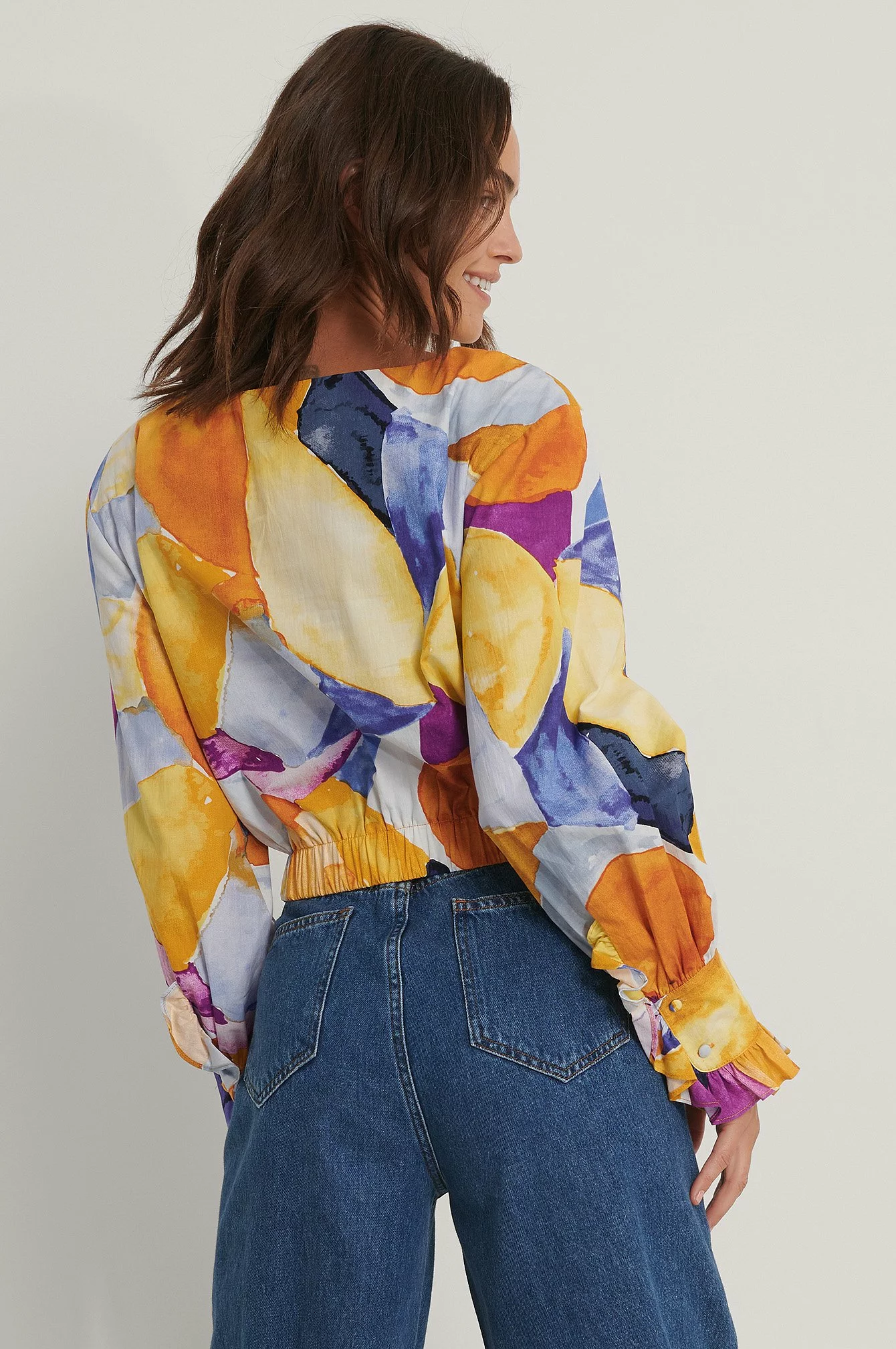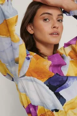 This blouse is detailed and features a cropped design, a wide rounded neckline, puffy long sleeves with double button cuffs, an elasticized waist and gathered seam details.