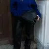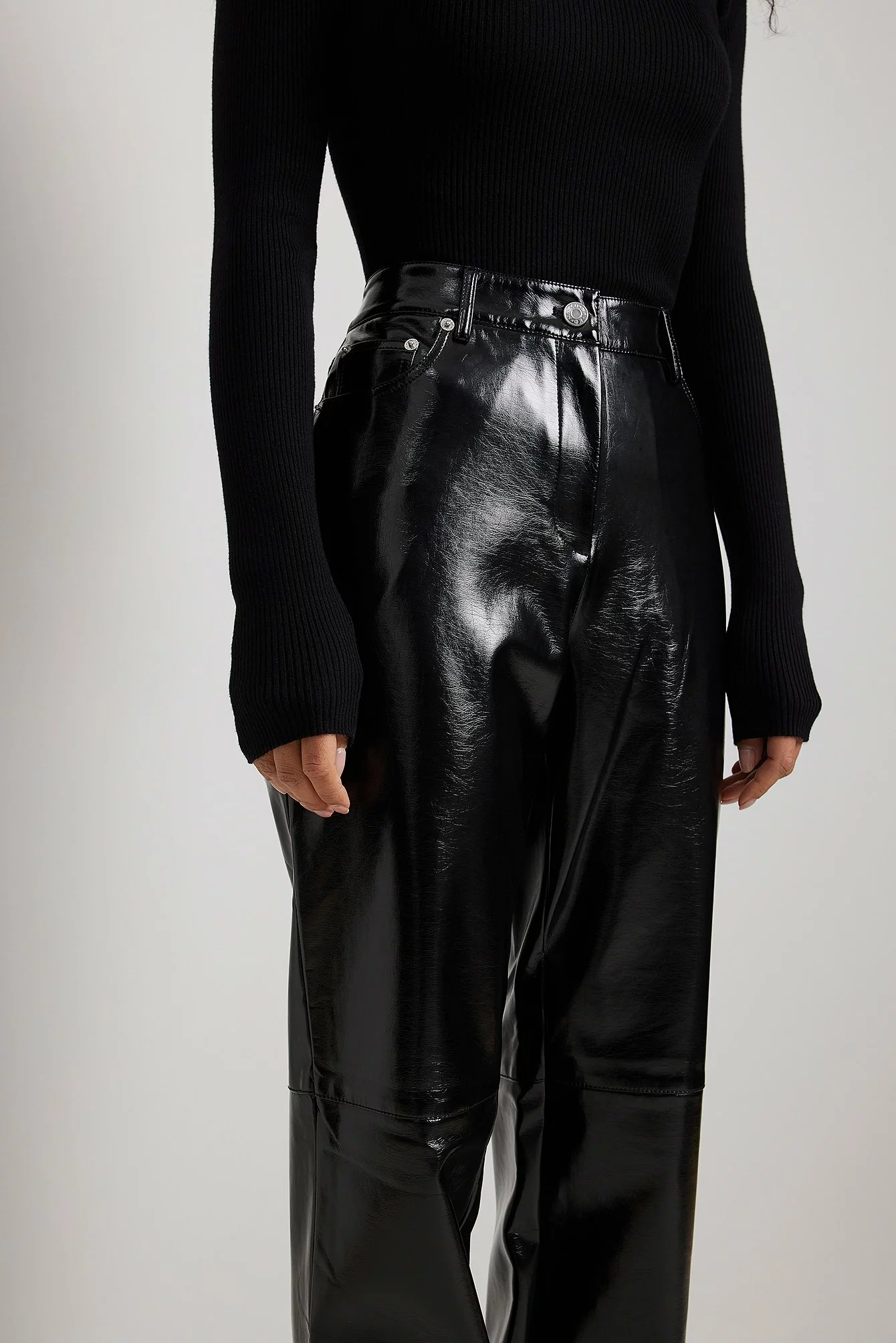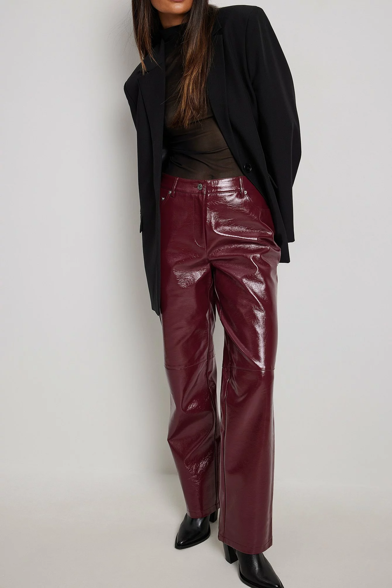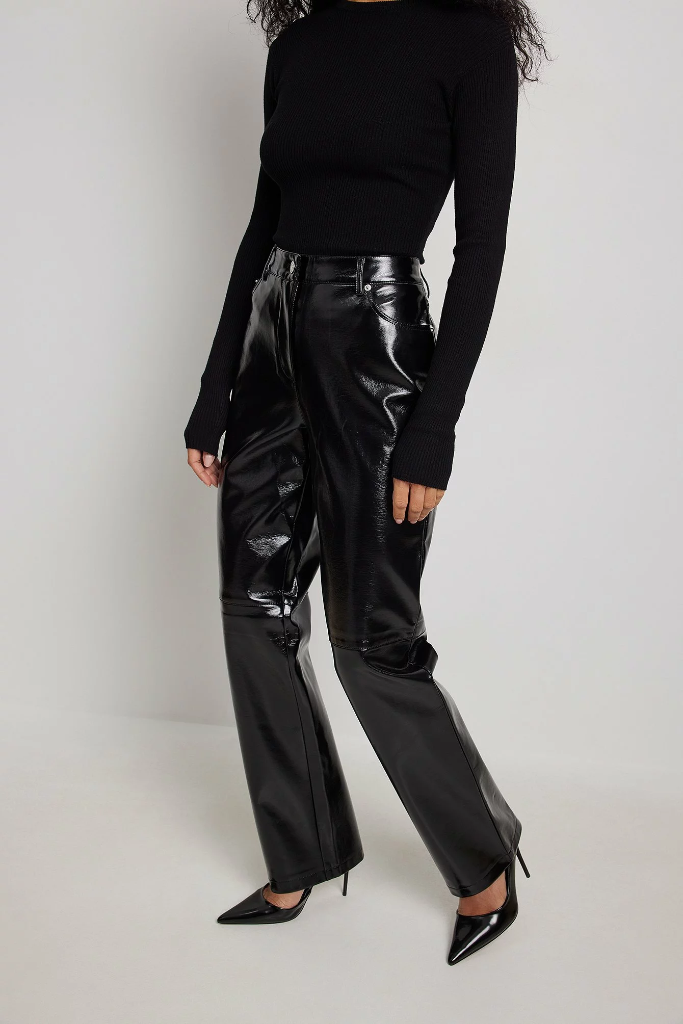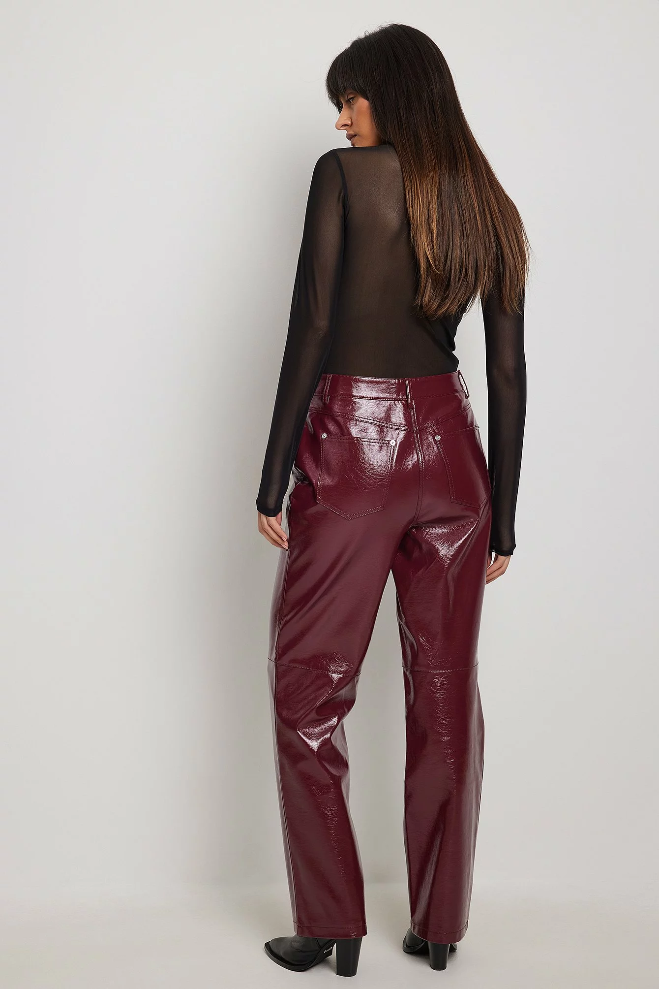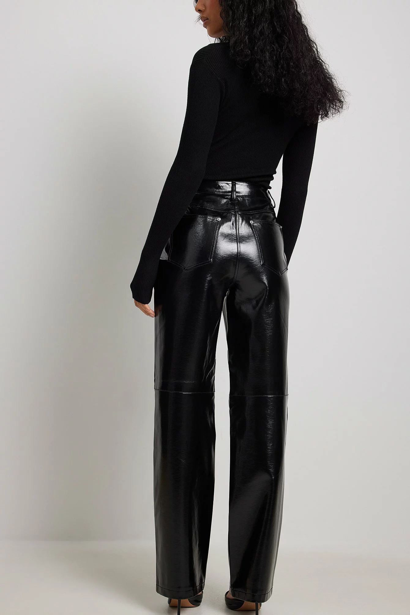 These trousers are shiny and made of PU and feature a vintage look. They have a straight fit and a high waist. These trousers feature side slanting pockets, back pockets and a seam detail on the leg. Inseam length in size 36: 81 cm / 31.88 in.