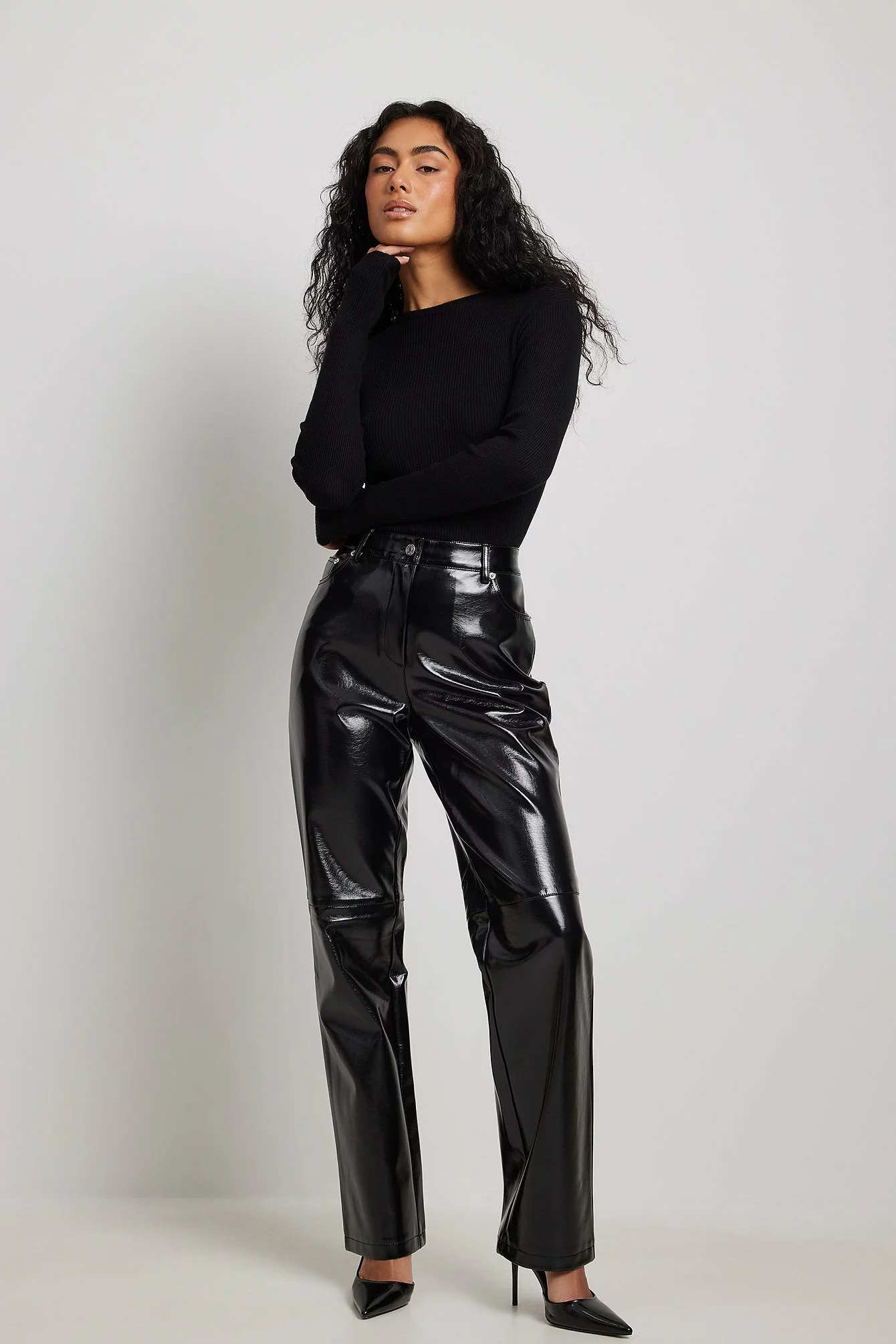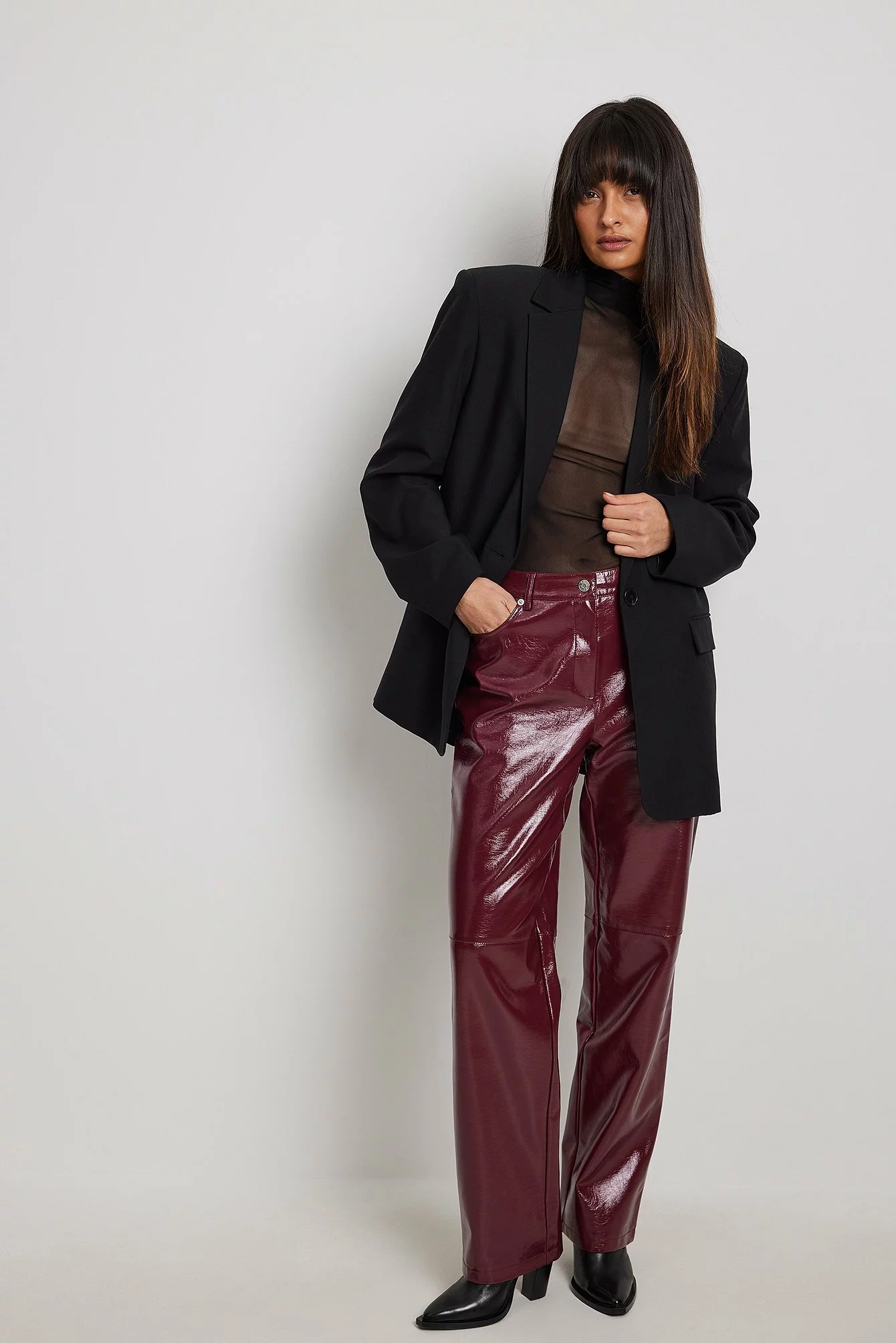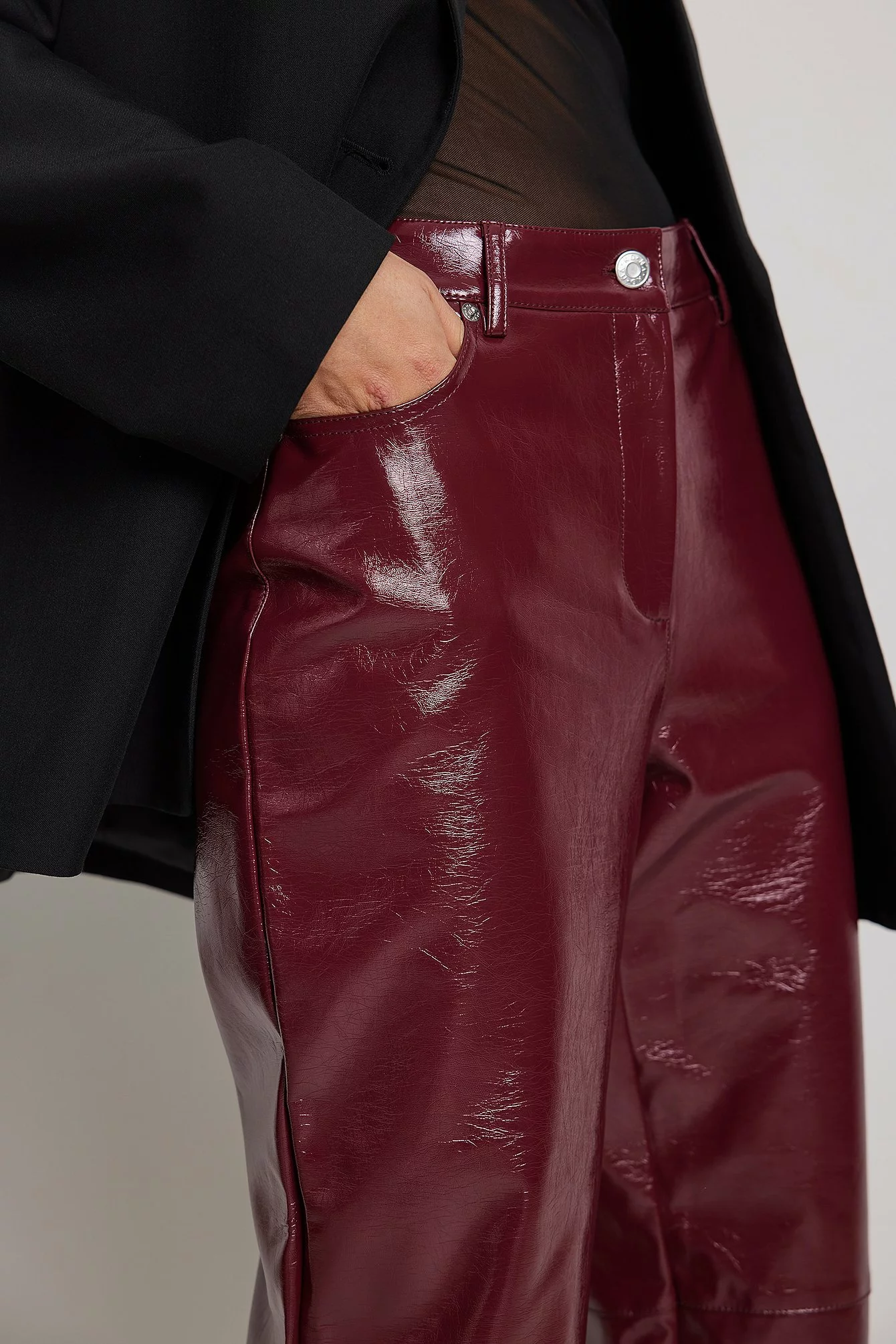 These trousers are shiny and made of PU and feature a vintage look. They have a straight fit and a high waist. These trousers feature side slanting pockets, back pockets and a seam detail on the leg. Inseam length in size 36: 81 cm / 31.88 in.
