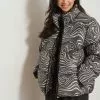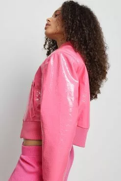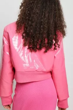This jacket features a bomber silhouette, a faux crocodile material, an elasticized waist and cuff, front pockets and a zipper closure.