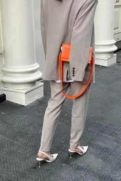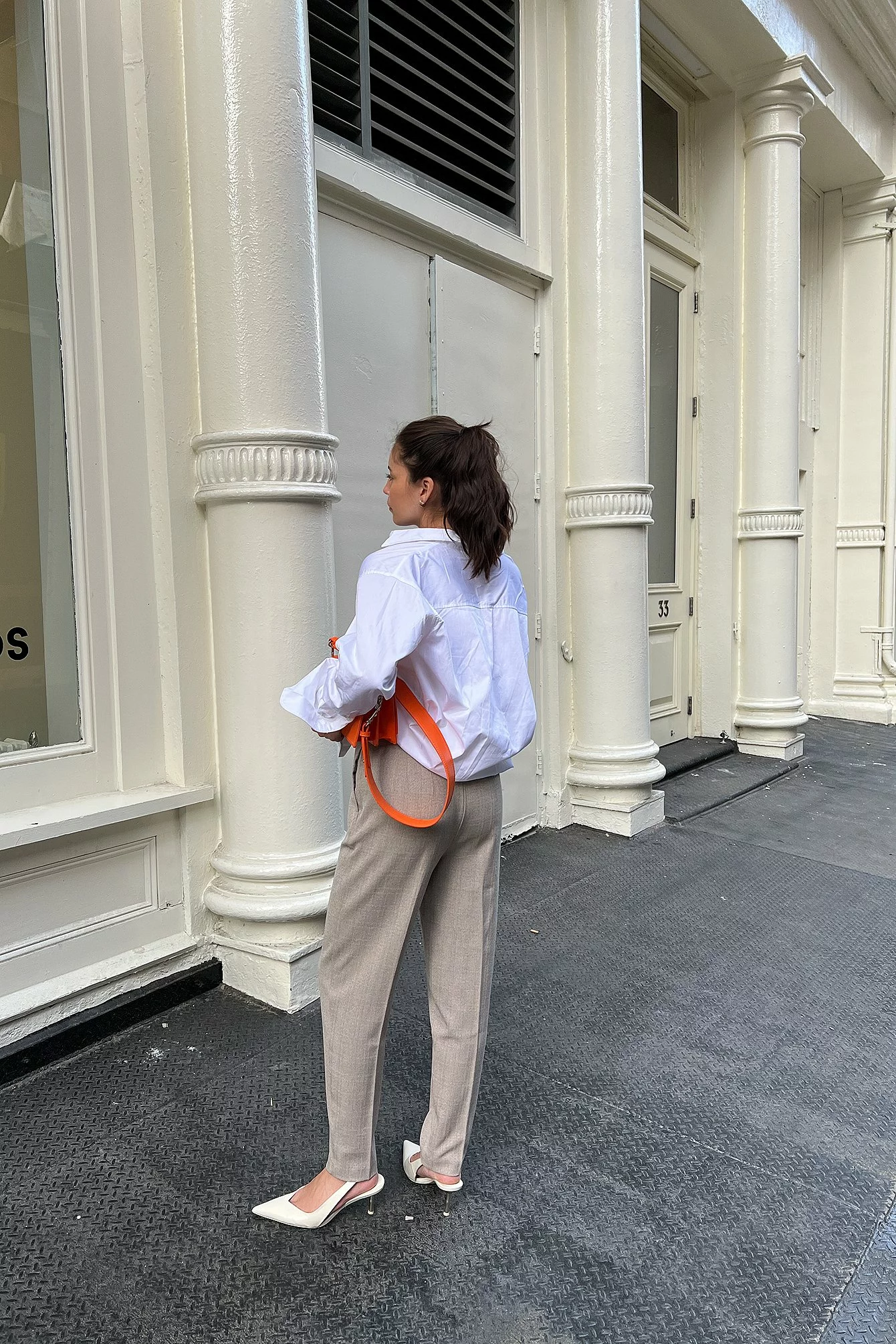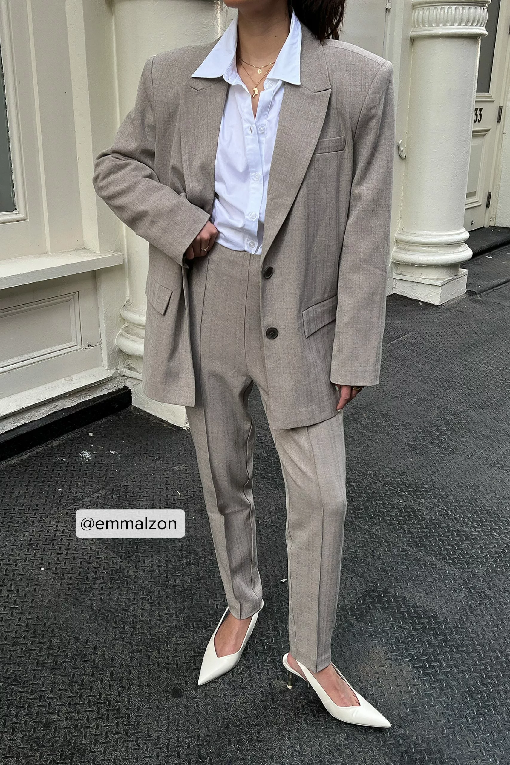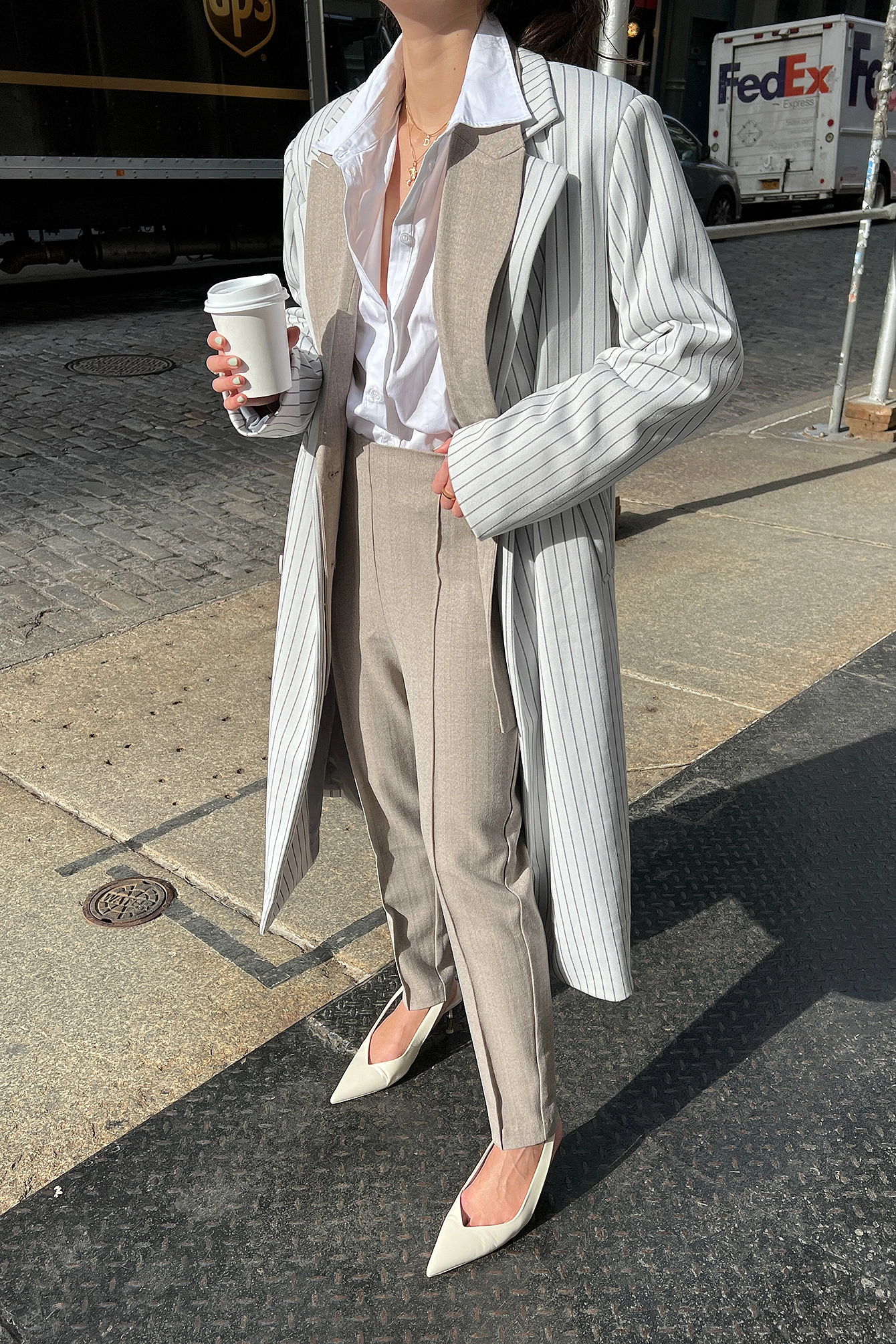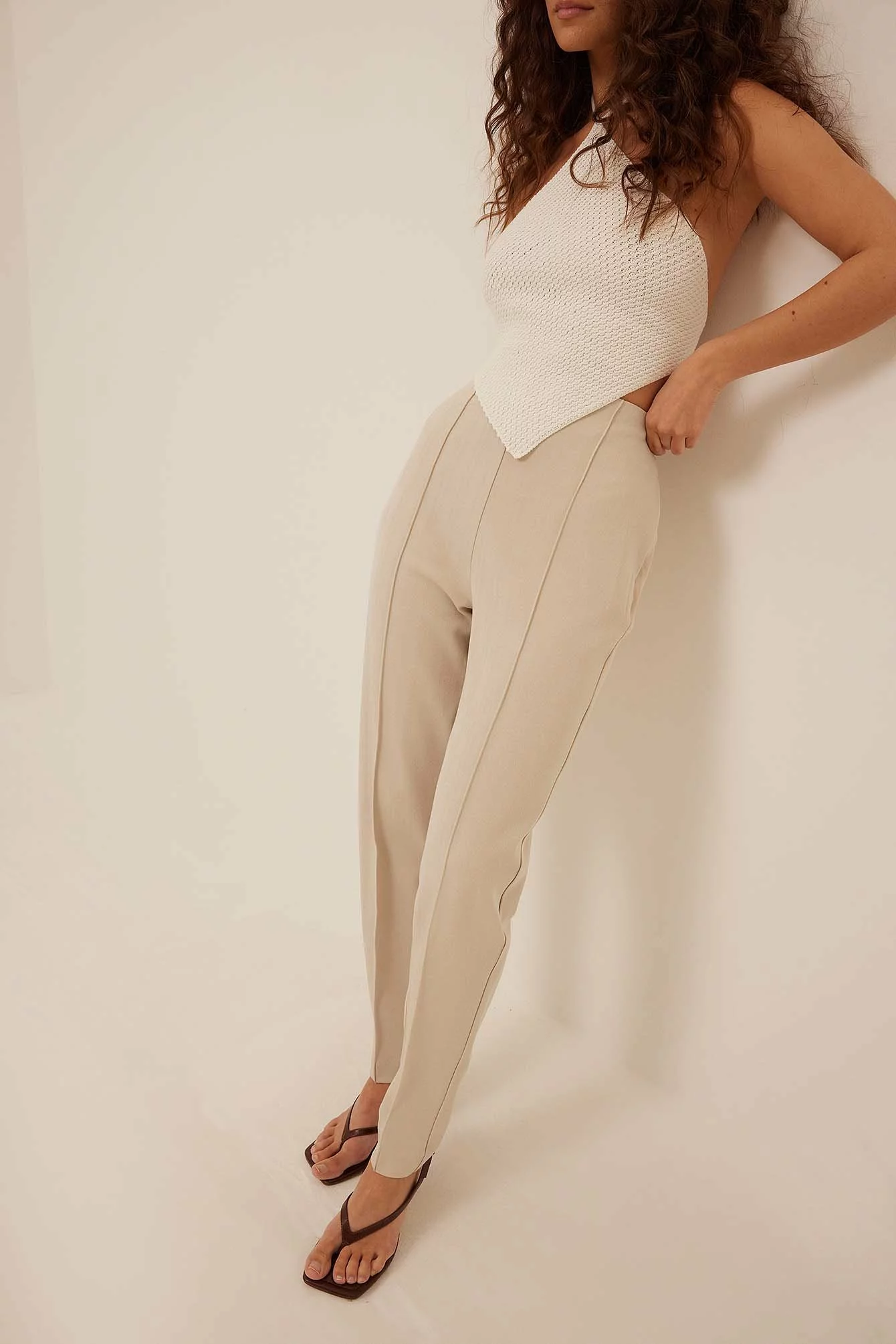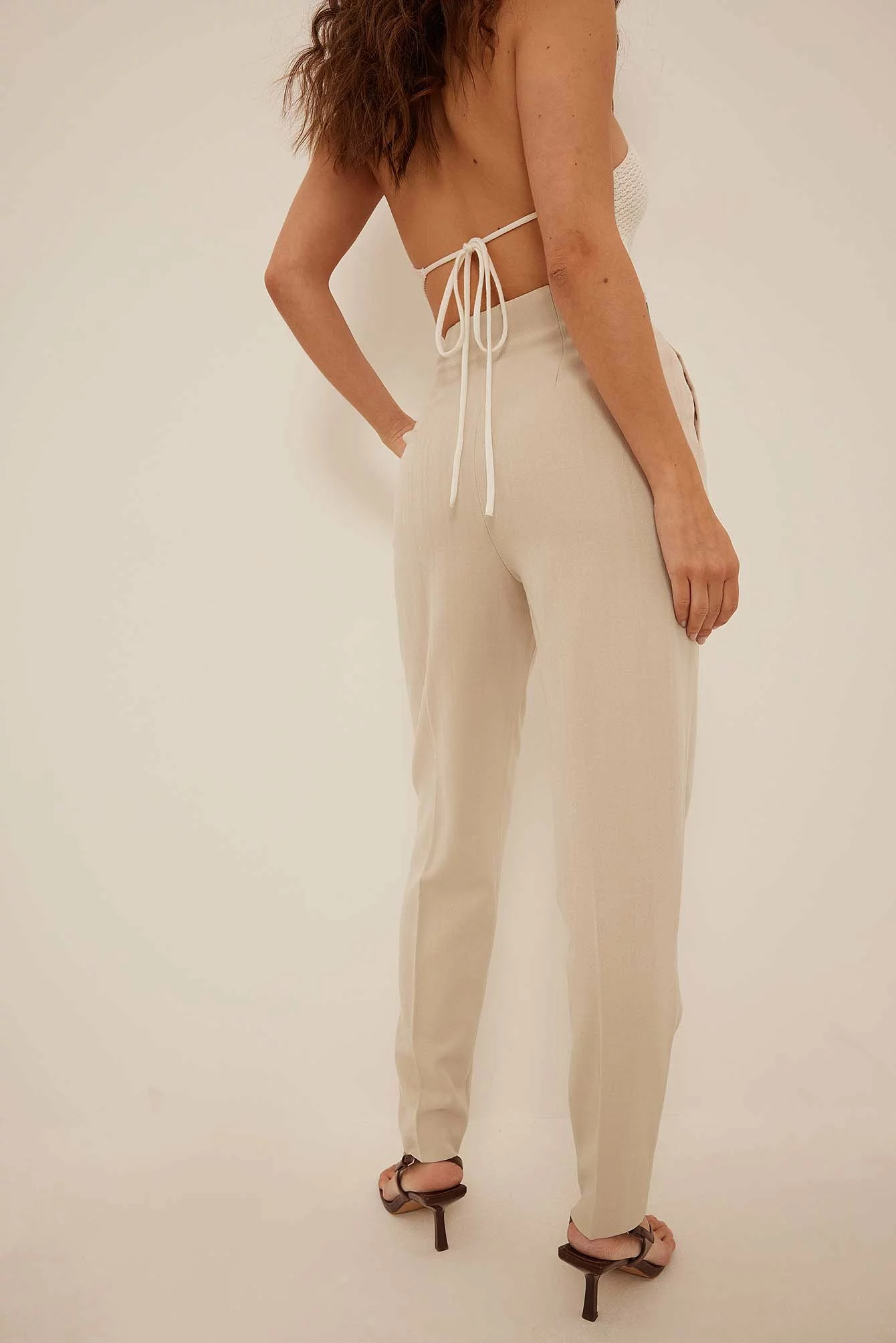 These suit pants feature a high waist with a side zipper closure, side slanting pockets, seam details and cropped length.