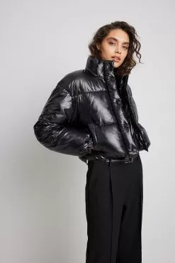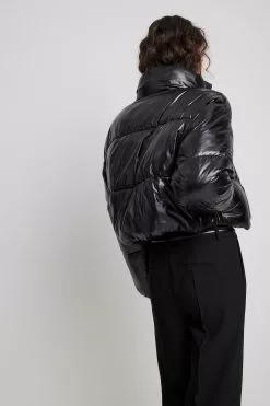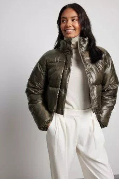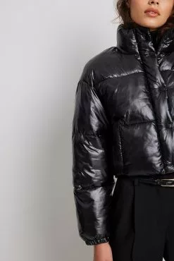 This jacket is padded and features a high collar, long sleeves with elasticized cuffs, side pockets, a zipper and button closure, a drawstring detail and cropped length.