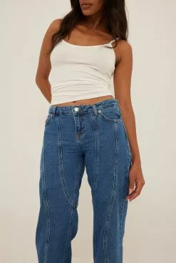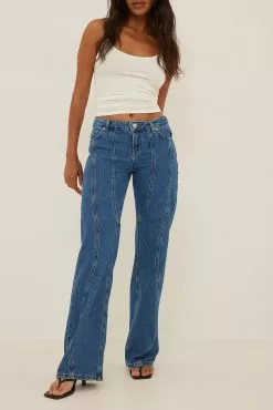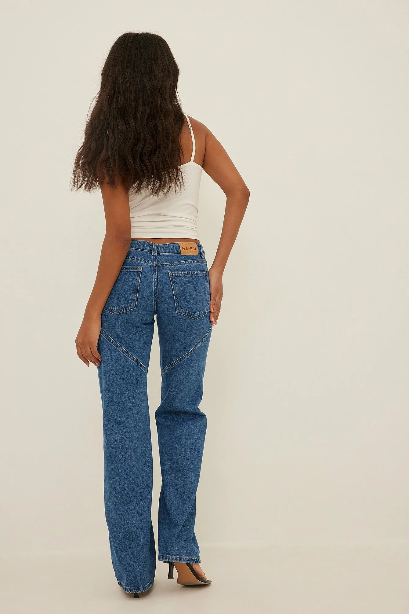 These jeans feature a five-pocket design, curved seams on each leg and a straight design.