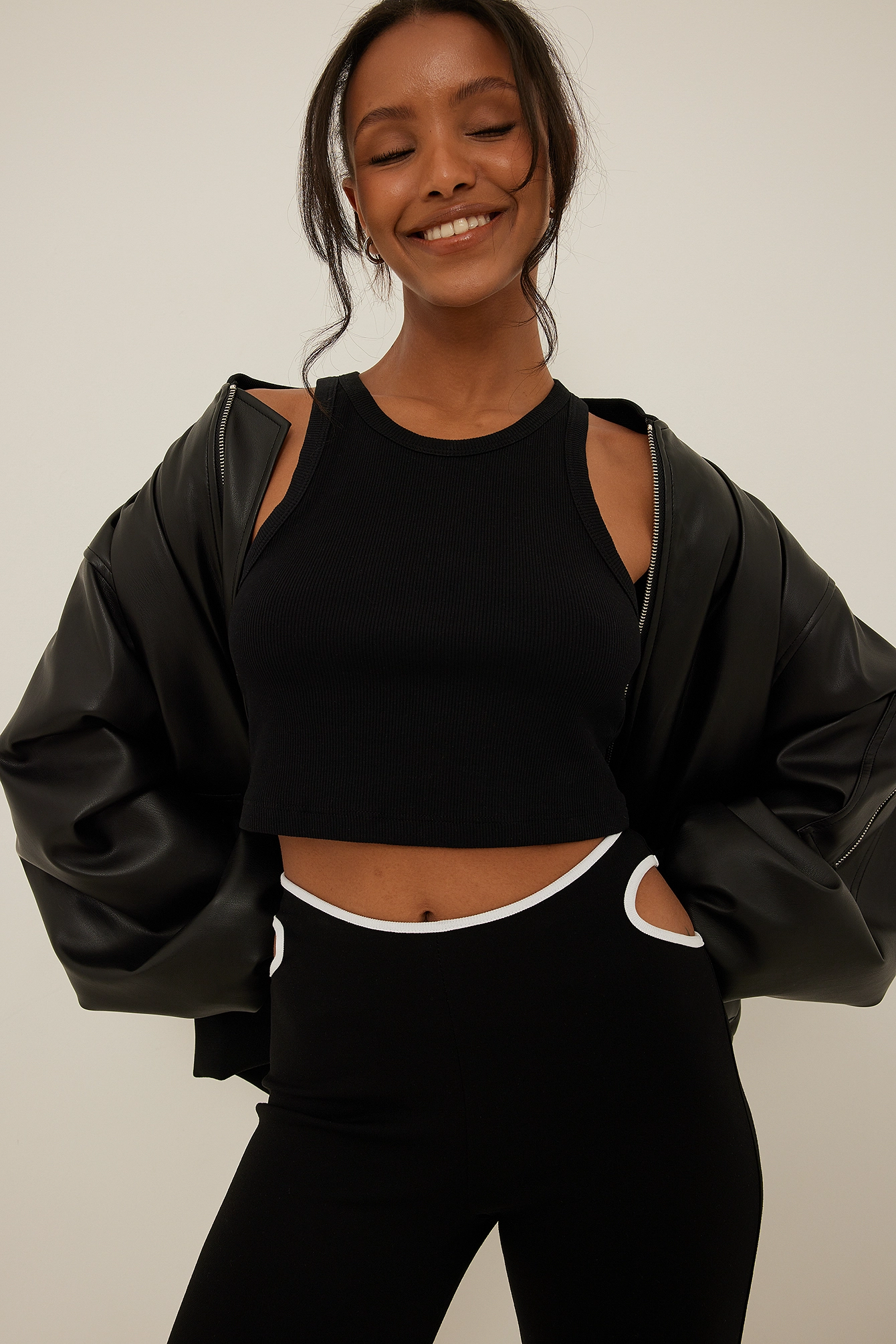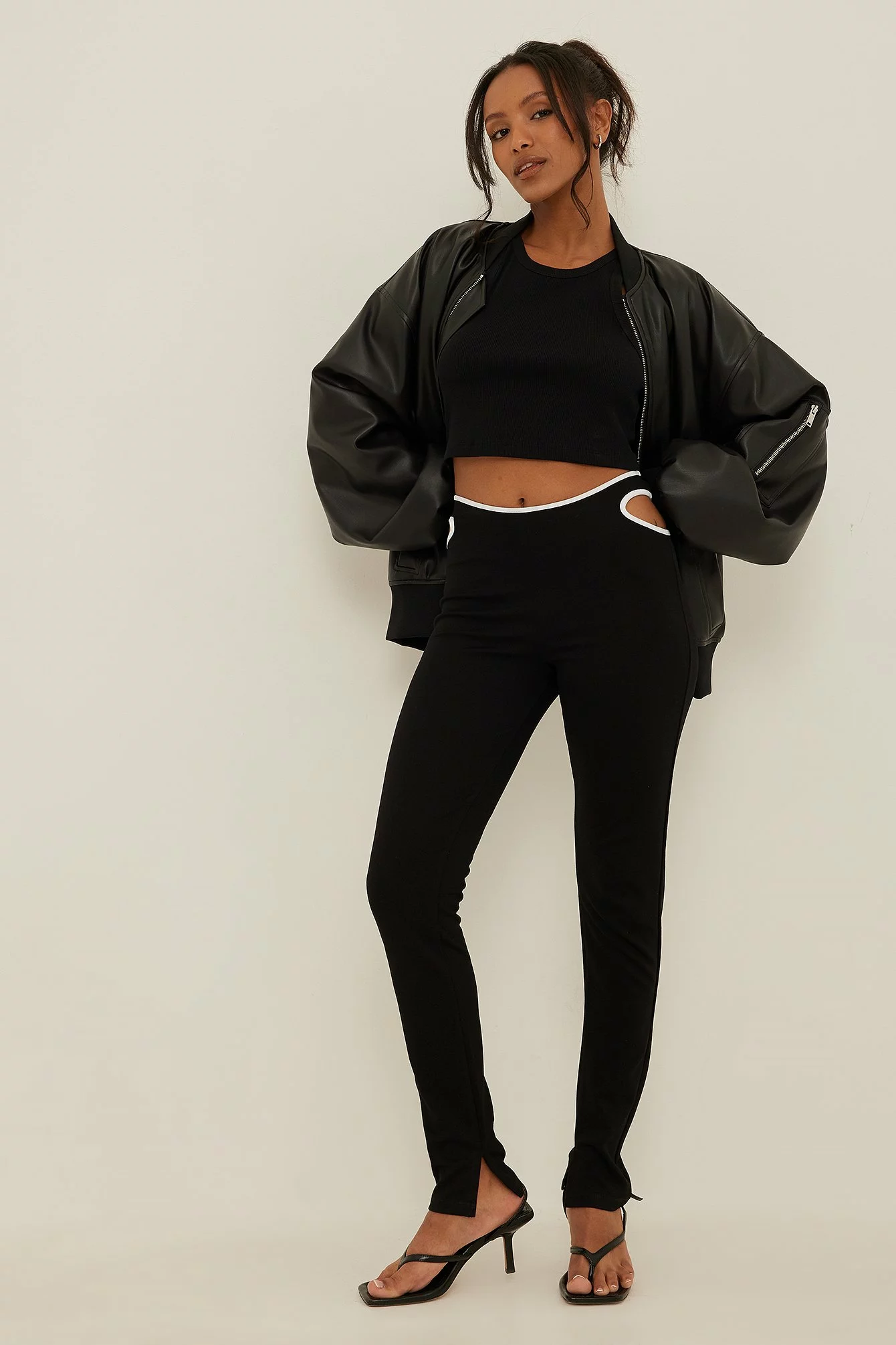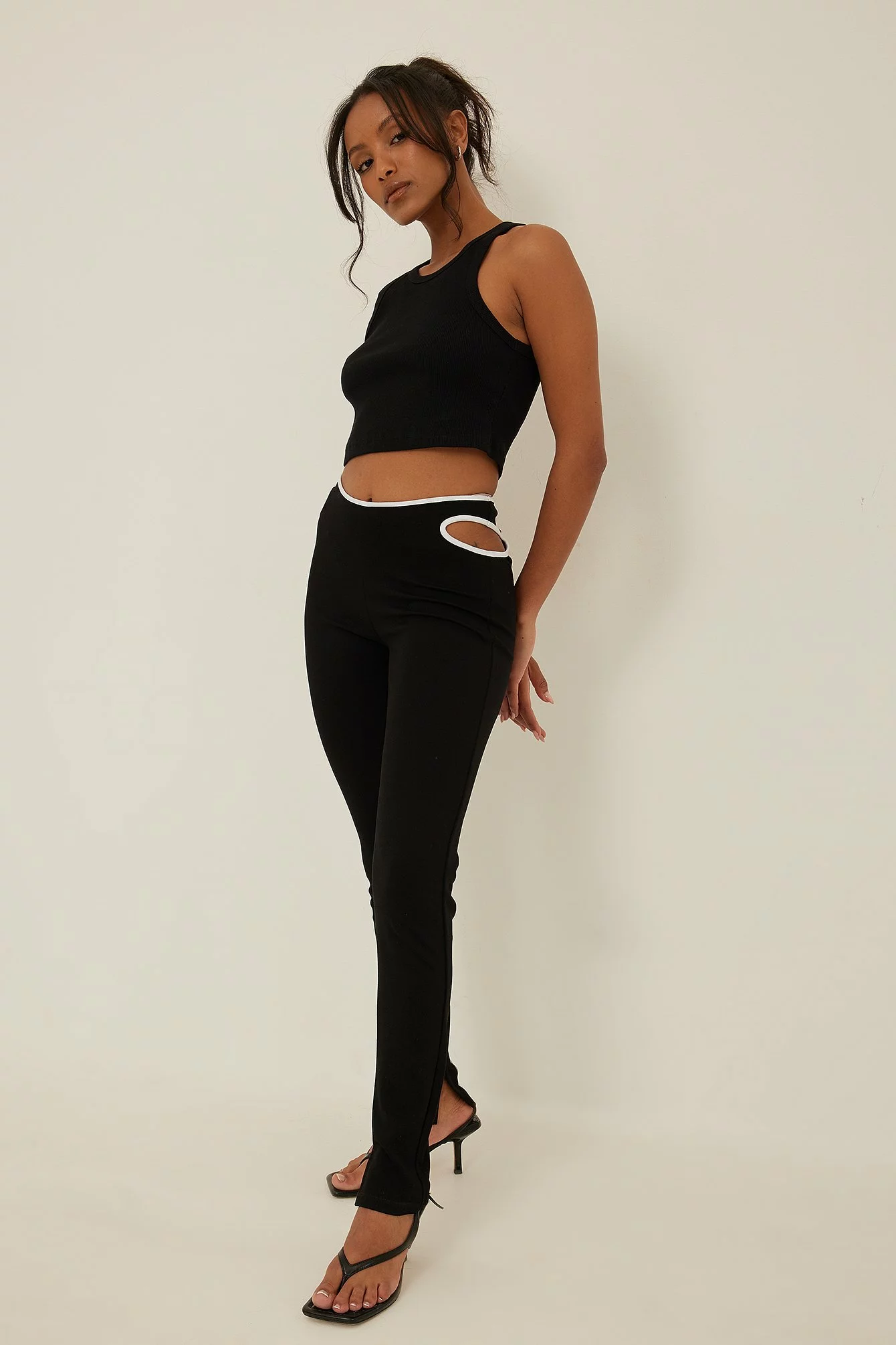 These leggings feature white hemlines on the waist, cut out details on the hip and an ankle slit.