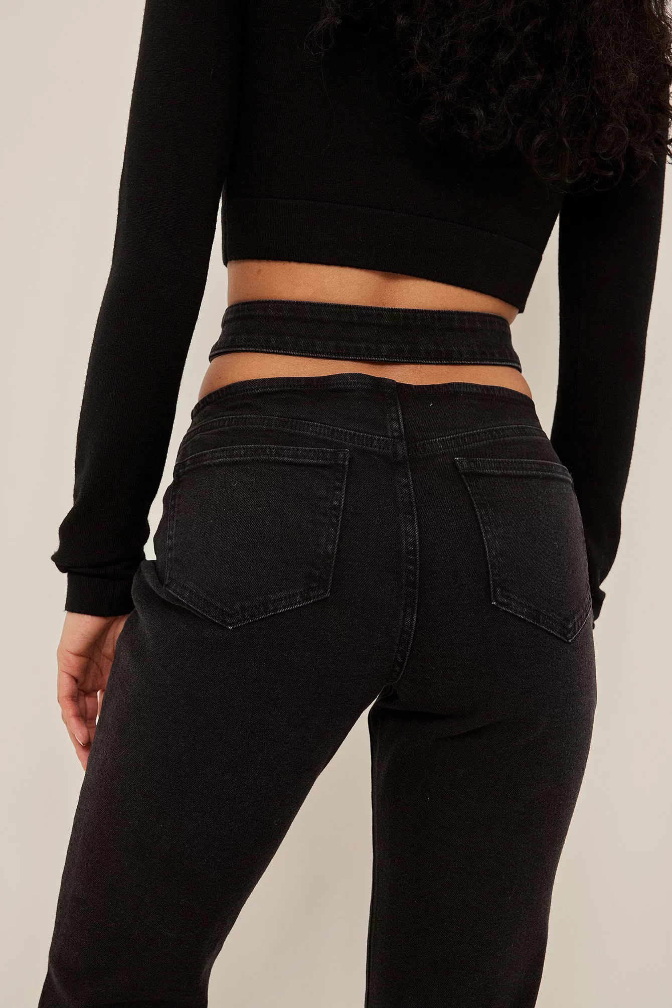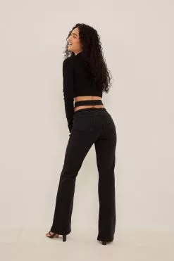 These jeans are boot cut and stretchy and feature a high waist with a cut out detail. They have a zip and button closure and two back pockets.