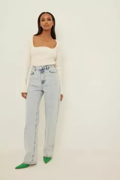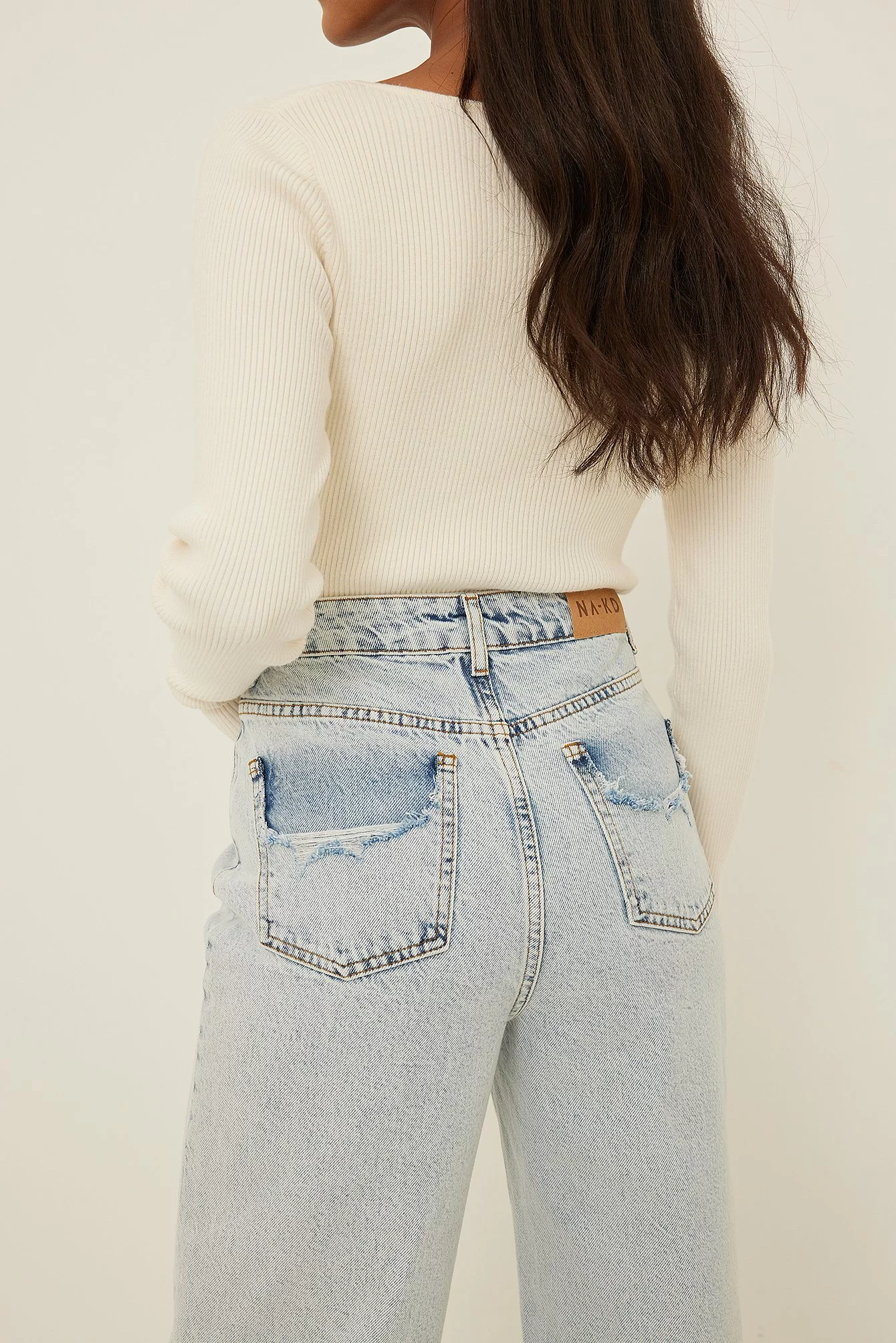 These jeans feature five-pocket designs, distressed pockets on the back, a button closure, a belt loop and a straight leg.