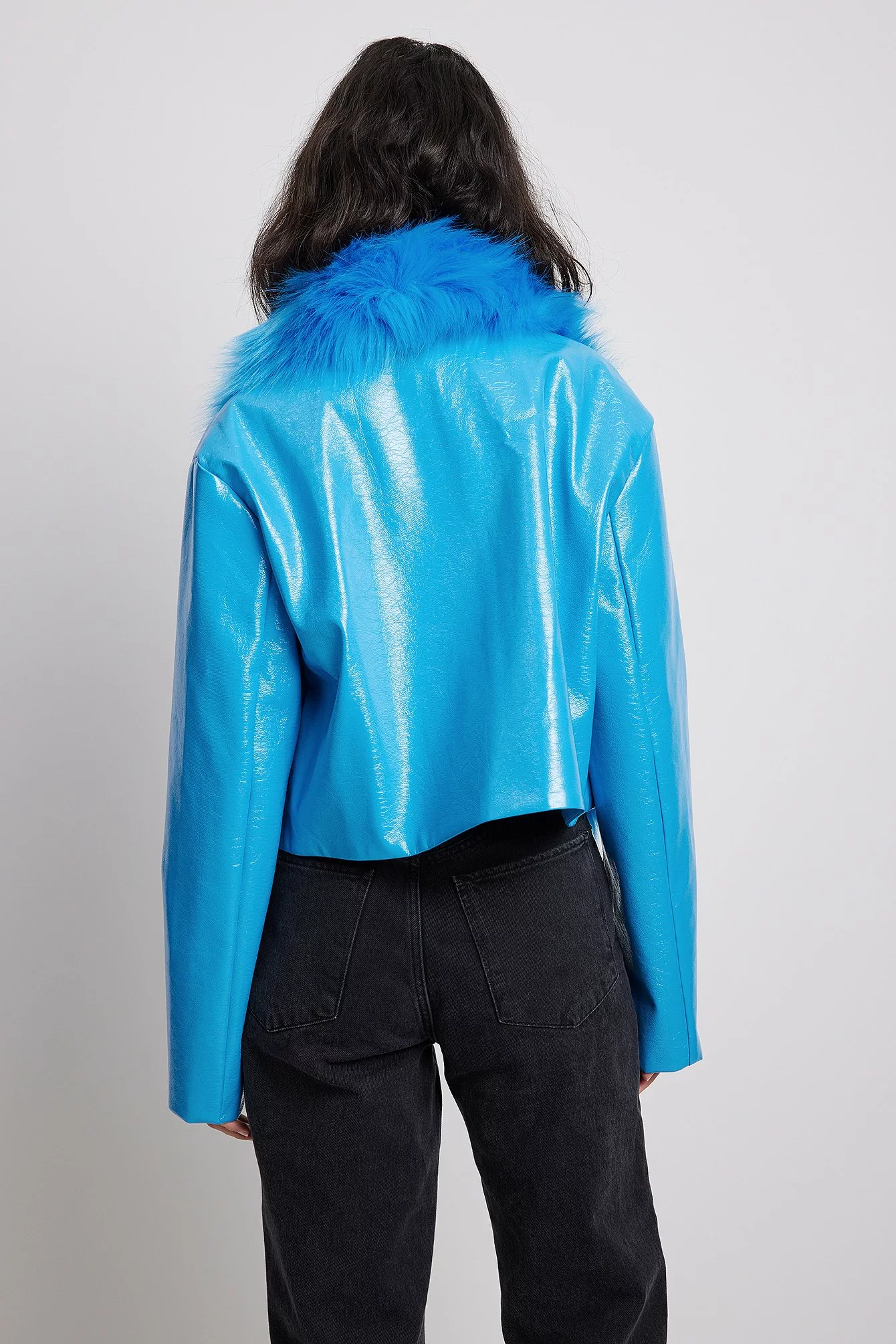 This jacket features a cropped design, a collar with a faux fur detail, side pockets and a hook and eye fastening.