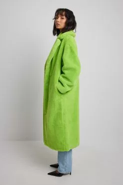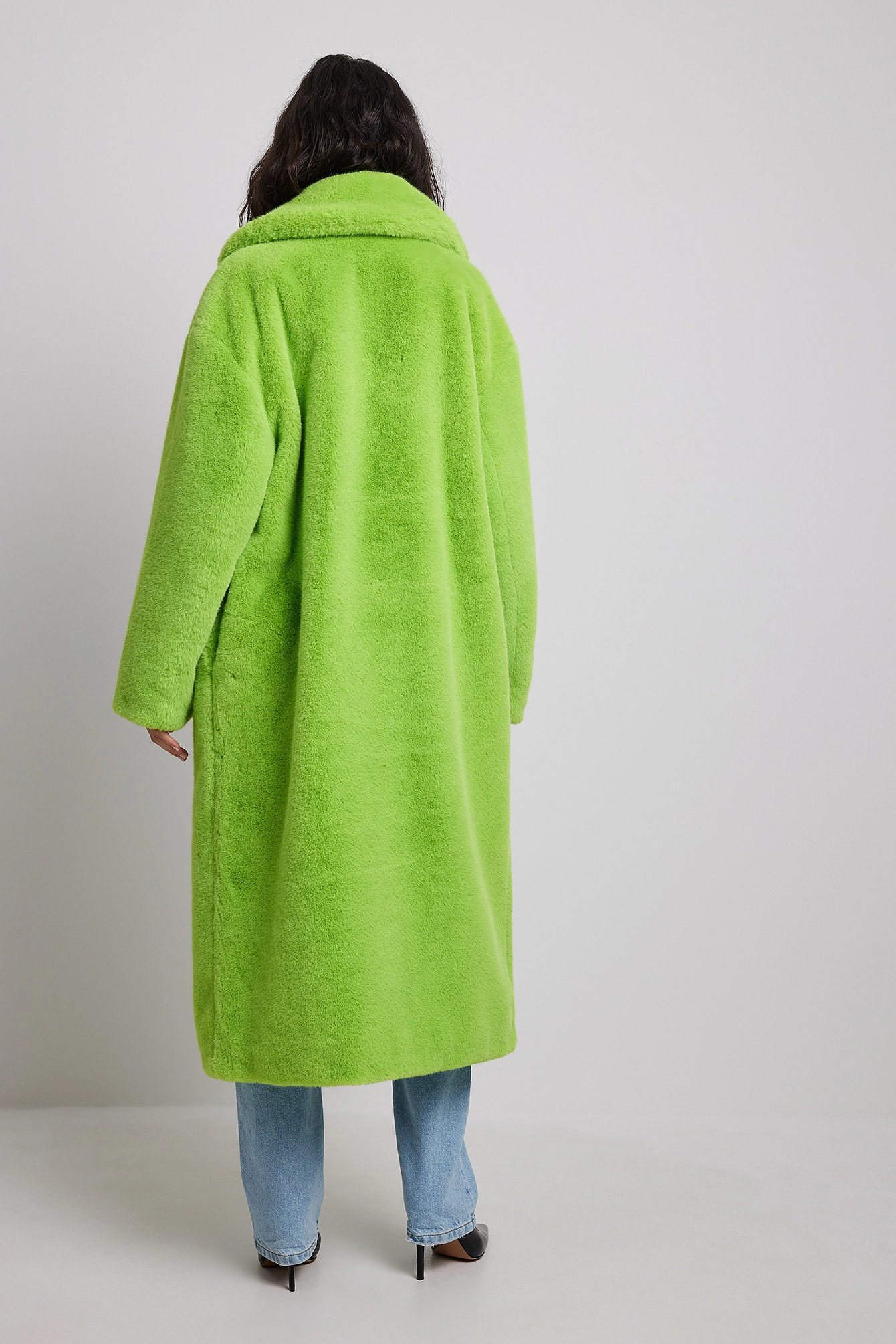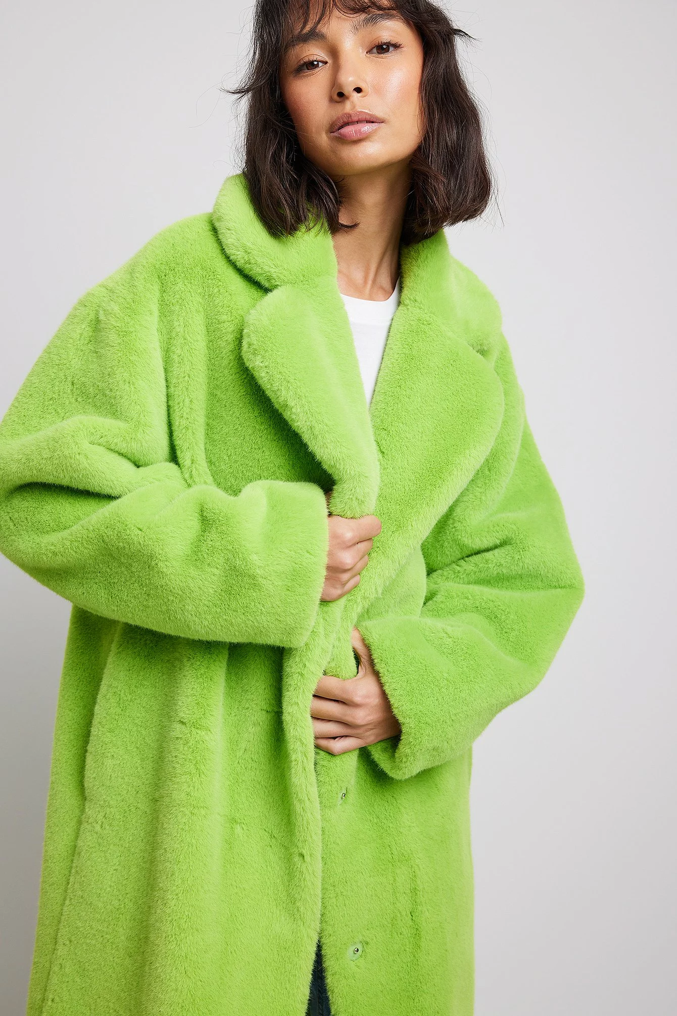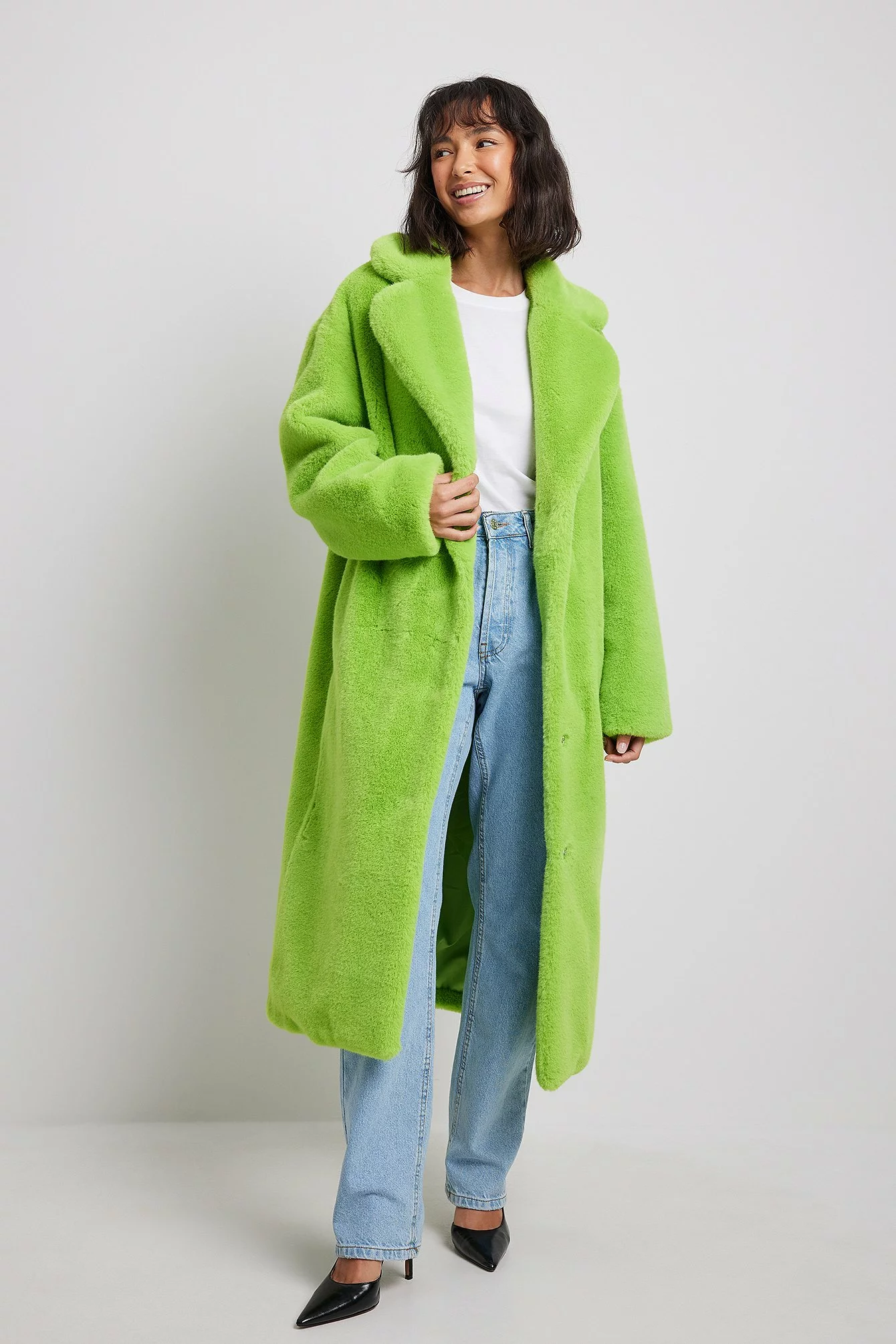 This coat features a maxi length, a faux fur, a snap button closure and side pockets.