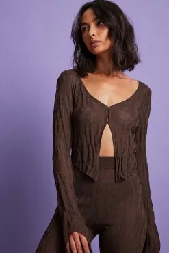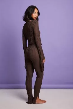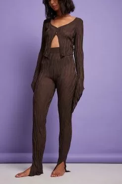 These trousers feature a high waist with an elasticated band, a slim leg with ankle slits and a textured, seethrough material.