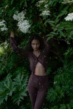 These trousers feature a high waist with an elasticated band, a slim leg with ankle slits and a textured, seethrough material.